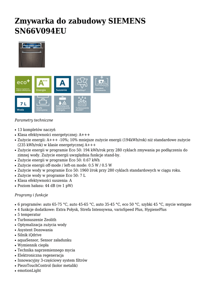 Zmywarka do zabudowy SIEMENS SN66V094EU
