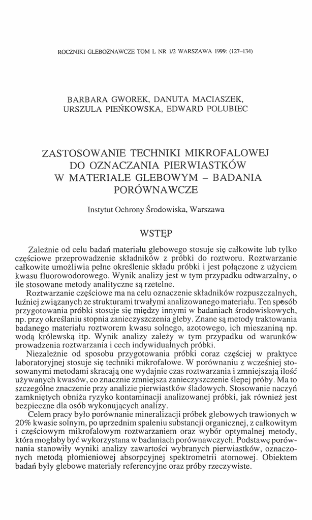 ROCZNIKI GLEBOZNAWCZE TOM L NR 1/2 WARSZAWA 1999: (127-134) BARBARA GWOREK, DANUTA MACIASZEK, URSZULA PIEŃKOWSKA, EDWARD POLUBIEC ZA ST O SO W A N IE TECH N IK I M IK R O FA LO W EJ DO O ZN A C ZA N IA PIER W IA STK Ó W W M A TER IA LE G LEBO W Y M - BA D A N IA PO RÓ W N A W CZE Instytut Ochrony Środowiska, Warszawa WSTĘP Zależnie od celu badań materiału glebowego stosuje się całkowite lub tylko częściowe przeprowadzenie składników z próbki do roztworu. Roztwarzanie całkowite umożliwia pełne określenie składu próbki i jest połączone z użyciem kwasu fluorowodorowego. Wynik analizy jest w tym przypadku odtwarzalny, o ile stosowane metody analityczne są rzetelne. Roztwarzanie częściowe ma na celu oznaczenie składników rozpuszczalnych, luźniej związanych ze strukturami trwałymi analizowanego materiału. Ten sposób przygotowania próbki stosuje się między innymi w badaniach środowiskowych, np. przy określaniu stopnia zanieczyszczenia gleby. Znane są metody traktowania badanego materiału roztworem kwasu solnego, azotowego, ich mieszaniną np. wodą królewską itp. Wynik analizy zależy w tym przypadku od warunków prowadzenia roztwarzania i cech indywidualnych próbki. Niezależnie od sposobu przygotowania próbki coraz częściej w praktyce laboratoryjnej stosuje się techniki mikrofalowe. W porównaniu z wcześniej sto sowanymi metodami skracają one wydajnie czas roztwarzania i zmniejszają ilość używanych kwasów, co znacznie zmniejsza zanieczyszczenie ślepej próby. Ma to szczególne znaczenie przy analizie pierwiastków śladowych. Stosowanie naczyń zamkniętych obniża ryzyko kontaminacji analizowanej próbki, jak również jest bezpieczne dla osób wykonujących analizy. Celem pracy było porównanie mineralizacji próbek glebowych trawionych w 20% kwasie solnym, po uprzednim spaleniu substancji organicznej, z całkowitym i częściowym mikrofalowym roztwarzaniem oraz wybór optymalnej metody, która mogłaby być wykorzystana w badaniach porównawczych. Podstawę porów nania stanowiły wyniki analizy zawartości wybranych pierwiastków, oznaczo nych metodą płomieniowej absorpcyjnej spektrometrii atomowej. Obiektem badań były glebowe materiały referencyjne oraz próby rzeczywiste. 128 В. Gworek, D. Maciaszek , U. Pieńkowska , £. Polubiec MATERIAŁ I METODY BADAŃ Materiałem referencyjnym do badań były certyfikowane wzorce glebowe: e SRM 2711 Montana Soil - National Institut of Standards & Technology USA, S-l Gleba - Instytut Fizyki i Techniki Jądrowej AGH Kraków, • GP-2 Gleba - Polskie Towarzystwo Gleboznawcze oraz rzeczywiste próby glebowe, które dobrano kierując się zróżnicowaniem pod względem ich właściwości genetycznych, uziarnienia, sposobu użytkowania, a także zawartości badanych pierwiastków. Rzeczywiste próbki glebowe pobrano z poziomów genetycznych profilów glebowych usytuowanych w północnowschodniej części Polski w rejonie Stacji Kompleksowego Monitoringu Środo wiska, Puszcza Borecka oraz Górnośląskiego Okręgu Przemysłowego. Pozwoliło to na porównanie metod w szerokim zakresie stężeń oznaczanych składników. Metody Przeprowadzenie składników do roztworu wykonano metodą klasyczną (K), usuwając matrycę organiczną podczas spalania, a następnie trawiąc pozostałość kwasem solnym. Całkowite roztwarzanie mikrofalowe (M*) przeprowadzono stosując mieszaninę kwasów: azotowy + solny + fluorowodorowy. Wykonano także częściowe mikrofalowe roztwarzanie (M) z użyciem kwasu azotowego. Aparatura Mikrofalowy system przygotowania próbek MDS 2000 f-my СЕМ o mocy generatora mikrofalowego 630 W 50, wyposażony w niskociśnieniowe naczy nia typu ACV-13,8 bar oraz system kontroli przeznaczony do monitorowania i regulacji warunków ciśnienia wewnątrz naczynia; Spektrometr absorpcji atomowej AAS-30 f-my C. Zeiss-Jenoptik wyposa żony w: - lampy pierwiastkowe z katodą wnękową HCL (Hollow Cathode Lamp) NA RVA i PHOTRON SUPER, - atomizer płomieniowy UNICAM SP 9 z mechanizmem śrubowym UNICAM SABA do regulowania odległości kulki rozpryskowej od wylotu nebulizera, palniki: 5, 10 i 5 cm powlekany, - nasadkę kwarcową szczelinową STAT (Slotted Tube Atom Trap) do zagęsz czania populacji atomów w strefie pomiarowej, - układ dwu rurek kapilarnych polietylenowych połączonych łącznikiem w kształcie "Y" do podawania bufom spektralnego jednocześnie z roztworem badanym oraz - deuterowy korektor tła. Stosowano wyłącznie polietylenowe naczynia laboratoryjne. W arunki przebiegu mineralizacji Mineralizację materiału glebowego metodą klasyczną (K) wykonano w nastę pujący sposób: 1 g próbki powietrznie suchej (uprzednio roztartej w moździerzu agatowym) spalano w temp. 500°C przez 5 godz., następnie pozostałość trawiono z 15 ml 20% kwasu solnego przez 30 min. Całość przenoszono na sączki i przemywano wodą do objętości 50 ml. Zastosowanie techniki mikrofalowej do oznaczania _____ pierwiastków^ w materiale glebowym _____ /29 Całkowite roztwarzanie mikrofalowe (M*) próbek glebowych wykonano sto sując 0,5 g odważkę oraz 10 ml H20 , 5 ml H N 0 3, 4 ml HF i 1 ml HC1. Proces prowadzono według jednofazowego programu: 100 m oc [%] ciśn ien ie [ps] czas [min] czas utrzym yw ania [min] w ydajność w entylatora [%] 120 30:00 20:00 100 Po zakończonym procesie do każdego naczynia dodawano około 2 g H3B 0 3 w postaci krystalicznej lub rozpuszczonej w celu usunięcia nadmiaru HF. Roztwory przenoszono do kolb miarowych o objętości 50 ml. Oprócz całkowitego roztwarzania materiału glebowego wykonano mikrofalo we roztwarzanie częściowe z użyciem kwasu azotowego (dodawano po 7 ml H20 i stęż. H N 0 3), stosując taką samą odważkę jak w całkowitym roztwarzaniu i taki sam program. W roztworach oznaczono zawartość żelaza, magnezu, manganu, cynku, miedzi i ołowiu techniką płomieniowej absorpcyjnej spektrometrii atomowej. Parametry stosowane w pomiarach zest