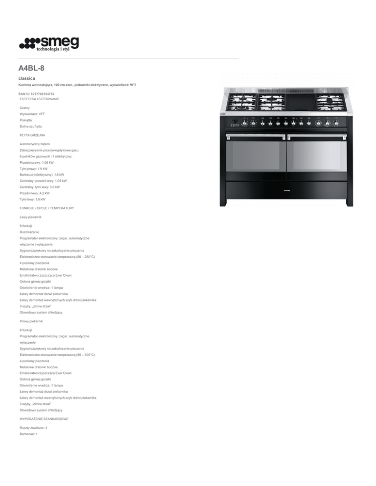 A4BL-8 classica Kuchnia wolnostojąca, 120 cm szer., piekarniki elektryczne, wyświetlacz: VFT EAN13: 8017709154752 ESTETYKA I STEROWANIE Czarny Wyświetlacz: VFT Pokrętła Dolna szuflada PŁYTA GRZEJNA Automatyczny zapłon Zabezpieczenie przeciwwypływowe gazu 6 palników gazowych i 1 elektryczny: Przedni prawy: 1,05 kW Tylni prawy: 1,9 kW Barbecue (elektryczny): 1,6 kW Centralny, przedni lewy: 1,05 kW Centralny, tylni lewy: 3,0 kW Przedni lewy: 4,2 kW Tylni lewy: 1,8 kW FUNKCJE / OPCJE / TEMPERATURY Lewy piekarnik 9 funkcji Rozmrażanie Programator elektroniczny: zegar, automatyczne włączenie i wyłączenie Sygnał dźwiękowy na zakończenie pieczenia Elektroniczne sterowanie temperaturą (50 – 250°C) 4 poziomy pieczenia Metalowe drabinki boczne Emalia łatwoczyszcząca Ever Clean Osłona górnej grzałki Oświetlenie wnętrza: 1 lampa Łatwy demontaż drzwi piekarnika Łatwy demontaż wewnętrznych szyb drzwi piekarnika 3 szyby, „zimne drzwi” Obwodowy system chłodzący Prawy piekarnik 6 funkcji Programator elektroniczny: zegar, automatyczne wyłączenie Sygnał dźwiękowy na zakończenie pieczenia Elektroniczne sterowanie temperaturą (50 – 300°C) 4 poziomy pieczenia Metalowe drabinki boczne Emalia łatwoczyszcząca Ever Clean Osłona górnej grzałki Oświetlenie wnętrza: 1 lampa Łatwy demontaż drzwi piekarnika Łatwy demontaż wewnętrznych szyb drzwi piekarnika 3 szyby, „zimne drzwi” Obwodowy system chłodzący WYPOSAŻENIE STANDARDOWE Ruszty żewliwne: 3 Barbecue: 1 Dysze do gazu G30 Głęboka blacha (40 mm): 2 - lewy piekarnik / 1 - prawy piekarnik Ruszt do grilla: 1 - lewy piekarnik / 1 - prawy piekarnik Ruszt: 2 - lewy piekarnik / 1 - prawy piekarnik Prowadnice teleskopowe z częściowym wysuwem: 1 – lewy piekarnik Panele katalityczne: 3 - lewy piekarnik / 3 - prawy piekarnik Rożen: 1 - lewy piekarnik Akcesoria „Pizza”: 1 - prawy piekarnik SPECYFIKACJA TECHNICZNA Moc przyłączeniowa: 7,5 kW Moc grilla: 2,7 kW Napięcie: 220-240 V Zabezpieczenie: 33 A Częstotliwość: 50/60 Hz Functions Piekarnik główny Piekarnik dodatkowy Wersje A4-8 - Wersja inox Smeg Polska Sp. z o.o. ul. Cybernetyki 9 02-677 Warszawa Tel. +48 22 276 14 00 A4BL-8 classica kuchnia wolnostojąca Opera 120 cm czarny rodzaj płyty kuchennej: gazowo-elektryczna rodzaj piekarnika: elektryczny klasa energochłonności A Piekarnik główny Klasa A: Klasa A piekarnika zapewnia niskie zużycie energii. WEWNĘTRZNA OBJĘTOŚĆ: Komora kuchni wolnostojącej 63 l (brutto is 68 l) CHŁODNE DRZWI: Większość piekarników firmy SMEG posiada “chłodne drzwi”. Dzięki połączeniu systemu obwodowego chłodzenia i wewnętrznym szybom odbijającym ciepło, temperatura zewnętrznej powierzchni drzwi jest utrzymywana poniżej 50 ° C. Dodatkowo system ten chroni meble będące w kontakcie z piekarnikiem przed przegrzewaniem. POZIOMY PIEKARNIKA: Kuchnie wolnostojące posiadają 4 poziomy pieczenia, co pozwala na pieczenie kilku potraw jednocześnie. OSŁONA GÓRNEJ GRZAŁKI: Rozwiązanie to chroni górną część piekarnika przed zanieczyszczeniem. Element chroniący jest łatwy w demontażu i może być myty w zmywarce. POTRÓJNIE OSZKLONE DRZWI: Zewnętrzna powierzchnia nawet podczas długiego pieczenia pozostaje zimna, co zapewnia maksymalne bezpieczeństwo użytkowania. Natomiast dwie wewnętrzne szyby odbijają ciepło, co ma znaczenie dla efektywności używanej energii. DEMONTOWALNE SZKŁO WEWNĘTRZNE: W większości piekarników firmy SMEG szkło wewnątrz drzwi jest łatwe w demontażu, co również znacznie ułatwia utrzymanie w czystości urządzenia. JEDNOLITE SZKŁO WEWNĘTRZNE: W większości piekarników firmy SMEG zainstalowane w drzwiach szkło wewnętrzne posiada wyjątkowo gładką powierzchnię, bez żadnych wkrętów, co znacznie ułatwia utrzymanie w czystości urządzenia. EMALIA ŁATWOCZYSZCZĄCA EVER CLEAN: Emalia, którą jest pokryte wnętrze piekarników. Jest niezwykle łatwa w czyszczeniu, ze względu na znikomą interakcję z tłuszczami i odporność na różne kwasy. STATYCZNY SYSTEM CHŁODZENIA: Innowacyjny STATYCZNY system chłodzenia pomaga chronić meble od nadmiernej temperatury podczas pracy urządzenia. GRZAŁKA GÓRNA I DOLNA: Włączenie tych 2 grzałek stosuje się w pieczeniu tradycyjnym, odpowiednim do przygotowanie potraw wymagających delikatnego podgrzewania, jak np. pieczenie ciasta. Piekarnik powinien zostać wstępnie nagrzany do wymaganej temperatury, a naczynie ustawione po środku. Jest to metoda , która najlepiej sprawdza się w przypadku większych, pojedynczych wypieków. WENTYLATOR, GRZAŁKA GÓRNA I DOLNA: Grzałki w połączeniu z wentylatorem zapewniają równomierną temperaturę w całej komorze. Jest to metoda dająca podobne efekty do pieczenia tradycyjnego. Mniej wydajna od użycia wentylatora i 3 grzalek. Najlepsza do wypieku ciast. GRZAŁKA GRILLA: Funkcja uzywana do szybkiego podgrzewania. Aby uzyskać najlepsze rezultaty należy małe potrawy umieścić na górnej półce, a potrawy większe - na dolnej (np. mięso, lub kiełbasę). Najlepsze efekty uzyskuje się przy zamkniętych drzwiczkach, chyba że przepis podpowiada co innego. WENTYLATOR I GRZAŁKA GRILLA: Pieczenie przy uzyciu tej funkcji musi przebiegać przy zamkniętych drzwiczkach. Wentylator łagodzi silne grzanie grilla, jednocześnie zapewniając doskonałe grillowanie bez potrzeby odwracania pieczonej potrawy. Otrzymujemy potrawę doskonale przypieczoną, a zarazem soczystą. Najlepsze efekty zapewnia pieczenie na dwóch górnych półkach. Dolna część piekarnika może być w tym czasie wykorzystana do podgrzania innych potraw. WENTYLATOR, GRZAŁKA DOLNA: Dodanie dolnej grzałki do wymuszonego obiegu podnosi temperaturę w dolnej części potrawy, zapewniając jej skuteczniejsze pieczenie środka bez przypiekania powierzchni. WENTYLATOR, GRZAŁKA PIERŚCIENIOWA I DOLNA: Dodanie grzałki dolnej powoduje dostarczenie dodatkowego ciepła do spodu potrawy ni