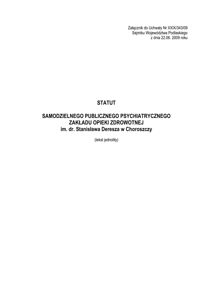 Załącznik do Uchwały Nr XXIX/343/09 Sejmiku Województwa Podlaskiego z dnia 22.06. 2009 roku STATUT SAMODZIELNEGO PUBLICZNEGO PSYCHIATRYCZNEGO ZAKŁADU OPIEKI ZDROWOTNEJ im. dr. Stanisława Deresza w Choroszczy (tekst jednolity) Rozdział I Postanowienia ogólne §1 Samodzielny Publiczny Psychiatryczny Zakład Opieki Zdrowotnej im. dr. Stanisława Deresza w Choroszczy zwany dalej Zakładem jest samodzielnym publicznym zakładem opieki zdrowotnej posiadającym osobowość prawną, pokrywającym z własnych środków i uzyskiwanych przychodów koszty działalności i zobowiązania. §2 1. Województwo Podlaskie wykonuje uprawnienia organu, który utworzył Zakład. §3 1. Obszar działania Zakładu obejmuje województwo podlaskie, a w razie potrzeby może obejmować pacjentów spoza granic województwa, w tym cudzoziemców. 2. Zakład używa nazwy skróconej „Szpital Psychiatryczny w Choroszczy”. 3. Siedziba Zakładu znajduje się w Choroszczy, Pl. Z. Brodowicza 1. §4 Zakład działa na podstawie: 1) ustawy z dnia 30 sierpnia 1991 roku o zakładach opieki zdrowotnej (tekst jednolity Dz. U. z 2007 roku Nr 14 poz. 89 z późn. zm.) zwanej w dalszej części Statutu Ustawą, 2) ustawy z dnia 19 sierpnia 1994 roku o ochronie zdrowia psychicznego (Dz. U. z 1994 roku Nr 111, poz. 535 z późn. zm.), 3) ustawy z dnia 27 sierpnia 2004 roku o świadczeniach opieki zdrowotnej finansowanych ze środków publicznych (tekst jednolity Dz. U. z 2008 roku Nr 164, poz. 1027 z późn. zm.), 4) ustawy z dnia 30 czerwca 2005 r. o finansach publicznych (Dz. U. z 2005 roku Nr 249, poz. 2104 z późn. zm.), 5) ustawy z dnia 29 stycznia 2004 roku Prawo zamówień publicznych (tekst jednolity Dz. U. z 2007 roku Nr 223, poz. 1655 z późn. zm.), 6) ustawy z dnia 29 września 1994 r. o rachunkowości (tekst jednolity Dz. U. z 2002 roku Nr 76, poz. 694 z późn. zm.), 7) innych aktów prawnych, 8) niniejszego Statutu. Rozdział II Przedmiot działania Zakładu §5 1. Do podstawowych zadań Zakładu należy udzielanie świadczeń w zakresie opieki specjalistycznej stacjonarnej, pośredniej i ambulatoryjnej oraz diagnostyki. 2. Do zadań Zakładu należy w szczególności: 1) w zakresie opieki stacjonarnej – udzielanie świadczeń z zakresu: psychiatrii, leczenia uzależnień, neurologii, chorób wewnętrznych – chorym wymagającym hospitalizacji, 2) 3) 4) 5) 6) 7) 8) 9) 10) 11) 12) w zakresie opieki pośredniej – udzielanie świadczeń psychiatrycznych i leczenia uzależnień w trybie oddziałów dziennych oraz świadczeń psychiatrycznych w trybie opieki domowej i leczenia środowiskowego, w zakresie opieki ambulatoryjnej – udzielanie świadczeń profilaktyczno – leczniczych, psychiatrycznych, neurologicznych oraz dla osób uzależnionych i ich rodzin, w zakresie diagnostyki – wykonywanie badań na rzecz leczonych chorych, oraz dla pacjentów kierowanych na badania z innych ośrodków, szkolenie personelu medycznego, psychologicznego i terapeutycznego, współudział w organizowaniu pomocy społecznej dla osób leczonych w Zakładzie, prowadzenie zajęć opiekuńczo - wychowawczych w oddziale psychiatrii dziecięcej, udzielanie świadczeń zdrowotnych z zakresu podstawowej opieki zdrowotnej, realizowanie zadań związanych z wykorzystaniem publicznej i niepublicznej służby zdrowia na potrzeby obronne państwa, prowadzenie badań klinicznych produktów leczniczych, orzekanie i opiniowanie o stanie zdrowia psychicznego, promocja zdrowia, w tym psychicznego. Rozdział III Organizacja i zarządzanie §6 1. Dyrektor Zakładu kieruje jego działalnością i reprezentuje go na zewnątrz. 2. Dyrektora powołuje i odwołuje Zarząd Województwa Podlaskiego. 3. Dyrektor podejmuje samodzielnie decyzje dotyczące funkcjonowania Zakładu i ponosi za nie odpowiedzialność. 4. Dyrektor jest pracodawcą pracowników w rozumieniu przepisów Kodeksu pracy. §7 1. W skład Zakładu wchodzą jednostki organizacyjne: 1) Szpital, 2) Podlaskie Centrum Leczenia Padaczek, 3) Centrum Zdrowia Psychicznego Białystok Południe, 4) Centrum Zdrowia Psychicznego Białystok Północ, 5) Centrum Leczenia Uzależnień, 6) Centrum Zdrowia Psychicznego Choroszcz, 7) Apteka Zakładowa. 2. W skład Zakładu wchodzą komórki organizacyjne: 1) Dział Statystyki i Dokumentacji Chorych, 2) Dział Ekonomiczno – Finansowy, 3) Dział Techniczno – Gospodarczy, 4) Dział Dietetyki i Żywienia, 5) Dział Zatrudnienia z sekcją Płac, 6) Dział Organizacyjny i Zamówień Publicznych. 3. W skład Zakładu wchodzą samodzielne stanowiska pracy: 1) Naczelnej Pielęgniarki, 2) Epidemiologa, 3) 4) 5) 6) 7) 8) 9) Służba BHP, Inspektora Ochrony Przeciwpożarowej, Pełnomocnika ds. Obronnych i Ochrony Informacji Niejawnych, Radcy Prawnego, Specjalisty ds. Inwestycji i Remontów, Pełnomocnika Dyrektora ds. Systemu Zarządzania Jakością, Informatyka. 4. W Zakładzie działa Komitet ds. Jakości jako organ wspomagający zarządzanie Zakładem. 5. Struktura organizacyjna Zakładu w formie graficznej stanowi załącznik nr 1 do Statutu. 6. Organizację i zadania poszczególnych jednostek, komórek organizacyjnych i samodzielnych stanowisk pracy, w tym warunki współdziałania między nimi oraz zakresy czynności pracowników określa Regulamin Porządkowy ustalany przez Dyrektora i zatwierdzony przez Radę Społeczną Zakładu. Rozdział IV Gospodarka finansowa §8 1. Podstawą gospodarki finansowej Zakładu jest roczny plan finansowy ustalany przez Dyrektora. 2. Plan finansowy i sprawozdanie z jego realizacji opiniuje Rada Społeczna Zakładu. §9 1. Zakład prowadzi rachunkowość na zasadach określonych w ustawie o rachunkowości, ustawie o zakładach opieki zdrowotnej i innych przepisach regulujących gospodarkę finansową samodzielnych publicznych zakładów opieki zdrowotnej. 2. Zakład może uzyskiwać środki finansowe: 1) z odpłatnych świadczeń zdrowotnych udzielanych w szczególności na zlecenie: a) odpowiednich organów uprawni