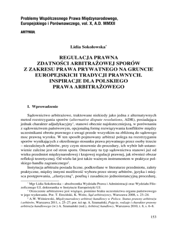 Problemy Współczesnego Prawa Międzynarodowego, Europejskiego i Porównawczego, vol. X, A.D. MMXII ARTYKUŁ Lidia Sokołowska* REGULACJA PRAWNA ZDATNOŚCI ARBITRAŻOWEJ SPORÓW Z ZAKRESU PRAWA PRYWATNEGO NA GRUNCIE EUROPEJSKICH TRADYCJI PRAWNYCH. INSPIRACJE DLA POLSKIEGO PRAWA ARBITRAŻOWEGO I. Wprowadzenie Sądownictwo arbitrażowe, traktowane niekiedy jako jedna z alternatywnych metod rozstrzygania sporów (alternative dispute resolutions, ADR), posiadająca jednak charakter adjudykacyjny1, stanowi obecnie najskuteczniejszą, w porównaniu z sądownictwem państwowym, opcjonalną formę rozwiązywania konfliktów między uczestnikami obrotu prawnego z uwagi przede wszystkim na zbliżoną do sądowego moc prawną wyroku. W ten sposób pojmowany arbitraż polega na rozstrzyganiu sporów wynikających z określonego stosunku prawa prywatnego przez osoby trzecie – niezależnych arbitrów, przy czym stosownie do procedury, ich wybór lub ustanowienie zależne jest od stron sporu. Omawiany tu typ sądownictwa stanowi już od wieku przedmiot międzynarodowej i krajowej regulacji prawnej, jak również obszar refleksji teoretycznej. Od wielu lat jest także ważnym instrumentem w praktyce polskiego handlu zagranicznego2. Instytucja arbitrażu posiada liczne, podkreślane w literaturze przedmiotu, zalety praktyczne, między innymi możliwość wyboru przez strony arbitrów, języka i miejsca postępowania, „elastyczną”, poufną i zasadniczo jednoinstancyjną procedurę, * Mgr Lidia Sokołowska – absolwentka Wydziału Prawa i Administracji oraz Wydziału Filozoficznego UJ, doktorantka w Instytucie Europeistyki UJ. 1 Orzeczenie arbitrażowe jest wiążące, pomimo braku uczestnictwa organu państwowego w jego wydawaniu. Por. T. Ereciński, K. Weitz, Sąd arbitrażowy, Warszawa 2008, s. 23–24. 2 A.W. Wiśniewski, Międzynarodowy arbitraż handlowy w Polsce. Status prawny arbitrażu i arbitrów, Warszawa 2011, s. 25–27; por. też np. A. Szumański, Pojęcie, rodzaje i charakter prawny arbitrażu handlowego (w:) A. Szumański (red.), Arbitraż handlowy, Warszawa 2010, t. 8, s. 6–8. 153 szybkość procedowania – a więc w sensie funkcjonalnym – oszczędność kosztów, fachowość arbitrów oraz orzekanie zgodnie z zasadą słuszności. Instytucja ta jest stosowana przede wszystkim przy rozstrzyganiu sporów z zakresu szeroko rozumianego obrotu gospodarczego, zarówno na gruncie krajowym (arbitraż handlowy), jak i międzynarodowym (międzynarodowy arbitraż handlowy)3. Niezwykle istotnym wymiarem arbitrażu jest jego kontraktowość – opiera się on na zgodnym akcie woli stron, którego wyrazem jest umowa zakładająca (najczęściej milcząco) zobowiązanie do stosownego współdziałania z arbitrem oraz do dobrowolnego wykonania jego wyroku, będące wyrazem świadomej postawy dążenia do profesjonalnego i konstruktywnego rozwiązania problemu4. W kontekście wysokich wymogów dotyczących szybkości transakcji ekonomicznych na rynku światowym i europejskim oraz specyfiki stosunków handlowych, wymagającej elastyczności uczestników obrotu gospodarczego, powyższe cechy arbitrażu powodują stale wzrastającą popularność tego sposobu rozwiązywania sporów wśród przedsiębiorców oraz potrzebę liberalizacji jego regulacji w obowiązujących aktach prawnych. Postulowane zmiany uregulowań rozumiane są tu przede wszystkim jako uaktualnianie, ujednolicanie i upraszczanie przepisów prawa arbitrażowego w ustawodawstwach europejskich, rozszerzanie zakresu ich stosowania oraz zwiększanie efektywności wynikających z nich rozwiązań5. II. Pojęcie zdatności arbitrażowej sporu Przy rosnącym zapotrzebowania na arbitraż handlowy w obszarze współczesnej gospodarki jednym z najistotniejszych aspektów jego regulacji prawnej, ograniczającym wolę stron poprzez możliwość powodowania nieważności zapisu, jest zdatność arbitrażowa sporu6, odpowiadająca na pytanie, „co” może być rozstrzyga3 Termin „handlowy” jest w doktrynie prawa arbitrażowego rozumiany częściej w sposób szeroki i przedmiotowy, zgodnie z tradycją romańską oznacza kwestie wynikające z wszelkich stosunków o charakterze handlowym (w odróżnieniu od tradycji germańskiej, określającej termin „handlowy” przy pomocy kryterium podmiotowego). Tak: J.D.M. Lew, L.A. Mistelis, S.M. Kroell, Comparative International Commercial Arbitration, The Hague–London–New York 2003, s. 52–53. 4 Wola stron jest elementem konstytutywnym arbitrażu, por. A. Szumański, op.cit., s. 7. 5 W okresie od stycznia do 20 października 2010 r. do Sądu Arbitrażowego przy Krajowej Izbie Gospodarczej w Warszawie wpłynęło 360 spraw. Jest to o osiem spraw więcej niż w całym 2009 r. i o sto spraw więcej niż w roku 2008; http://finanse.wnp.pl/360-spraw-wplynelo-wtym-roku-do-sadu-arbitrazowego-przy-kig,123530_1_0_0.html – link znajduje na stronie Sądu Arbitrażowego przy Krajowej Izbie Gospodarczej w Warszawie: http://www.sakig.pl. [dostępny na dzień 25.03.2012 r.]. O ile jednak krajowy arbitraż handlowy może być traktowany jako alternatywa dla sądownictwa powszechnego, o tyle bezkonkurencyjność arbitrażu rozstrzygającego spory o charakterze międzynarodowym była wielokrotnie podkreślana w literaturze. Zob. A. Redfern, M. Hunter, N. Blackaby, C. Partasides, Law and Practice of International, Commercial Arbitration, London 2004, s. 26–27. 6 Pojęcie to – jako odrębne od pojęcia zdolności arbitrażowej – zostało zaproponowane w doktrynie polskiej przez A.W. Wiśniewskiego wzorem terminów obcojęzycznych (ang. arbitrability, fr. arbitrabilité, niem. objektive Schiedsfähigkeit) i wydaje się przyjmować w literaturze, zob. A.W. 154 ne polubownie, i wyłączająca pewne spory z zakresu kognicji sądu arbitrażowego. W ten sposób pojęta przedmiotowa zdatność sporu do poddania pod rozstrzygnięcie sądu prywatnego wyznacza bowiem zakres praktycznej przydatności arbitraż