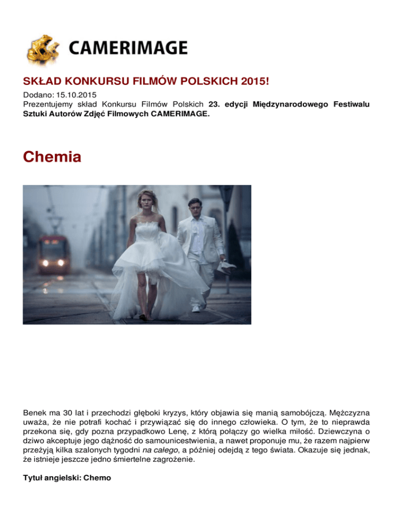 SKŁAD KONKURSU FILMÓW POLSKICH 2015! Dodano: 15.10.2015 Prezentujemy skład Konkursu Filmów Polskich 23. edycji Międzynarodowego Festiwalu Sztuki Autorów Zdjęć Filmowych CAMERIMAGE. Chemia Benek ma 30 lat i przechodzi głęboki kryzys, który objawia się manią samobójczą. Mężczyzna uważa, że nie potrafi kochać i przywiązać się do innego człowieka. O tym, że to nieprawda przekona się, gdy pozna przypadkowo Lenę, z którą połączy go wielka miłość. Dziewczyna o dziwo akceptuje jego dążność do samounicestwienia, a nawet proponuje mu, że razem najpierw przeżyją kilka szalonych tygodni na całego, a później odejdą z tego świata. Okazuje się jednak, że istnieje jeszcze jedno śmiertelne zagrożenie. Tytuł angielski: Chemo Reżyseria: Bartosz Prokopowicz Zdjęcia: Jeremiasz Prokopowicz Produkcja: Filmokracja Dystrybucja w Polsce: Vue Movie Distribution Demon Z Anglii do Polski przyjeżdża Piotr, aby poślubić piękną Żanetę. Pragnie zamieszkać z nią w domu otrzymanym od przyszłego teścia. Tymczasem w przeddzień wesela dokonuje makabrycznego odkrycia. A kiedy uroczystość się rozpocznie, zaproszeni na nią goście – wśród nich brat Piotra – spostrzegą, że z panem młodym dzieje się coś niepokojącego. W swoim ostatnim filmie tragicznie zmarły we wrześniu reżyser Marcin Wrona łączy tradycyjny w kulturze polskiej motyw wesela z wątkami metafizycznymi i mistycznymi. Tytuł angielski: Demon Reżyseria: Marcin Wrona Zdjęcia: Paweł Flis Produkcja: Magnet Man Film Dystrybucja w Polsce: Kino Świat Sp. z o. o. Hiszpanka Dobiega końca pierwsza wojna światowa. W Poznaniu, gdzie wybucha jedyny w historii Polski zwycięski zryw narodowy – Powstanie Wielkopolskie, grupa telepatów walczy o pomyślność Ignacego Jana Paderewskiego. Wielki polski pianista i patriota jest też bowiem obiektem zakusów ze strony groźnego medium na usługach armii pruskiej – doktora Abuse. Ten kostiumowy film nie jest wierną rekonstrukcją wydarzeń historycznych. Łączy fakty z fikcją, a wątki spirytystyczne splata z melodramatem i barokową wizją życia bohemy. Tytuł angielski: Influenz Reżyseria: Łukasz Barczyk Zdjęcia: Karina Kleszczewska Produkcja: Studio Filmowe Kadr Dystrybucja w Polsce: Vue Movie Distribution Intruz John wychodzi z poprawczaka pragnąc rozpocząć życie na nowo. Niestety w lokalnej społeczności, do której powraca, jego zbrodnia nie została ani zapomniana, ani wybaczona. Jego powrót wyzwala we wszystkich to, co najgorsze, atmosfera linczu wokół niego narasta. John czuje się opuszczony przez dawnych przyjaciół oraz tych, których kocha i zaczyna tracić nadzieję. Opanowuje go ta sama agresja, która niegdyś wtrąciła go do więzienia. John nie potrafiąc zostawić przeszłości za sobą, postanawia się z nią zmierzyć. Tytuł angielski: The Here After Reżyseria: Magnus von Horn Zdjęcia: Łukasz Żal Produkcja: Lava Films, Zentropa International Sweden, Cinema Defacto Dystrybucja w Polsce: Gutek Film Karbala W kwietniu 2004 roku, podczas wojny w Zatoce Perskiej, w irackim mieście Karbala szyici wspierani przez dżihadystów przypuścili atak na ratusz – City Hall – siedzibę lokalnych władz, lojalnych wobec sił stabilizacyjnych. Na rozkaz amerykańskiego dowództwa do walki w obronie obiektu przystąpiły oddziały polskie i bułgarskie. Rozpoczęła się największa bitwa, w jakiej wzięli udział żołnierze polscy po drugiej wojnie światowej. Mocny, męski film wskrzesza tamte cztery dni piekła i heroizmu, ale nie ogranicza się do batalistyki, kreśląc także psychologiczne portrety wojskowych, głównie dowodzącego obroną City Hall polskiego kapitana. Tytuł angielski: Karbala Reżyseria: Krzysztof Łukaszewicz Zdjęcia: Arkadiusz Tomiak Produkcja: Wytwórnia Filmów Dokumentalnych i Fabularnych Dystrybucja w Polsce: Next Film Letnie przesilenie Romek i Guido mają po siedemnaście lat i przed sobą całe życie. Gdyby nie okoliczności, mogliby być najlepszymi kumplami. Niestety, spotykają się w 1943 roku. Guido służy w oddziale niemieckiej żandarmerii stacjonującym na polskiej prowincji. Romek pomaga samotnej matce, pracując jako pomocnik kolejarza. Pewne zdarzenie sprawi, że drogi Guida i Romka skrzyżują się, a wojna wedrze się nagle w świat ich młodzieńczych marzeń. Tytuł angielski: Summer Solstice Reżyseria: Michał Rogalski Zdjęcia: Jerzy Zieliński Produkcja: Prasa i Film, Sunday Filmproduktion Dystrybucja w Polsce: Kino Świat Sp. z o. o. Noc Walpurgi Szwajcaria, rok 1969. Rzecz nieprzypadkowo dzieje się w nocy z 30 kwietnia na 1 maja, czyli w noc Walpurgi, uchodzącej w tradycji starogermańskiej za noc zmarłych i złych duchów. W operze dobiega końca Turandot Giacomo Pucciniego. Starzejąca się, egzaltowana diva operowa, Nora Sedler, udziela wywiadu młodemu dziennikarzowi Robertowi. Rozmowa przeradza się w grę, która zahacza o perwersję erotyczną i coraz głębiej sięga w przeszłość – do epoki nazizmu i Zagłady. Film jest rozpisaną na dwie postaci adaptacją monodramu. Tytuł oryginalny: Walpurgis Night Reżyseria: Marcin Bortkiewicz Zdjęcia: Andrzej Wojciechowski Produkcja: PS Film Dystrybucja w Polsce: Aurora Films