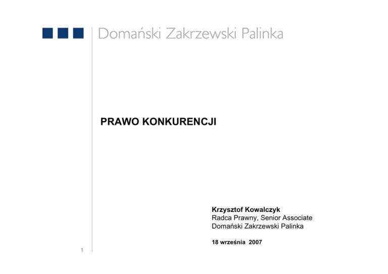 PRAWO KONKURENCJI Krzysztof Kowalczyk Radca Prawny, Senior Associate Domański Zakrzewski Palinka 18 września 2007 1 PLAN PREZENTACJI 2 Najważniejsze zmiany w polskim prawie konkurencji w 2007 roku Praktyki naruszające zbiorowe interesy konsumentów Ostatnie orzecznictwo Prezesa UOKiK NAJWAŻNIEJSZE ZMIANY W POLSKIM PRAWIE KONKURENCJI W 2007 ROKU 3 NOWA USTAWA O OCHRONIE KONKURENCJI I KONSUMENTÓW Ustawa z 16 lutego 2007 roku o ochronie konkurencji i konsumentów (obowiązuje od 21 kwietnia 2007 roku) Zmiany w stosunku do stanu dotychczasowego: możliwość wszczynania postępowań tylko z urzędu (już nie na wniosek) zamiast dotychczasowego wniosku o wszczęcie postępowania – zawiadomienie (donos) utrata statusu strony postępowania i związanych z tym uprawnień zmiany w przepisach dotyczących koncentracji przedsiębiorców (pojęcie koncentracji, progi, sposób obliczania obrotu) Możliwość nakładania kar pieniężnych za stosowanie praktyk naruszających zbiorowe interesy konsumentów Prezes UOKiK powoływany z państwowego zasobu kadrowego. 4 NOWE AKTY WYKONAWCZE DO USTAWY O OCHRONIE KONKURENCJI I KONSUMENTÓW Rozporządzenie RM w sprawie zgłoszenia zamiaru koncentracji (Dz. U. 2007, Nr 134, poz. 937) – teraz obejmuje również opłaty; wzrost opłaty na 5.000 złotych Rozporządzenie RM z 17 lipca 2007 roku w sprawie obliczania przedsiębiorców uczestniczących w koncentracji (Dz. U. 2007, Nr 134, poz. 935) Rozporządzenie RM w sprawie kontroli w toku postępowania przed Prezesem UOKiK (Dz. U. 2007, Nr 134, poz. 936) Rozporządzenie RM w sprawie trybu postępowania w przypadku wystąpienia przedsiębiorców do Prezesa UOKiK o odstąpienie od wymierzenia kary pieniężnej lub jej obniżenie (Dz. U. 2007, Nr 134, poz. 938) 2 rozporządzenia RM z 30 lipca 2007 roku w sprawie wyłączeń grupowych (transfer technologii i działalność ubezpieczeniowa) Rozporządzenie w sprawie porozumień wertykalnych wygasa 31 grudnia 2007 roku 5 ZMIANY W ZAKRESIE KONCENTRACJI Pojęcie koncentracji przepis o przekroczeniu progu 25% głosów już nie obowiązuje Nowe progi łączny światowy obrót przedsiębiorców uczestniczących w koncentracji w roku obrotowym poprzedzającym rok zgłoszenia przekracza równowartość 1.000.000.000 euro lub łączny obrót na terytorium Rzeczypospolitej Polskiej przedsiębiorców uczestniczących w koncentracji w roku obrotowym poprzedzającym rok zgłoszenia przekracza równowartość 50.000.000 euro. Utrzymanie zwolnienia dla przejęć mniejszych przedsiębiorców nie podlega zgłoszeniu zamiar koncentracji m.in., jeżeli obrót przedsiębiorcy, nad którym ma nastąpić przejęcie kontroli (...) nie przekroczył na terytorium Rzeczypospolitej Polskiej w żadnym z dwóch lat obrotowych poprzedzających zgłoszenie równowartości 10.000.000 euro. 6 ZMIANY W ZAKRESIE KONCENTRACJI – OBLICZANIE OBROTU Art. 16 ustawy: dla celów art. 13 ust. 1: obrót rozumiany jako suma obrotu grup kapitałowych, do których należą przedsiębiorcy bezpośrednio uczestniczący w koncentracji (tak, jak dotychczas) dla celów wyjątku z art. 14 pkt. 1: obrót rozumiany jako obrót przedsiębiorcy, na którym ma zostać przejęta kontrola, jak również obrót jego przedsiębiorców zależnych (nowa koncepcja, zgodna z uregulowaniami europejskimi – art. 5 ust. 2 ECMR) 7 PRAKTYKI NARUSZAJĄCE ZBIOROWE INTERESY KONSUMENTÓW 8 PRAKTYKI NARUSZAJĄCE ZBIOROWE INTERESY KONSUMENTÓW - POJĘCIE Definicja ustawowa: „praktyka naruszająca zbiorowe interesy konsumentów to godzące w nie bezprawne działanie przedsiębiorcy” (art. 24 ustawy). Przykłady: Stosowanie wzorców umów wpisanych do rejestru postanowień uznanych za niedozwolone; Naruszanie obowiązku udzielania konsumentom rzetelnej, pełnej i prawdziwej informacji; Nieuczciwa, wprowadzająca w błąd reklama, czyny nieuczciwej konkurencji. 9 PRAKTYKI NARUSZAJĄCE ZBIOROWE INTERESY KONSUMENTÓW - SKUTKI Możliwe rozstrzygnięcia Prezesa UOKiK w sprawach praktyk: Stwierdzenie praktyki i zakaz jej stosowania Stwierdzenie praktyki i jej zaniechania Kara pieniężna – do 10% przychodu (nowość w ustawie z 2007 roku) Umorzenie postępowania – w razie nie stwierdzenia praktyki Możliwość „ugody” z Prezesem UOKiK (art. 28) – decyzja o nałożeniu zobowiązań – wyłączenie możliwości ukarania 10 WZORCE UMOWNE WPISANE DO REJESTRU KLAUZUL NIEDOZWOLONYCH Uchwała SN z 13 lipca 2006 roku: „Stosowanie postanowień wzorców umów o treści tożsamej z treścią postanowień uznanych za niedozwolone prawomocnym wyrokiem SOKiK i wpisanych do rejestru może być uznane w stosunku do innego przedsiębiorcy za praktykę naruszającą zbiorowe interesy konsumentów” Przykłady klauzul wpisanych ostatnio do rejestru: „W przypadku zmiany adresu, każda ze stron zobowiązana jest niezwłocznie pisemnie powiadomić o tym drugą stronę. W przypadku nie powiadomienia o zmianie adresu, korespondencja kierowana na ostatni znany adres będzie uznawana za skutecznie doręczoną” (sygn. akt XVII AmC 43/06) – wpis z 11.VII.07. „Zmiany w Regulaminie Bank ogłasza w sposób ogólnodostępny w Placówkach terenowych Banku” (sygn. akt XVII AmC 88/06) – wpis z 20.VII.07 „W przypadku wskazania przez Kupującego innego nabywcy w swoje miejsce za zgodą Sprzedającego nastąpi przeniesienie praw na osobę wskazaną, przy potrąceniu kosztów manipulacyjnych w wysokości 2% kwot wpłaconych” ( sygn. akt XVII AmC 43/06) – wpis z 11.VII.07 11 OSTATNIE ORZECZNICTWO PREZESA UOKiK 12 OSTATNIE DECYZJE PREZESA UOKiK W SPRAWACH KONCENTRACJI Zakaz koncentracji polegającej na przejęciu przez Carey Agri kontroli nad spółką Jabłonna (rynek alkoholi; decyzja z 10 maja 2006: DOK-41/06) Warunkowa zgoda Prezesa UOKiK na dokonanie koncentracji polegającej na przejęciu przez holenderską sieć należąca do francuskiej grupy Carrefour kontroli nad polską spółką Ahold pod warunkiem zbycia dziewięciu supermarketów i