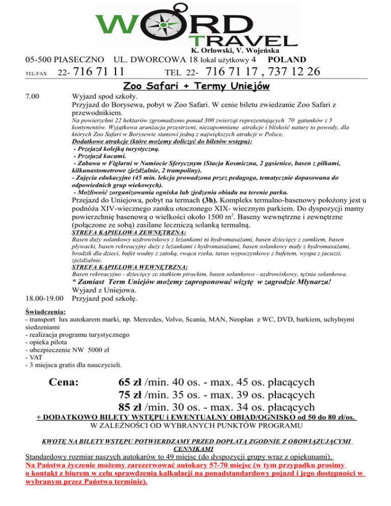 K. Orłowski, V. Wojeńska 05-500 PIASECZNO UL. DWORCOWA 18 lokal użytkowy 4 TEL/FAX 22- 716 71 11 TEL 22- POLAND 716 71 17 , 737 12 26 Zoo Safari + Termy Uniejów 7.00 Wyjazd spod szkoły. Przyjazd do Borysewa, pobyt w Zoo Safari. W cenie biletu zwiedzanie Zoo Safari z przewodnikiem. Na powierzchni 22 hektarów zgromadzono ponad 300 zwierząt reprezentujących 70 gatunków z 5 kontynentów. Wyjątkowa aranżacja przestrzeni, niezapomniane atrakcje i bliskość natury to powody, dla których Zoo Safari w Borysewie stanowi jedną z największych atrakcji w Polsce. Dodatkowe atrakcje (które możemy doliczyć do biletów wstępu): - Przejazd kolejką turystyczną. - Przejazd kucami. - Zabawa w Figlarni w Namiocie Sferycznym (Stacja Kosmiczna, 2 gąsienice, basen z piłkami, kilkunastometrowe zjeżdżalnie, 2 trampoliny). - Zajęcia edukacyjne (45 min. lekcja prowadzona przez pedagoga, tematycznie dopasowana do odpowiednich grup wiekowych). - Możliwość zorganizowania ogniska lub zjedzenia obiadu na terenie parku. Przejazd do Uniejowa, pobyt na termach (3h). Kompleks termalno-basenowy położony jest u podnóża XIV-wiecznego zamku otoczonego XIX- wiecznym parkiem. Do dyspozycji mamy powierzchnię basenową o wielkości około 1500 m2. Baseny wewnętrzne i zewnętrzne (połączone ze sobą) zasilane leczniczą solanką termalną. STREFA KĄPIELOWA ZEWNĘTRZNA: Basen duży solankowy uzdrowiskowy z leżankami ni hydromasażami, basen dziecięcy z zamkiem, basen pływacki, basen rekreacyjny duży z leżankami i hydromasażami, basen solankowy mały z hydromasażami, brodzik dla dzieci, bufet wodny z zatoką, rwąca rzeka, taras wypoczynkowy z bufetem, wyspa z jacuzzi, zjeżdżalnie. STREFA KĄPIELOWA WEWNĘTRZNA: Basen rekreacyjno - dziecięcy ze statkiem pirackim, basen solankowo - uzdrowiskowy, tężnia solankowa. 18.00-19.00 * Zamiast Term Uniejów możemy zaproponować wizytę w zagrodzie Młynarza! Wyjazd z Uniejowa. Przyjazd pod szkołę. Świadczenia: - transport lux autokarem marki, np. Mercedes, Volvo, Scania, MAN, Neoplan z WC, DVD, barkiem, uchylnymi siedzeniami - realizacja programu turystycznego - opieka pilota - ubezpieczenie NW 5000 zł - VAT - 3 miejsca gratis dla nauczycieli. Cena: 65 zł /min. 40 os. - max. 45 os. płacących 75 zł /min. 35 os. - max. 39 os. płacących 85 zł /min. 30 os. - max. 34 os. płacących + DODATKOWO BILETY WSTĘPU i EWENTUALNY OBIAD/OGNISKO od 50 do 80 zł/os. W ZALEŻNOŚCI OD WYBRANYCH PUNKTÓW PROGRAMU KWOTĘ NA BILETY WSTĘPU POTWIERDZAMY PRZED DOPŁATĄ ZGODNIE Z OBOWIĄZUJĄCYMI CENNIKAMI Standardowy rozmiar naszych autokarów to 49 miejsc (do dyspozycji grupy wraz z opiekunami). Na Państwa życzenie możemy zarezerwować autokary 57-70 miejsc (w tym przypadku prosimy o kontakt z biurem w celu sprawdzenia kalkulacji na ponadstandardowy pojazd i jego dostępności w wybranym przez Państwa terminie). W celu podpisania umowy i rezerwacji konkretnego terminu prosimy o telefon do biura 022 716 71 11 lub 022 716 71 17 lub mail [email protected] Zaliczka konieczna do podpisania umowy 40 zł/os. Ze względu na szczyt sezonu wycieczek szkolnych w miesiącach maj-czerwiec sugerujemy dokonanie rez. wstępnej na czas zebrania zaliczek! Wyciąg z warunków uczestnictwa imprez turystycznych organizowanych przez B.P. Word Travel (pełna wersja warunków uczestnictwa dostępna jest u nauczyciela organizującego wycieczkę) : 13. W przypadku rezygnacji lub nie uczestniczenia Uczestnika w wykupionej imprezie Organizator uprawniony jest do potrącenia RZECZYWIŚCIE PONIESIONYCH KOSZTÓW. 14. Zmiana uczestnika nie pociąga za sobą kosztów finansowych. 18. Uczestnik odpowiada za wszelkie szkody materialne wyrządzone w trakcie trwania imprezy (zniszczenia w hotelu, autokarze) 15. Jeżeli w programie jest wyjazd poza granicę Polski - uczestnik winien posiadać na miejscu zbiórki aktualnie obowiązujące dokumenty uprawniające do przekroczenia granic krajów objętych programem imprezy (wyłącznie dowód osobisty lub paszport ważny min. 6 m-cy od daty powrotu). 9 B. W przypadku chorób uznawanych za przewlekłe uczestnik winien na własny koszt wykupić dodatkowe ubezpieczenie ! ( dotyczy wycieczek zagranicznych) Klient przez dokonanie wpłaty (całkowitej lub częściowej) akceptuje program wycieczki i warunki uczestnictwa.