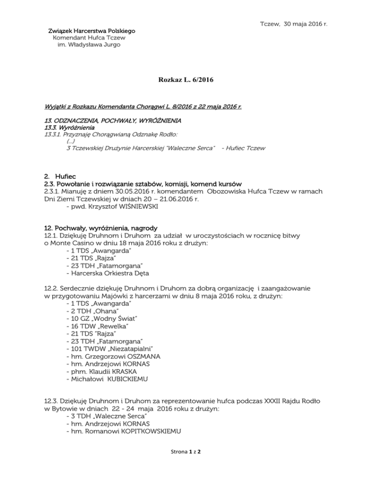 Rozkaz L 6 2016 - Tczew ZHP - Związek Harcerstwa Polskiego