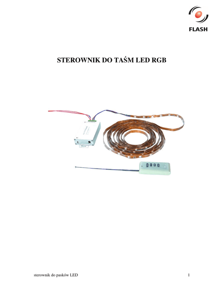 STEROWNIK DO TAŚM LED RGB sterownik do pasków LED 1 Sterownik ten jest specjalnie dedykowanym kontrolerem do taśm LED RGB. Jego niewielkie rozmiary ułatwiają tworzenie skomplikowanych projektów. Elastyczność taśmy LED RGB pozwala na używanie jej do układania wymyślnych kształtów, a wodoszczelna rurka silikonowa, użyta jako obudowa paska, pozwala na zastosowanie tego produktu nawet w skrajnie niekorzystnych warunkach pogodowych – IP65. Dane techniczne: • • • • • • • • temperatura pracy: -20-60OC napięcie wejściowe i wyjściowe: 12VDC (wymagane jest użycie zewnętrznego zasilacza 12VDC wymiary sterownika: 95x65x25mm sposób podłączenia: wspólny „plus” zalecane obciążenie sterownika: 4A na każdy kolor max. obciążenie sterownika: 6A na każdy kolor pamiętaj, aby nie łączyć pasków LED w szereg, tzn. jednego odcinka 5mb do drugiego odcinka 5mb taśma LED może również być zasilana bezpośrednio z zasilacza 12VDC z pominięciem sterownika Sterowanie z wykorzystaniem pilota bezprzewodowego: • przycisk A – główny przycisk funkcji. Każde wciśnięcie tego przycisku spowoduje zmianę wyświetlanego koloru („wzoru”) Lp. 1 2 3 4 5 6 7 8 9 • • „wzór” Czerwony Niebieski Różowy Zielony Żółty Cyan Biały Zmiana skokowa Zmiana stopniowa przycisk B – regulacja prędkości zmian kolorów – w górę (szybciej) przycisk C - regulacja prędkości zmian kolorów – w dół (wolniej) sterownik do pasków LED 2 Schemat połączeniowy: Informacje bezpieczeństwa: 1. Napięcie zasilania podawane na sterownik musi mieć wartość 12V. WYŻSZE NAPIĘCIE MOŻE SPOWODOWAĆ USZKODZENIE CAŁEGO UKŁADU. 2. Proszę zwrócić szczególną uwagę na prawidłowe połączenie przewodów wychodzących ze sterownika (4 przewody). NIE DOPUSZCZAĆ DO ZWARCIA PRZEWODÓW BĘDĄCYCH POD NAPIĘCIEM. sterownik do pasków LED 3