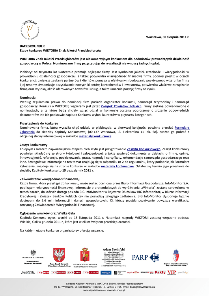 Warszawa, 30 sierpnia 2011 r. BACKGROUNDER Etapy konkursu WIKTORIA Znak Jakości Przedsiębiorców WIKTORIA Znak Jakości Przedsiębiorców jest niekomercyjnym konkursem dla podmiotów prowadzących działalność gospodarczą w Polsce. Nominowane firmy przystępując do rywalizacji nie wnoszą żadnych opłat. Plebiscyt od trzynastu lat skutecznie promuje najlepsze firmy. Jest symbolem jakości, rzetelności i wiarygodności w prowadzeniu działalności gospodarczej, a także: potwierdza wiarygodność finansową firmy, podnosi prestiż w oczach konkurencji, zwiększa zaufanie partnerów i klientów, pomaga w efektywnym budowaniu pozytywnego wizerunku firmy i jej renomy, dynamizuje pozyskiwanie nowych klientów, kontrahentów i inwestorów, potwierdza właściwe zarządzanie firmą oraz wysoką jakość oferowanych towarów i usług, a także umacnia pozycję firmy na rynku. Nominacja Według regulaminu prawo do nominacji firm posiada organizator konkursu, samorząd terytorialny i samorząd gospodarczy. Konkurs o WIKTORIĘ wspierany jest przez Związek Powiatów Polskich. Firmy zostaną powiadomione o nominacjach, a te które będą chciały wziąć udział w konkursie zostaną poproszone o złożenie odpowiednich dokumentów. Na ich podstawie Kapituła Konkursu wyłoni laureatów w piętnastu kategoriach. Przystąpienie do konkursu Nominowana firma, która wyraziła chęć udziału w plebiscycie, w pierwszej kolejności powinna przesłać Formularz Zgłoszenia do siedziby Kapituły Konkursowej (00-137 Warszawa, ul. Elektoralna 11 lok. 68). Można go pobrać z oficjalnej strony internetowej w zakładce materiały konkursowe. Zeszyt konkursowy Kolejnym i zarazem najważniejszym etapem plebiscytu jest przygotowanie Zeszytu Konkursowego. Zeszyt konkursowy powinien składać się ze strony tytułowej i zgłoszeniowej, a także zawierać dokumenty w działach: o firmie, opinie, innowacyjność, referencje, podziękowania, prasa, nagrody i certyfikaty, rekomendacje samorządu gospodarczego oraz inne. Szczegółowe informacje na ten temat znajdują się w załączniku nr 2 do regulaminu, który podobnie jak Formularz Zgłoszenia, znajduje się na stronie konkursu w zakładce materiały konkursowe. Ostateczny termin jego przesłania do siedziby Kapituły Konkursu to 15 październik 2011 r. Zaświadczenie wiarygodności finansowej Każda firma, która przystąpi do konkursu, może zostać oceniona przez Biuro Informacji Gospodarczej InfoMonitor S.A. pod kątem wiarygodności finansowej. Informacje o pretendujących do wyróżnienia „Wiktoria” zostaną sprawdzone w trzech bazach, do których dostęp posiada BIG InfoMonitor: w Rejestrze Dłużników BIG InfoMonitor, w Biurze Informacji Kredytowej i Związek Banków Polskich czy nie posiadają zaległego zadłużenia. BIG InfoMonitor dysponuje łącznie dostępem do 5,6 mln informacji i danych gospodarczych. Ci, którzy przejdą pozytywnie powyższą weryfikację, otrzymają Zaświadczenie Wiarygodności Finansowej. Ogłoszenie wyników oraz Wielka Gala Kapituła Konkursu ogłosi wyniki po 15 listopada 2011 r. Natomiast nagrody WIKTORII zostaną wręczone podczas Wielkiej Gali w grudniu 2011 r., która jest wielkim świętem przedsiębiorczości. Na każdym etapie konkursu organizatorzy oferują wsparcie. Siedziba Kapituły Konkursu WIKTORII Znaku Jakości Przedsiębiorców 00-137 Warszawa, ul. Elektoralna 11 lok.68, tel. 22 620 31 64, email: [email protected] www.wipwarszawa.eu www.wiktoriapl.pl