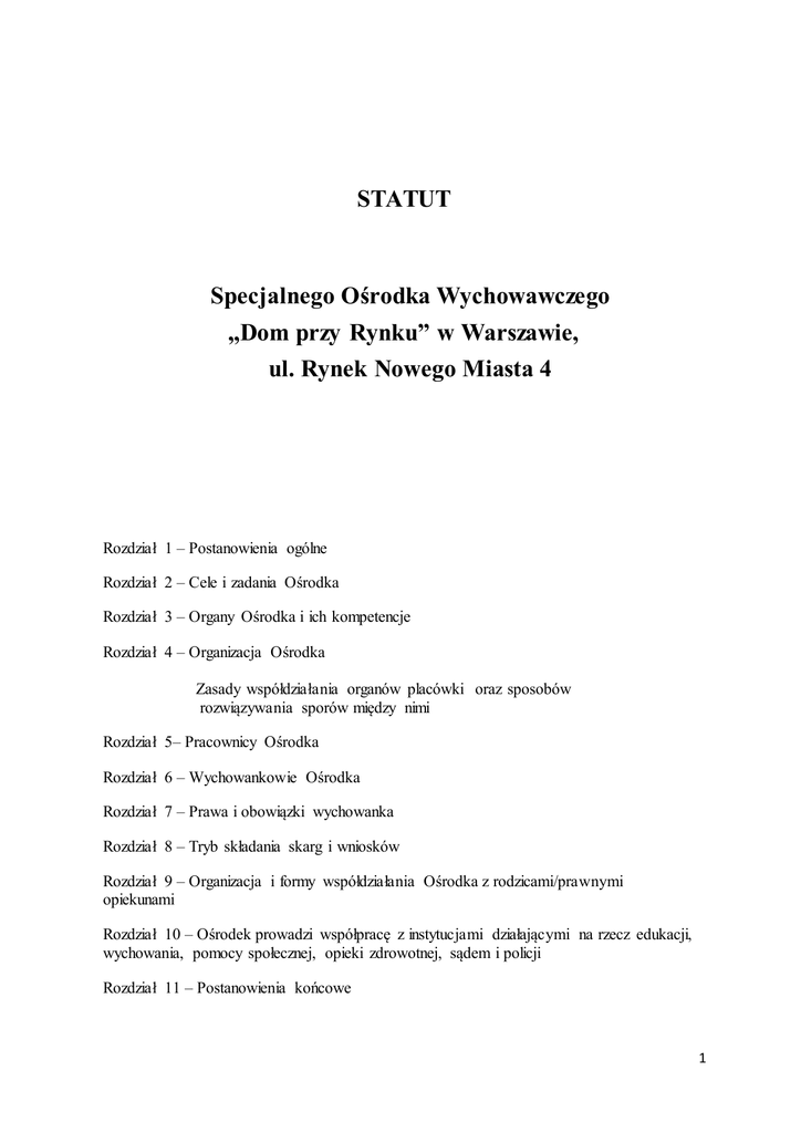 STATUT Specjalnego Ośrodka Wychowawczego „Dom przy Rynku” w Warszawie, ul. Rynek Nowego Miasta 4 Rozdział 1 – Postanowienia ogólne Rozdział 2 – Cele i zadania Ośrodka Rozdział 3 – Organy Ośrodka i ich kompetencje Rozdział 4 – Organizacja Ośrodka Zasady współdziałania organów placówki oraz sposobów rozwiązywania sporów między nimi Rozdział 5– Pracownicy Ośrodka Rozdział 6 – Wychowankowie Ośrodka Rozdział 7 – Prawa i obowiązki wychowanka Rozdział 8 – Tryb składania skarg i wniosków Rozdział 9 – Organizacja i formy współdziałania Ośrodka z rodzicami/prawnymi opiekunami Rozdział 10 – Ośrodek prowadzi współpracę z instytucjami działającymi na rzecz edukacji, wychowania, pomocy społecznej, opieki zdrowotnej, sądem i policji Rozdział 11 – Postanowienia końcowe 1 ROZDZIAŁ 1 Postanowienia ogólne §1 1.Specjalny Ośrodek Wychowawczy „Dom przy Rynku” z siedzibą w Warszawie, przy ul. Rynek Nowego Miasta 4, zwany dalej „Ośrodkiem” jest placówką publiczną dla dzieci młodzieży, które z powodu zaburzeń rozwojowych, trudności w uczeniu się i zaburzeń w funkcjonowaniu społecznym wymagają stosowania specjalnych oddziaływań wychowawczych, pomocy psychologiczno – pedagogicznej oraz zajęć rewalidacyjnych ze względu na występujące niepełnosprawności lub zagrożenie niedostosowaniem społecznym. 2.Ośrodek działa na podstawie ustawy z dnia 7 września 1991 r. o systemie oświaty (Dz. U. z 2004 r. Nr 256, poz. 2572 ze zm.), przepisów wykonawczych oraz niniejszego statutu oraz 3. Siedziba Ośrodka jest m.st. Warszawa. 4.Organem prowadzącym Ośrodek jest m.st. Warszawa 5. Organem sprawującym nadzór pedagogiczny jest Mazowiecki Kurator Oświaty. 6. Ośrodek jest jednostką budżetową m.st. Warszawy i prowadzi gospodarkę finansową na zasadach określonych w odrębnych prze[pisach. 7. Ośrodek używa pieczęci urzędowej na podstawie odrębnych przepisów. 8. Nazwa Ośrodka używana jest w pełnym brzmieniu : Specjalny Ośrodek Wychowawczy „Dom przy Rynku” w Warszawie, ul. Rynek Nowego Miasta 4 9. Na pieczęciach urzędowych Ośrodka można używać skrótów Ośrodek Wychowawczy „Dom przy Rynku” w Warszawie, ul. Rynek Nowego Miasta 4. ROZDZIAŁ 2 Cele i zadania Ośrodka §2 1. Celem Ośrodka jest tworzenie dla wychowanków, niezbędnych dla prawidłowego ich rozwoju warunków wychowawczych, edukacyjnych, zdrowotnych i materialnych umożliwiających prawidłowy przebieg procesu ich rozwoju oraz przygotowujących ich 2 do życia zgodnego z obowiązującymi normami społecznymi, dostosowanych do potrzeb wychowanków i możliwości Ośrodka. 2. Pobyt wychowanka w Ośrodku może trwać do czasu ukończenia nauki w szkole, nie dłużej jednak, niż do ukończenia 23 roku życia 3. Cele, o których mowa w ust. 2, realizowane są we współpracy z rodzicami/ opiekunami prawnymi wychowanków, instytucjami państwowymi i samorządowymi, a także stowarzyszeniami i innymi organizacjami, których celem statutowym jest działalność wychowawcza lub rozszerzenie i wzbogacanie form działalności dydaktycznej, wychowawczej §3 1. Do zadań Ośrodka należy eliminowanie przyczyn i przejawów niedostosowania społecznego , umożliwienie przez wychowanków zdobycie wiedzy i umiejętności niezbędnych do uzyskania świadectwa szkolnego oraz ukończenia szkoły podstawowej, gimnazjalnej lub ponadgimnazjalnej, przygotowanie wychowanków do prawidłowego uczestniczenia w życiu społecznym oraz życia zgodnego z powszechnie obowiązującymi normami społecznymi i prawnymi. 2. Zadania, o których mowa w ust. 1, realizowane są poprzez: 1) Realizacje obowiązku szkolnego i obowiązku nauki poza ośrodkiem; 2) Organizowanie zajęć specjalistycznych: korekcyjno – kompensacyjnych, logopedycznych, socjoterapeutycznych oraz innych zajęć o charakterze terapeutycznym, umożliwiających nabywanie społecznie akceptowanych umiejętności życiowych, przygotowujących dzieci i młodzież do samodzielności w życiu społecznym; 3) Współprace ze szkołą, w której wychowanek spełnia obowiązek szkolny lub obowiązek nauki, w zakresie realizowania zajęć rewalidacyjnych i oddziaływań wychowawczych; 4) Wspierania rodziców/ prawnych opiekunów w pełnieniu funkcji wychowawczej i edukacyjnej, w tym w rozpoznawaniu, wspomaganiu i rozwijaniu potencjalnych możliwości ich dzieci; 5) Wspomaganie wychowanków w zakresie nabywania umiejętności życiowych ułatwiających funkcjonowanie społeczne, organizowanie specjalistycznych działań, socjoterapeutycznych, umożliwiających zmianę postaw i osiągniecie pozytywnych, trwałych zmian w postawach wychowanków; 6) Udzielenie pomocy w przezwyciężeniu trudności uczenia się, z uwzględnieniem potrzeb i możliwości wychowanków; 7) Udzielenie pomocy rodzicom/ prawnym opiekunom w zakresie doskonalenia umiejętności niezbędnych we wspieraniu rozwoju swoich dzieci, w szczególności w zakresie unikania zachowań ryzykownych; 8) Udzielenie pomocy w planowaniu kariery edukacyjnej i zawodowej z uwzględnieniem możliwości i zainteresowań wychowanków oraz współpraca w tym zakresie 3 z rodzicami/ prawnymi opiekunami, szkołami oraz innymi instytucjami i organizacjami, właściwymi ze względu na miejsce zamieszkania wychowanka; 9) Organizacja i prowadzenie kół zainteresowań przedmiotowych, sportowych, rekreacyjnych; 10) Podejmowanie działań interwencyjnych w przypadku zachowań ryzykownych przejawianych przez wychowanków, zagrażających ich zdrowiu lub życiu oraz zagrażających innym osobom przebywającym na terenie Ośrodka, w szczególności poprzez współprace z policja, strażą miejską, sądem rodzinnym, rodzicami/ prawnymi opiekunami poprzez zawiadamianie rodziców/ prawnych opiekunów, policji, straży miejskiej, sądu rodzinnego, o wydarzeniu. ROZDZIAŁ 3 Organy Ośrodka i ich kompetencje §4 Organami Ośrodka są: 1) Dyrektor Ośrodka, 2) Rada Pedagogiczn