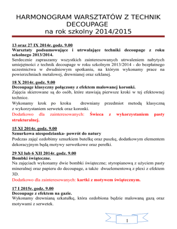 HARMONOGRAM WARSZTATÓW Z TECHNIK DECOUPAGE na rok szkolny 2014/2015 13 oraz 27 IX 2014r. godz. 9.00 Warsztaty podsumowujące i utrwalające techniki decoupage z roku szkolnego 2013/2014. Serdecznie zapraszamy wszystkich zainteresowanych utrwaleniem nabytych umiejętności z technik decoupage w roku szkolnym 2013/2014 - do bezpłatnego uczestnictwa w dwudniowym spotkaniu, na którym wykonamy prace na powierzchniach metalowej, drewnianej oraz szklanej. 18 X 2014r. godz. 9.00 Decoupage klasyczny połączony z efektem malowanej koronki. Zajęcia skierowane są do osób, które stawiają pierwsze kroki w tej efektownej technice. Wykonamy krok po kroku drewniany przedmiot metodą klasyczną z wykorzystaniem serwetek oraz koronki. Dodatkowo dla zainteresowanych: Świeca z wykorzystaniem pasty strukturalnej. 15 XI 2014r. godz. 9.00 Sznurkowa niespodzianka- powrót do natury Podczas zajęć ozdobimy sznurkiem butelkę oraz puszkę, dodatkowym elementem dekoracyjnym będą motywy serwetkowe oraz perełki. 29 XI lub 6 XII 2014r. godz. 9.00 Bombki świąteczne. Na zajęciach wykonamy dwie bombki świąteczne; styropianową z użyciem pasty mineralnej oraz papieru do decoupage, a także dwuelementową z plexi z efektem 3D. Dodatkowo dla zainteresowanych: kartki z motywem świątecznym. 17 I 2015r. godz. 9.00 Decoupage z efektem na gazie. Wykonamy drewnianą szkatułkę, która ozdobiona będzie malowaną gazą oraz motywami z serwetek. 1 HARMONOGRAM WARSZTATÓW Z TECHNIK DECOUPAGE na rok szkolny 2014/2015 14 II 2015r. godz. 9.00 Walentynki Na zajęciach wykonamy romantyczne serduszko z użyciem pasty strukturalnej, dodatkowo przygotujemy niespodziankę walentynkową dla mężczyzny. 21 III 2015r. godz. 9.00 Jajka wielkanocne z medalionami. Na zajęciach wykonamy dwa jajka plastikowe, udekorowane medalionami w dziewiętnastowiecznym stylu, na ciemnym tle. 21 IV 2015r. godz. 9.00 Imitacja marmuru na powierzchni ceramicznej. Podczas zajęć- ceramiczny talerz zamienimy na marmurowy, który udekorujemy elementem antycznym. 16 V 2015r. godz. 9.00 Transfer na materiale. Na zajęciach udekorujemy za pomocą transferu lnianą torbę na zakupy. 20 VI 2015r. godz. 9.00 Crakle dwuskładnikowy na powierzchni drewnianej. Zajęcia przeznaczone dla osób, które chciałyby nauczyć się postarzać swoje prace pięknymi spękaniami, zostanie do tego użyty preparat pękający dwuskładnikowy. Wykonamy krok po kroku drewniana tacę. Każde spotkanie to odrębny moduł, na którym zapoznamy się z poszczególnymi technikami i metodami w decoupage. W cenę kursu wliczone są: 1. Niezbędne materiały oraz preparaty do wykonania dekoracji. 2. W ramach każdego modułu wykonujesz krok po kroku przedmioty ozdobione różnymi technikami, które zabierzesz do domu. 3. Wszelkie informacje oraz zapisy pod numerem telefonu 603 953 185 Iwona Snopkowska Warsztaty odbywają się na ul. Zbylitowskiej 5 Tarnów Mościcki Ośrodek Szkoleniowo Terapeutyczny MOST 2