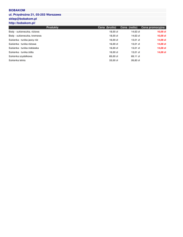 BOBAKOM ul. Przydrożna 21, 03-253 Warszawa [email protected] http://bobakom.pl/ Produkty Cena (brutto) Cena (netto) Cena promocyjna Body - sukieneczka, różowa 18,00 zł 14,63 zł 16,00 zł Body - sukieneczka, kremowa 18,00 zł 14,63 zł 16,00 zł Sukienka - tunika jasny róż 16,00 zł 13,01 zł 14,00 zł Sukienka - tunika różowa 16,00 zł 13,01 zł 14,00 zł Sukienka - tunika niebieska 16,00 zł 13,01 zł 14,00 zł Sukienka - tunika żółta 16,00 zł 13,01 zł 14,00 zł Sukienka szydełkowa 85,00 zł 69,11 zł Sukienka letnia 33,00 zł 26,83 zł
