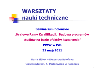 WARSZTATY nauki techniczne S Seminarium i i B l ń ki Bolońskie „Krajowe Ramy Kwalifikacji. Budowa programów studiów na bazie efektów kształcenia” PWSZ w Pile 31 maja2011 Maria Ziółek – Ekspertka Bolońska Uniwersytet im. A. Mickiewicza w Poznaniu 1 PLAN 1. OBSZAROWE EFEKTY KSZTAŁCENIA 2. EFEKTY KSZTAŁCENIA DLA PROGRAMU STUDIÓW 3. EFEKTY KSZTAŁCENIA DLA PRZEDMIOTU 4. ODNIESIENIE EK PRZEDMIOTÓW DO EK PROGRAMU STUDIÓW 5. JĘZYK OPISU I ZASADA SMART 6. ĆWICZENIA OPISÓW (Inne) Kompetencje Umiejjętności W Wiedza ERK Europejskie Ramy Poziom 6 (studia I stopnia) Kwalifikacji Poziom 7 Zaawansowana wiedza w danej dziedzinie pracy i nauki obejmująca krytyczne rozumienie jej teorii i zasad. Zaawansowane umiejętności wykazywania się biegłością i innowacyjnością potrzebną do rozwiązywania złożonych i nieprzewidywalnych problemów w specjalistycznej dziedzinie pracy lub nauki. Zarządzanie złożonymi technicznymi lub zawodowymi działaniami lub projektami, ponoszenie odpowiedzialności za podejmowane decyzje w nieprzewidywalnych kontekstach związanych z pracą lub nauką, nauką ponoszenie odpowiedzialności za zarządzanie rozwojem zawodowym jednostek i grup. (studia II stopnia) Wysoce wyspecjalizowana wiedza, wiedza której część stanowi najnowsza wiedza w danej dziedzinie pracy lub nauki, będąca podstawą oryginalnego myślenia lub badań. badań Krytyczna świadomość zagadnień w zakresie wiedzy w danej dziedzinie oraz na styku różnych dziedzin Specjalistyczne umiejętności rozwiązywania problemów potrzebne do badań lub działalności innowacyjnej w celu tworzenia nowej wiedzy i procedur oraz integrowania wiedzy z różnych dziedzin Poziom 8 (studia III stopnia – doktoranckie) Wiedza na najbardziej zaawansowanym poziomie w danej dziedzinie pracy lub nauki oraz na styku różnych dziedzin Najbardziej zaawansowane i wyspecjalizowane umiejętności i techniki w tym synteza i ocena, potrzebne do rozwiązywania krytycznych problemów badaniach lub działalności innowacyjnej oraz do poszerzania i ponownego określania istniejącej wiedzy lub praktyki zawodowej Zarządzanie i przekształcanie Wykazywanie się znaczącym kontekstów związanych z pracą lub autorytetem, innowacyjnością, nauką, które są złożone, autonomią, etyką naukową i nieprzewidywalne i wymagają nowych zawodową oraz trwałym podejść strategicznych. Ponoszenie zaangażowaniem w rozwój odpowiedzialności za przyczynianie się nowych idei i procesów w do rozwoju wiedzy i praktyki zawodowej najważniejszych kontekstach lub za dokonywanie przeglądów pracy zawodowej lub nauki nauki, w strategicznych wyników zespołów. tym badań. Przykład opisów EK w obszarze nauk technicznych Opis efektów kształcenia dla obszaru studiów technicznych – profil ogólnoakademicki Studia I stopnia SYMBOL Studia II stopnia SYMBOL ma poszerzoną i pogłębioną wiedzę w zakresie matematyki, fizyki, chemii i innych obszarów nauki przydatną do formułowania i rozwiązywania złożonych zadań związanych z reprezentowaną dyscypliną inżynierską ma elementarną wiedzę w zakresie spektrum dyscyplin inżynierskich powiązanych z reprezentowaną dyscypliną lub innych dyscyplin OT2A_W01 WIEDZA ma wiedzę w zakresie matematyki, fizyki, chemii i innych obszarów nauki przydatną do formułowania i rozwiązywania prostych zadań związanych z reprezentowaną dyscypliną inżynierską ma elementarną wiedzę w zakresie spektrum dyscyplin inżynierskich powiązanych z reprezentowaną dyscypliną OT1A_W01A OT1A_W02 OT2A_W02 Przykład opisów EK w obszarze nauk technicznych UMIEJĘTNOŚCI a) UMIEJĘTNOŚCI OGÓLNE (niezwiązane lub luźno związane z obszarem kształcenia inżynierskiego) p potrafi p pozyskiwać y informacje j z literatury, baz danych oraz innych źródeł, integrować je, dokonywać ich interpretacji oraz wyciągać wnioski i f formułować ł ć opinie i i OT1A_U01 p potrafi p pozyskiwać y informacje j z literatury, baz danych oraz innych źródeł, integrować je, dokonywać ich interpretacji i krytycznej oceny oraz wyciągać i ć wnioski i ki i fformułować ł ć opinie i i OT2A_U01 b) PODSTAWOWE UMIEJĘTNOŚCI INŻYNIERSKIE potrafi posługiwać się technikami informacyjno-komunikacyjnymi właściwymi do realizacji zadań typowych dla działalności inżynierskiej OT1A_ U05 potrafi posługiwać się technikami informacyjno-komunikacyjnymi właściwymi do realizacji zadań typowych dla działalności inżynierskiej OT2A_ U06 c)) UMIEJĘTNOŚCI OŚC BEZPOŚREDNIO OŚ O ZWIĄZANE Z ROZWIĄZYWANIEM O ZADAŃ Ń INŻYNIERSKICH Ż S C potrafi dokonać analizy sposobu funkcjonowania i ocenić - w zakresie wynikającym z reprezentowanej dyscypliny inżynierskiej - istniejące rozwiązania techniczne: urządzenia, obiekty, systemy, procesy, usługi itp. OT1A_ U11 potrafi dokonać analizy sposobu funkcjonowania i ocenić - w zakresie wynikającym z reprezentowanej dyscypliny inżynierskiej - istniejące rozwiązania techniczne: urządzenia, obiekty, systemy, procesy, usługi itp. OT2A_ U14 Przykład opisów EK w obszarze nauk technicznych KOMPETENCJE PERSONALNE I SPOŁECZNE rozumie potrzebę ciągłego dokształcania się podnoszenia kompetencji zawodowych i osobistych ma świadomość ważności i zrozumienie pozatechnicznych aspektów i skutków działalności inżynierskiej, w tym jej wpływu na środowisko, i związanej z tym odpowiedzialności za podejmowane decyzje OT1A_K01 OT1A_K02 rozumie potrzebę ciągłego dokształcania się - podnoszenia kompetencji zawodowych i osobistych ma świadomość ważności i zrozumienie pozatechnicznych aspektów i skutków działalności inżynierskiej, w tym jej wpływu na środowisko, i związanej z tym odpowiedzialności za podejmowane decyzje OT2A_K01 OT2A_K02 Kierunek: „Chemia przemysłowa” st dia II stopnia studia profil ogólnoakademicki Cel studiów Celem studiów jest: przekazanie wiedzy w zakresie najnowszych i najważnie