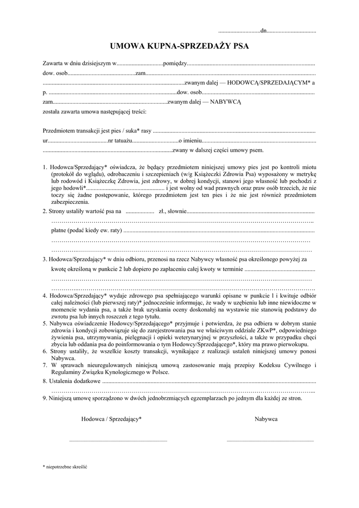 ............................dn................................. UMOWA KUPNA-SPRZEDAŻY PSA Zawarta w dniu dzisiejszym w...............................pomiędzy..................................................................................... dow. osob.............................................zam................................................................................................................. ..............................................................................................zwanym dalej — HODOWCĄ/SPRZEDAJĄCYM* a p. .....................................................................................dow. osob........................................................................... zam............................................................................zwanym dalej — NABYWCĄ została zawarta umowa następującej treści: Przedmiotem transakcji jest pies / suka* rasy ............................................................................................................ ur........................................nr tatuażu...............................o imieniu............................................................................ ......................................................................................zwany w dalszej części umowy psem. 1. Hodowca/Sprzedający* oświadcza, że będący przedmiotem niniejszej umowy pies jest po kontroli miotu (protokół do wglądu), odrobaczeniu i szczepieniach (w/g Książeczki Zdrowia Psa) wyposażony w metrykę lub rodowód i Książeczkę Zdrowia, jest zdrowy, w dobrej kondycji, stanowi jego własność lub pochodzi z jego hodowli*.................................................... i jest wolny od wad prawnych oraz praw osób trzecich, że nie toczy się żadne postępowanie, którego przedmiotem jest ten pies i że nie jest również przedmiotem zabezpieczenia. 2. Strony ustaliły wartość psa na ................... zł., słownie..................................................................................... ………………………………………………………………………………………………………………….. płatne (podać kiedy ew. raty) ............................................................................................................................... ………………………………………………………………………………………………………………… ………….……………………………………………………………………………………………………… 3. Hodowca/Sprzedający* w dniu odbioru, przenosi na rzecz Nabywcy własność psa określonego powyżej za kwotę określoną w punkcie 2 lub dopiero po zapłaceniu całej kwoty w terminie ............................................... ………………………………………………………………………………………………….……………… …………..………………………………………………………………………………………………………. 4. Hodowca/Sprzedający* wydaje zdrowego psa spełniającego warunki opisane w punkcie l i kwituje odbiór całej należności (lub pierwszej raty)* jednocześnie informując, że wady w uzębieniu lub inne niewidoczne w momencie wydania psa, a także brak uzyskania oceny doskonałej na wystawie nie stanowią podstawy do zwrotu psa lub innych roszczeń z tego tytułu. 5. Nabywca oświadczenie Hodowcy/Sprzedającego* przyjmuje i potwierdza, że psa odbiera w dobrym stanie zdrowia i kondycji zobowiązuje się do zarejestrowania psa we właściwym oddziale ZKwP*, odpowiedniego żywienia psa, utrzymywania, pielęgnacji i opieki weterynaryjnej w przyszłości, a także w przypadku chęci zbycia lub oddania psa do poinformowania o tym Hodowcy/Sprzedającego*, który ma prawo pierwokupu. 6. Strony ustaliły, że wszelkie koszty transakcji, wynikające z realizacji ustaleń niniejszej umowy ponosi Nabywca. 7. W sprawach nieuregulowanych niniejszą umową zastosowanie mają przepisy Kodeksu Cywilnego i Regulaminy Związku Kynologicznego w Polsce. 8. Ustalenia dodatkowe .............................................................................................................................................. …………………………………………………………………………………………………………………... 9. Niniejszą umowę sporządzono w dwóch jednobrzmiących egzemplarzach po jednym dla każdej ze stron. Hodowca / Sprzedający* * niepotrzebne skreślić Nabywca