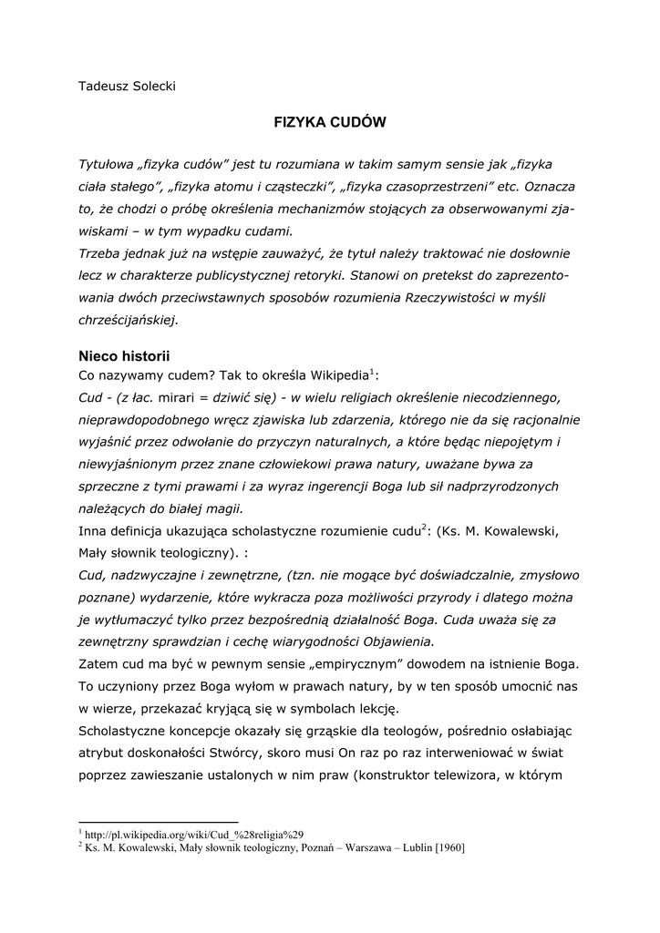 Tadeusz Solecki FIZYKA CUDÓW Tytułowa „fizyka cudów” jest tu rozumiana w takim samym sensie jak „fizyka ciała stałego”, „fizyka atomu i cząsteczki”, „fizyka czasoprzestrzeni” etc. Oznacza to, że chodzi o próbę określenia mechanizmów stojących za obserwowanymi zjawiskami – w tym wypadku cudami. Trzeba jednak już na wstępie zauważyć, że tytuł należy traktować nie dosłownie lecz w charakterze publicystycznej retoryki. Stanowi on pretekst do zaprezentowania dwóch przeciwstawnych sposobów rozumienia Rzeczywistości w myśli chrześcijańskiej. Nieco historii Co nazywamy cudem? Tak to określa Wikipedia1: Cud - (z łac. mirari = dziwić się) - w wielu religiach określenie niecodziennego, nieprawdopodobnego wręcz zjawiska lub zdarzenia, którego nie da się racjonalnie wyjaśnić przez odwołanie do przyczyn naturalnych, a które będąc niepojętym i niewyjaśnionym przez znane człowiekowi prawa natury, uważane bywa za sprzeczne z tymi prawami i za wyraz ingerencji Boga lub sił nadprzyrodzonych należących do białej magii. Inna definicja ukazująca scholastyczne rozumienie cudu2: (Ks. M. Kowalewski, Mały słownik teologiczny). : Cud, nadzwyczajne i zewnętrzne, (tzn. nie mogące być doświadczalnie, zmysłowo poznane) wydarzenie, które wykracza poza możliwości przyrody i dlatego można je wytłumaczyć tylko przez bezpośrednią działalność Boga. Cuda uważa się za zewnętrzny sprawdzian i cechę wiarygodności Objawienia. Zatem cud ma być w pewnym sensie „empirycznym” dowodem na istnienie Boga. To uczyniony przez Boga wyłom w prawach natury, by w ten sposób umocnić nas w wierze, przekazać kryjącą się w symbolach lekcję. Scholastyczne koncepcje okazały się grząskie dla teologów, pośrednio osłabiając atrybut doskonałości Stwórcy, skoro musi On raz po raz interweniować w świat poprzez zawieszanie ustalonych w nim praw (konstruktor telewizora, w którym 1 2 http://pl.wikipedia.org/wiki/Cud_%28religia%29 Ks. M. Kowalewski, Mały słownik teologiczny, Poznań – Warszawa – Lublin [1960] dla zmiany kanałów należałoby za każdym razem wymieniać podzespoły nie cieszyłby się najlepszą renomą). Scholastyczna „fizyka cudów” (zawieszenie praw przyrody) prokurowała mechanizm dla teologii bardzo niebezpieczny, przeto skrzętnie wykorzystywany przez prądy racjonalistyczne. Myślę tu o pokusie tłumaczenia poprzez cud wszelkich zjawisk, których nauka na danym poziomie rozwoju wyjaśnić nie umiała. Wizja „Boga w defensywie” cofającego się przed gwałtownie ekspandującym obszarem oświetlonym przez naukę aż dopraszała się prostej ekstrapolacji: trzeba jedynie czasu, by nauka oświetliła wszystko. Ten poznawczy optymizm pozwalał ojcom europejskiego racjonalizmu wypowiadać zdania pokroju Bóg? Dla mnie ta hipoteza jest zbędna. Tak ponoć 200 lat temu odpowiedział Laplace Napoleonowi, który pytał go, gdzie w jego wizji świata jest Bóg. Wobec naporu prądów pozytywistycznych teologowie wycofali się na „z góry upatrzone pozycje”, lansując koncepcję całkowitej przepaści między naukami przyrodniczymi a metafizyką. Temat mechanizmów rządzących cudami przezornie omijano, akcentując rolę cudu jako znaku Bożego. Zwrócono się do źródeł - czyli do Biblii. Autorzy Ksiąg Objawionych, zarówno Starego jak i Nowego Przymierza, nie pojmowali cudu w sensie scholastycznym. Aby to zrozumieć, trzeba zauważyć, że świat w pojęciu biblijnym nie jest doskonałą, raz na zawsze wprowadzoną w ruch maszyną, lecz ciągle pozostaje w zależności od Stwórcy - zatem nie tylko początek, lecz i aktualne trwanie zawdzięcza woli Bożej. Cud nie łamie praw natury, lecz je doskonali. Nie przeciwstawia się siłom stworzenia, lecz ułatwia ich pełną realizację3. Idąc tym tropem, rozszerzono pojęciowy obszar słowa „cud”: Cały świat stworzony ze swym ustalonym porządkiem (Jer 32,36 n) jest „cudem” (Ps 89,6) i „znakiem” (Ps 65,9) podobnie jak (owe) niezwykłe interwencje Boga w historii4. Myśląc prostolinijnie... Pachnie to nieco słowną ekwilibrystyką. Myśląc prostolinijnie i tak normalnie po ludzku, bierze nas ciekawość: w jaki sposób doszło do rozmnożenia chleba? Jakie mechanizmy wykorzystał Chrystus, chodząc po wodzie? Czy Zmartwychwstanie jest rzeczywiście jakimś buntem przeciwko fizyce tego świata? Czujemy różnicę między tymi zdarzeniami a normalnym porządkiem rzeczy, dostrzegamy ich 3 4 zob. Ks. J. Kudasiewicz, Biblia, historia, nauka, Znak, 1987, s. 345 i nast. Słownik teologii biblijnej, Pallotinum 1982, s.163 2 „nienaturalność”. Trzeba to wyraźnie oddzielić od aspektu teleologicznego i symbolicznego cudów. Są one w sposób nie budzący wątpliwości ważniejsze dla teologa, dla wierzącego (...czy figa nie rodząca owocu uschła natychmiast (Mt. 21,19), czy nieco później (Mk 11,20), nie ma to żadnego znaczenia; ważna jest lekcja, którą kryje w sobie jakieś symboliczne działanie5). Nie zamierzam tej hierarchii ważności kwestionować. Zgadzam się też ze zdaniem świat jest Znakiem, Sygnałem, Świadectwem, bo nie umiem go - samego w sobie - wytłumaczyć. Lecz jakoś nie umniejsza to mej chęci poznania odpowiedzi na podobne sformułowanym wyżej pytania. Dystansując się od potyczek z przyrodnikami teologowie ogłosili swoistą „dychotomię” Rzeczywistości: świat materialny to jedno, transcendentny - drugie. A więc Rzeczywistość, w której funkcjonuje człowiek, ma charakter dualistyczny. Przede wszystkim jest to rozbicie na poziomie dwóch sfer, będących niezbywalnym budulcem wszystkiego – podział na sferę sacrum i profanum. Fizyk nie ma kompetencji wypowiadania się w kwestii praw rządzących pierwszym, teolog - na odwrót. Osiągnięty dziejowy kompromis bardzo służy obu stronom, położył bowiem kres nie tylko stosom dla heretyków; także wszelkiej maści „naukowym światopoglądom”. Mniej 