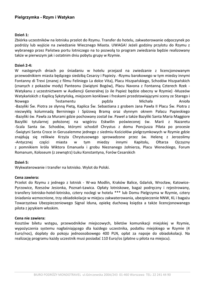 Pielgrzymka - Rzym i Watykan Dzień 1: Zbiórka uczestników na lotnisku przelot do Rzymu. Transfer do hotelu, zakwaterowanie odpoczynek po podróży lub wyjście na zwiedzanie Wiecznego Miasta. UWAGA! Jeżeli godziny przylotu do Rzymu z wybranego przez Państwa portu lotniczego na to pozwolą to program zwiedzania będzie realizowany także w pierwszym jak i ostatnim dniu pobytu grupy w Rzymie. Dzień 2-4: W następnych dniach po śniadaniu w hotelu przejazd na zwiedzanie z licencjonowanym przewodnikiem miasta będącego siedzibą Cesarzy i Papieży. -Rzymu barokowego w tym miedzy innymi Fontanny di Trevi (znanej z filmu Feliniego La dolce Vita), Placu Hiszpańskiego, Schodów Hiszpańskich (znanych z pokazów mody) Panteonu (świątyni Bogów), Placu Navona z Fontanną Czterech Rzek Watykanu z uczestnictwem w Audiencji Generalnej (o ile Papież będzie obecny w Rzymie) -Muzeów Watykańskich z Kaplicą Sykstyńską, miejscem konklawe i freskami przedstawiającymi sceny ze Starego i Nowego Testamentu pędzla Michała Anioła -Bazyliki Św. Piotra ze słynną Pietą, Kaplica Św. Sebastiana z grobem Jana Pawła II Placu Św. Piotra z niezwykłą kolumnadą Berniniego i Spiżową Bramą oraz słynnym oknem Pałacu Papieskiego -Bazyliki św. Pawła za Murami gdzie pochowany został św. Paweł a także Bazyliki Santa Maria Maggiore Bazyliki tytularnej położonej na wzgórzu Eskwilin poświeconej św. Marii z Nazaretu -Scala Santa św. Schodów, którymi schodził Chrystus z domu Poncjusza Piłata po procesie -Świątyni Santa Croce in Gerusalemme jednego z siedmiu Kościołów pielgrzymkowych w Rzymie gdzie znajdują się relikwie Krzyża Chrystusowego sprowadzone przez św. Helenę z Jerozolimy -Antycznej części miasta w tym miedzy innymi Kapitolu, Ołtarza Ojczyzny z pomnikiem króla Wiktora Emanuela i grobu Nieznanego żołnierza, Placu Weneckiego, Forum Romanum, Koloseum (z zewnątrz) Łuku Konstantyna, Forów Cesarskich Dzień 5: Wykwaterowanie i transfer na lotnisko. Wylot do Polski. Cena zawiera: Przelot do Rzymu z jednego z lotnisk - W-wa Modlin, Kraków Balice, Gdańsk, Wrocław, KatowicePyrzowice, Rzeszów Jesionka, Poznań-Ławica. Opłaty lotniskowe, bagaż podręczny i rejestrowany, transfery lotnisko-hotel-lotnisko, cztery noclegi w hotelu *** lub Domu Pielgrzyma w Rzymie, cztery śniadania wzmocnione, trzy obiadokolacje w miejscu zakwaterowania, ubezpieczenie NNW, KL i bagażu Towarzystwa Ubezpieczeniowego Signal Iduna, opiekę duchową księdza a także licencjonowanego pilota z językiem włoskim. Cena nie zawiera: Kosztów biletu wstępu, przewodników miejscowych, biletów komunikacji miejskiej w Rzymie, wypożyczenia systemu nagłaśniającego dla każdego uczestnika, podatku miejskiego w Rzymie (4 Euro/noc), dopłaty do pokoju jednoosobowego 400 PLN, opłat za napoje do obiadokolacji. Na realizację programu każdy uczestnik musi posiadać 110 Euro/os (płatne u pilota na miejscu). BIURO PODRÓŻY MONDOTRAVEL ul.Górczewska 200A/243 01-460 Warszawa TEL: 22 241 44 90 Uwagi: Kolejność zwiedzania może ulec zmianie w zależności od terminu i godzin przelotu, pilot nie oprowadza grupy po wnętrzach muzeów i obiektach sakralnych, spotkanie z pilotem nastąpi na lotnisku w Polsce lub lotnisku w Rzymie, przejazdy po Rzymie komunikacją miejską, podczas pielgrzymki odbędzie się codziennie Msza Święta w tym jedna w Bazylice św. Piotra przy Grobie Jana Pawła II lub w Grotach Watykańskich, dopłata do pokoju jednoosobowego 400 PLN, napoje do obiadokolacji są dodatkowo płatne. Odprawa ON-LINE: W związku z wprowadzeniem przez linie lotnicze Ryanair oraz Wizzair obowiązkowej odprawy on-line i wysokimi karami związanymi z brakiem karty pokładowej, bardzo prosimy o zwrócenie szczególnej uwagi na dokładne wypełnianie formularza umowy-zgłoszenia. Dotyczy to w szczególności pełnego nazwiska (zgodnego z dokumentem z którym będą Państwo podróżować -dowód osobisty lub paszport), daty urodzenia, obywatelstwa oraz numeru i pełnej daty ważności w/w dokumentu. Ubezpieczenie: Podczas imprezy turystycznej wszyscy uczestnicy są objęci ubezpieczeniem jakie zapewnia im Towarzystwo Ubezpieczeniowe Signal Iduna z siedzibą w Warszawie. Głównym pakietem, którym są objęte uczestniczące w wycieczce (pielgrzymce) osoby to pakiet podstawowy-STANDARD. W/w pakiet zawiera ubezpieczenie od kosztów leczenia (KL do 10.000 Euro), następstw nieszczęśliwych wypadków (NNW do 15.000 PLN), bagażu (do 1.000 PLN). Istnieje także możliwość skorzystania z opcji dodatkowego ubezpieczenia jest to tzw. ubezpieczenie STANDARD PLUS (jest to rozszerzenie pakietu podstawowego STANDARD). Ubezpieczenie STANDARD PLUS zawiera ubezpieczenie od kosztów leczenia (KL do 20.000 Euro), następstw nieszczęśliwych wypadków (NNW do 15.000 PLN), bagażu (do 1.000 PLN)-dopłata + 50 zł. Innym rodzajem ubezpieczenia, z którego może skorzystać uczestnik jest UBEZPIECZENIE KR. Jest to ubezpieczenie od kosztów rezygnacji z wycieczki (pielgrzymki)-dopłata + 3% wartości wycieczki a także UBEZPIECZENIE KRCHP. UBEZPIECZENIE KRCHP to ubezpieczenie od kosztów rezygnacji z wycieczki (pielgrzymki) dla osób przewlekle chorych -dopłata 7,5% wartości wycieczki. Bagaż: We wszystkich cenach podstawowych wliczony jest bagaż pod- ręczny o następujących parametrach WIZZAIR - bagaż podręczny o wymiarach 42x32x25cm, waga nieokreślona. RYANAIR - bagaż podręczny o wymiarach 55x40x20cm, waga do 10 kg. Za dopłatą można zakupić bagaż rejestrowany. Różnią się one parametrami w zależności od linii lotniczej - WIZZAIR - bagaż rejestrowany do 32kg - RYANAIR - bagaż rejestrowany do 15kg lub 20 kg Bagaż rejestrowany do 15 kg (Wrocław) 240 PLN/os Bagaż rejestrowany do 20 kg (Wrocław) 360 PLN/os Bagaż rejestrowany do 32 kg (Gdańsk) 260 PLN/os Bagaż rejestrowany do 15 kg (Poznań, Warszawa) 240 PLN/os Bagaż rejestrowany do 20 kg (Poznań, Warszawa) 360 PLN/os Bagaż rejestrow