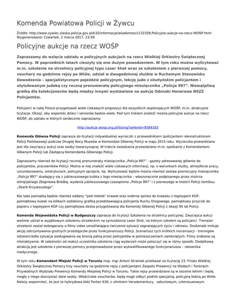 Komenda Powiatowa Policji w Żywcu Źródło: http://www.zywiec.slaska.policja.gov.pl/k32/informacje/wiadomosci/132339,Policyjne-aukcje-na-rzecz-WOSP.html Wygenerowano: Czwartek, 2 marca 2017, 23:59 Policyjne aukcje na rzecz WOŚP Zapraszamy do wzięcia udziału w policyjnych aukcjach na rzecz Wielkiej Orkiestry Świątecznej Pomocy. W poprzednich latach cieszyły się one dużym powodzeniem. W tym roku można wylicytować m.in. szkolenie na strzelnicy policyjnej typu Laser Shot wraz ze szkoleniem z pierwszej pomocy, vouchery na godzinne rejsy po Wiśle, udział w dwugodzinnej służbie w Ruchomym Stanowisku Dowodzenia – specjalistycznym pojeździe policyjnym, lekcję judo z olsztyńskim policjantem i utytułowanym judoką czy roczną prenumeratę policyjnego miesięcznika „Policja 997”. Niewątpliwą gratką dla kolekcjonerów będą między innymi wystawione na aukcję Odznaki Honorowe NSZZ Policjantów. Policjanci w całej Polsce przygotowali wiele ciekawych propozycji dla wszystkich wspierających WOŚP, m.in. atrakcyjne licytacje. Okazji, aby wspomóc dzieci i seniorów będzie wiele. Pod tym linkiem znaleźć można policyjne aukcje na rzecz WOŚP, do udziału w których serdecznie zapraszamy. http://aukcje.wosp.org.pl/listing?sellerId=9584183 Komenda Główna Policji zaprasza do licytacji indywidualnej wycieczki z przewodnikiem (policjantem rekonstruktorem Policji Państwowej) podczas Drugiej Nocy Muzeów w Komendzie Głównej Policji w maju 2015 roku. Wycieczka przewidziana jest dla zwycięzcy aukcji oraz osoby towarzyszącej. W trakcie zwiedzania przewidziano m.in. spotkanie z Komendantem Głównym Policji lub Zastępcą Komendanta Głównego Policji. Zapraszamy również do licytacji rocznej prenumeraty miesięcznika „Policja 997” - gazety adresowanej głównie do policjantów, pracowników Policji. Można w niej znaleźć wiele ciekawych informacji, np. o warunkach służby, atmosferze pracy, umundurowaniu, emeryturach, policyjnym sprzęcie, itp. Wylicytować będzie można również zestaw promocyjny miesięcznika „Policja 997” skadający się z jubileuszowego kubka z logo miesięcznika – własnoręcznie podpisanego przez mistrza olimpijskiego Zbigniewa Bródkę, wydania jubileuszowego czasopisma „Policja 997” i z pierwszego w historii Policji komiksu „Skarb Krzywoustego”. Nie lada pamiątką będzie również oddany "pod młotek" krawat oraz srebrna spinka do krawatu z logotypem KGP, pamiątkowy kubek na kółkach ozdobiony grafiką przedstawiającą policjanta Ruchu Drogowego, pamiątkowy przycisk do papieru z logotypem KGP czy pamiątkowa deska przygotowaną dla Komendy Głównej Policji z okazji 95 lat Policji. Komenda Wojewódzka Policji w Bydgoszczy zaprasza do licytacji Szkolenia na strzelnicy policyjnej. Zwycięzca aukcji weźmie udział w wyjątkowym szkoleniu strzeleckim na symulatorze Laser Shot, na którym szkoleni są policjanci. Trenażer strzelecki został wzbogacony o filmy video umożliwiające ćwiczenie sytuacji zagrażających życiu i zdrowiu. Doskonale imituje akcję zatrzymywania groźnych przestępców przez funkcjonariuszy Policji. Scenariusz tych krótkich inscenizacji - treningów odzwierciedla sytuacje posługiwania się bronią palną przez policjantów w pomieszczeniach zamkniętych. Filmy zrobione są interaktywnie. W zależności od reakcji uczestnika szkolenia ciąg wydarzeń może potoczyć się w różny sposób. Dodatkową atrakcją jest szkolenie z pierwszej pomocy przeprowadzone przez wykwalifikowanego funkcjonariusza – ratownika medycznego. W tym roku Komendant Miejski Policji w Toruniu insp. mgr Antoni Stramek przekazał na licytację 23. Finału Wielkiej Orkiestry Świątecznej Pomocy trzy vouchery na godzinne rejsy z policjantami Zespołu Prewencji na Wodach i Terenach Przywodnych Wydziału Prewencji Komendy Miejskiej Policji w Toruniu. Takie rejsy przewidziane są w sezonie letnim i będą mogły z niego skorzystać dwie osoby. Właściciele voucherów, będą mogli odbyć podróż specjalną, policyjną łodzią po Wiśle. Należy wspomnieć, że jest to hybrydowa łódź Parker 630, z silnikiem Veradomerkury, zaburtowym, czterosuwowym posiadająca 200 KM (koni mechanicznych). Wyposażona jest w urządzenie GPS, radar oraz echosondę umożliwiającą pływanie w trudnych warunkach atmosferycznych lub w nocy. Osiąga prędkość do 80 km/h a toruński garnizon wzbogacił się o nią w październiku 2011. Jeden voucher na rejs będzie można wylicytować na aukcji, dwa pozostałe w dniu 11.01.2015 roku na scenie głównej WOŚP w Toruniu. Ponadto na licytację trafią również dwie policyjne maskotki polfinek, symbol kujawsko - pomorskiej Policji. Policja z województwa łódzkiego wystawiła na aukcję możliwość pokierowania Ruchomym Stanowiskiem Dowodzenia (RSD). Jej zwycięzca weźmie udział w dwugodzinnej służbie w Ruchomym Stanowisku Dowodzenia - specjalistycznym pojeździe policyjnym, wyposażonym w różnego rodzaju urządzenia służące do kierowania siłami policyjnymi, m.in. w monitoring mobilny - podczas którego pozna specyfikę służby w ramach działań sztabowych Policji. Ponadto na rynku łódzkiej Manufaktury stanie stoisko policyjne, gdzie będzie można porozmawiać z policjantami, obejrzeć wyposażenie funkcjonariusza oraz policyjne pojazdy (radiowozy, motocykle, więźniarkę, pojazdy zabytkowe) oraz przelot policyjnego śmigłowca. Zarówno dzieci, jak i dorośli będą mogli wziąć udział w konkursach m.in. w ramach programu „Policyjna Akademia Bezpieczeństwa”. Gościom towarzyszyć będą maskotki KWP w Łodzi i KMP w Łodzi. W tegoroczny Finał WOŚP zaangażują się także komendy powiatowe i miejskie garnizonu łódzkiego. Między innymi w Piotrkowie Trybunalskim odbędzie się pokaz sprzętu policyjnego użytkowanego przez policjantów z KMP, przewidziano 3 licytacje podczas, których wygrać będzie można laserowy pomiar prędkości w obecności funkcjonariusza 