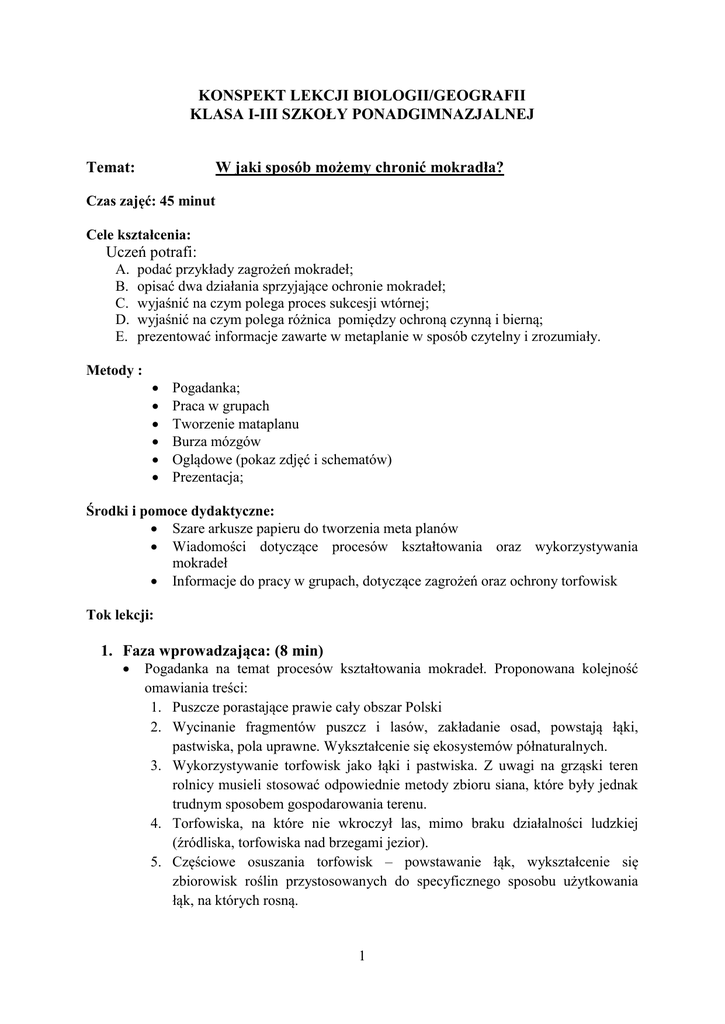 KONSPEKT LEKCJI BIOLOGII/GEOGRAFII KLASA I-III SZKOŁY PONADGIMNAZJALNEJ W jaki sposób możemy chronić mokradła? Temat: Czas zajęć: 45 minut Cele kształcenia: Uczeń potrafi: A. B. C. D. E. podać przykłady zagrożeń mokradeł; opisać dwa działania sprzyjające ochronie mokradeł; wyjaśnić na czym polega proces sukcesji wtórnej; wyjaśnić na czym polega różnica pomiędzy ochroną czynną i bierną; prezentować informacje zawarte w metaplanie w sposób czytelny i zrozumiały. Metody : Pogadanka; Praca w grupach Tworzenie mataplanu Burza mózgów Oglądowe (pokaz zdjęć i schematów) Prezentacja; Środki i pomoce dydaktyczne: Szare arkusze papieru do tworzenia meta planów Wiadomości dotyczące procesów kształtowania oraz wykorzystywania mokradeł Informacje do pracy w grupach, dotyczące zagrożeń oraz ochrony torfowisk Tok lekcji: 1. Faza wprowadzająca: (8 min) Pogadanka na temat procesów kształtowania mokradeł. Proponowana kolejność omawiania treści: 1. Puszcze porastające prawie cały obszar Polski 2. Wycinanie fragmentów puszcz i lasów, zakładanie osad, powstają łąki, pastwiska, pola uprawne. Wykształcenie się ekosystemów półnaturalnych. 3. Wykorzystywanie torfowisk jako łąki i pastwiska. Z uwagi na grząski teren rolnicy musieli stosować odpowiednie metody zbioru siana, które były jednak trudnym sposobem gospodarowania terenu. 4. Torfowiska, na które nie wkroczył las, mimo braku działalności ludzkiej (źródliska, torfowiska nad brzegami jezior). 5. Częściowe osuszania torfowisk – powstawanie łąk, wykształcenie się zbiorowisk roślin przystosowanych do specyficznego sposobu użytkowania łąk, na których rosną. 1 6. Intensyfikacja rolnictwa: melioryzacja, wzrost nawożenia w celu zwiększenia wydajności użytkowanych terenów. Niszczenie siedlisk roślin typowych dla torfowisk i łąk podmokłych. 7. Nowoczesne rolnictwo – częsta rezygnacja z prowadzenia rolnictwa na terenach podmokłych i zmeliorowanych, ponowne wkraczanie lasu, jednak z uwagi na odwodnienie torfowisk i proces murszenia, nie powstają już lasy typowe dla torfowisk niskich (olsy) i wysokich (bory bagienne). 2. Faza realizacyjna (22 min) Praca w grupach. Podział klasy na 3 grupy. Nauczyciel rozdaje uczniom informacje dotyczące zagrożeń oraz ochrony torfowisk. Grupy opracowują następujące zagadnienia: Grupa I (1-3) + sukcesja pierwotna, Grupa II (4-6) + sukcesja wtórna, Grupa III (7-9) + ekosystem półnaturalny. Uczniowie tworzą metaplany, za pomocą których zaprezentują opracowywane przez siebie kwestie. 1. Wydobycie torfu 2. Ochrona prawna ekosystemów mokradłowych 3. Koszenie, wypas bydła, wycinanie drzew i krzewów 4. Pożary 5. Działalność prowadzona w sąsiedztwie torfowisk. 6. Zastawki, stogi siana, aktywna ochrona płazów 7. Melioryzacja i osuszanie 8. Renaturyzacja, reintrodukcja, ochrona wierzb 9. Ochrona bierna 3. Faza podsumowująca (15 min) Prezentacja metaplanów. W wystąpieniu zespołów powinien uczestniczyć każdy członek grupy (ponieważ grupom zostało przydzielone kilka zagadnień, każdy z członków zespołu powinien dostać zadanie do opracowania) Materiały potrzebne do realizacji lekcji można znaleźć w: Jabłońska E., Dzierża P., Górski M., Sobociński W. Torfowiska z Bliska, czyli, co ciekawego kryje moja okolica, Stowarzyszenie Chrońmy Mokradła Cmok Warszawa 2004 (publikacja udostępniona na portalu internetowym bagna.pl: http://bagna.pl/CMS/index.php?option=com_content&view=article&id=586&Itemid= 146) Aktywna ochrona mokradeł w Zachodniej Polsce - pakiet edukacyjny, Klub Przyrodników, Świebodzin – Drawno – Poznań 2002 2 Literatura: Wołejko L., Stańko R., Pawlaczyk P., Jermaczek A. Poradnik ochrony mokradeł w krajobrazie rolniczym, Wydawnictwo Klubu Przyrodników Świebodzin 2004 Jabłońska E., Dzierża P., Górski M., Sobociński W. Torfowiska z Bliska, czyli, co ciekawego kryje moja okolica, Stowarzyszenie Chrońmy Mokradła Cmok Warszawa 2004 Pakiet edukacyjny Aktywna ochrona mokradeł w Polsce zachodniej zrealizowany przez Klub Przyrodników Źródła internetowe: www.bagna.pl www.gis-mokradla.info 3