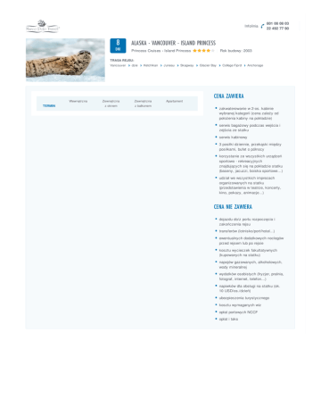 Infolinia 8 ALASKA - VANCOUVER - ISLAND PRINCESS DNI Princess Cruises - Island Princess 801 08 08 03 22 492 77 90 | Rok budowy: 2003 TRASA REJSU: Vancouver Wewnętrzna TERMIN dzie Ketchikan Zewnętrzna Zewnętrzna z oknem z balkonem Juneau Skagway Apartament Glacier Bay College Fjord Anchorage CENA ZAWIERA zakwaterowanie w 2-os. kabinie wybranej kategorii (cena zależy od położenia kabiny na pokładzie) serwis bagażowy podczas wejścia i zejścia ze statku serwis kabinowy 3 posiłki dziennie, przekąski między posiłkami, bufet o północy korzystanie ze wszystkich urządzeń sportowo - rekreacyjnych znajdujących się na pokładzie statku (baseny, jacuzzi, boiska sportowe…) udział we wszystkich imprezach organizowanych na statku (przedstawienia w teatrze, koncerty, kino, pokazy, animacje...) CENA NIE ZAWIERA dojazdu do/z portu rozpoczęcia i zakończenia rejsu transferów (lotnisko/port/hotel...) ewentualnych dodatkowych noclegów przed rejsem lub po rejsie kosztu wycieczek fakultatywnych (kupowanych na statku) napojów gazowanych, alkoholowych, wody mineralnej wydatków osobistych (fryzjer, pralnia, fotograf, internet, telefon...) napiwków dla obsługi na statku (ok. 10 USD/os./dzień) ubezpieczenia turystycznego kosztu wymaganych wiz opłat portowych NCCF opłat i taks