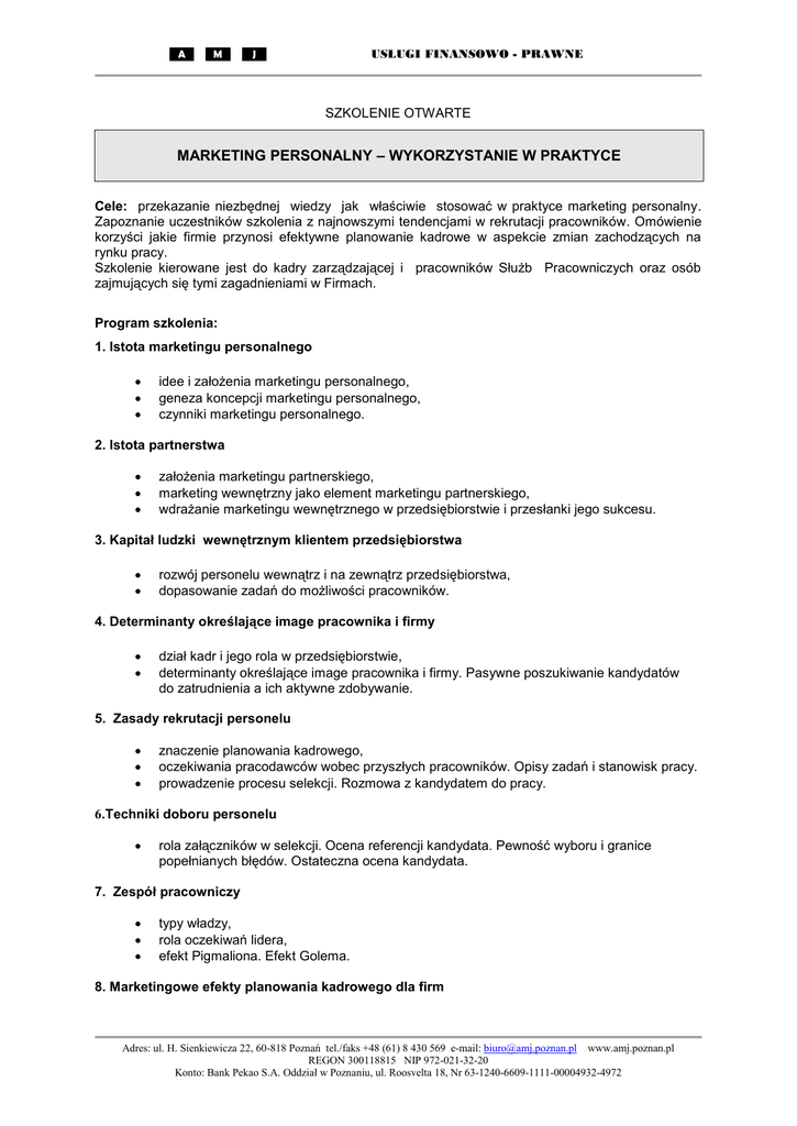 A M USŁUGI FINANSOWO - PRAWNE J SZKOLENIE OTWARTE MARKETING PERSONALNY – WYKORZYSTANIE W PRAKTYCE Cele: przekazanie niezbędnej wiedzy jak właściwie stosować w praktyce marketing personalny. Zapoznanie uczestników szkolenia z najnowszymi tendencjami w rekrutacji pracowników. Omówienie korzyści jakie firmie przynosi efektywne planowanie kadrowe w aspekcie zmian zachodzących na rynku pracy. Szkolenie kierowane jest do kadry zarządzającej i pracowników Służb Pracowniczych oraz osób zajmujących się tymi zagadnieniami w Firmach. Program szkolenia: 1. Istota marketingu personalnego idee i założenia marketingu personalnego, geneza koncepcji marketingu personalnego, czynniki marketingu personalnego. 2. Istota partnerstwa założenia marketingu partnerskiego, marketing wewnętrzny jako element marketingu partnerskiego, wdrażanie marketingu wewnętrznego w przedsiębiorstwie i przesłanki jego sukcesu. 3. Kapitał ludzki wewnętrznym klientem przedsiębiorstwa rozwój personelu wewnątrz i na zewnątrz przedsiębiorstwa, dopasowanie zadań do możliwości pracowników. 4. Determinanty określające image pracownika i firmy dział kadr i jego rola w przedsiębiorstwie, determinanty określające image pracownika i firmy. Pasywne poszukiwanie kandydatów do zatrudnienia a ich aktywne zdobywanie. 5. Zasady rekrutacji personelu znaczenie planowania kadrowego, oczekiwania pracodawców wobec przyszłych pracowników. Opisy zadań i stanowisk pracy. prowadzenie procesu selekcji. Rozmowa z kandydatem do pracy. 6.Techniki doboru personelu rola załączników w selekcji. Ocena referencji kandydata. Pewność wyboru i granice popełnianych błędów. Ostateczna ocena kandydata. 7. Zespół pracowniczy typy władzy, rola oczekiwań lidera, efekt Pigmaliona. Efekt Golema. 8. Marketingowe efekty planowania kadrowego dla firm Adres: ul. H. Sienkiewicza 22, 60-818 Poznań tel./faks +48 (61) 8 430 569 e-mail: [email protected] www.amj.poznan.pl REGON 300118815 NIP 972-021-32-20 Konto: Bank Pekao S.A. Oddział w Poznaniu, ul. Roosvelta 18, Nr 63-1240-6609-1111-00004932-4972 A M USŁUGI FINANSOWO - PRAWNE J marketingowe podejście do działań rekrutacyjnych - zmiany na rynku pracy. motywacja pracowników i wzrost efektywności działania firm (korzyści finansowe). komórka kadr jako ogniwo integrujące pracowników w firmą. globalizacja rynku pracy i działań rekrutacyjnych. Zmiany natury zajęć zawodowych i mechanizmów kariery. 9. Pytania i odpowiedzi oraz indywidualne konsultacje. Metodyka: zajęcia prowadzone są w formie wykładu połączonego z dyskusją i indywidualnymi konsultacjami. Konsultacje mają na celu wskazanie możliwych rozwiązań konkretnych problemów praktycznych. Wykładowca: posiada długoletnie doświadczenie zawodowe w spółkach handlowych, głównie z kapitałem niemieckim, w których jej głównym obszarem zainteresowania jest controlling i sprawozdawczość finansowa. Wykładowca na wyższych uczeniach. Autor książki: Marketing personalny oraz licznych publikacji o tematyce szeroko pojętego marketingu i jego narzędzi, handlu, powiązań podmiotów w kanałach dystrybucji i przemian w tychże kanałach, a także zagadnień makroekonomicznych. DANE ORGANIZACYJNE Termin szkolenia: 23 lutego 2012 r. Czas trwania zajęć: 1 dzień, w godz. od 10.00 do 15.00 ( 6 godzin lekcyjnych ). Miejsce szkolenia: sala konferencyjna – HOTEL MERCURE w Poznaniu, ul. Roosvelta 20. Koszt uczestnictwa: 420,00 zł + 23% VAT od osoby. Cena obejmuje udział w zajęciach, materiały – książkę autorstwa wykładowcy: Marketing personalny , serwis kawowy. Każdy uczestnik szkolenia otrzyma zaświadczenie potwierdzające udział w szkoleniu Adres: ul. H. Sienkiewicza 22, 60-818 Poznań tel./faks +48 (61) 8 430 569 e-mail: [email protected] www.amj.poznan.pl REGON 300118815 NIP 972-021-32-20 Konto: Bank Pekao S.A. Oddział w Poznaniu, ul. Roosvelta 18, Nr 63-1240-6609-1111-00004932-4972