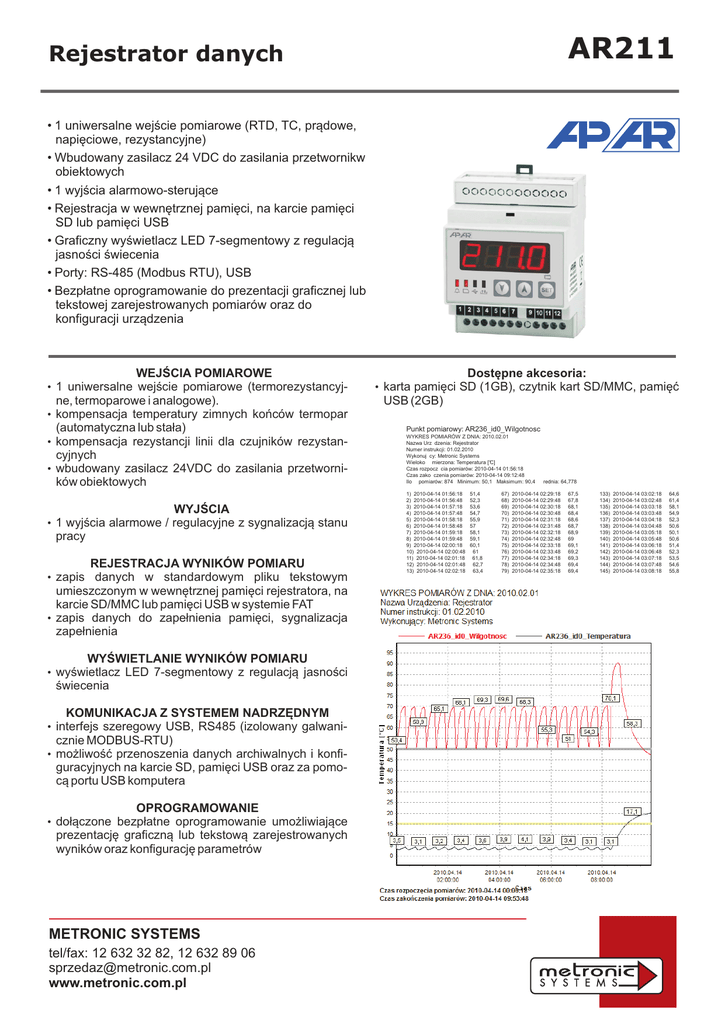 AR211 Rejestrator danych • 1 uniwersalne wejœcie pomiarowe (RTD, TC, pr¹dowe, napiêciowe, rezystancyjne) • Wbudowany zasilacz 24 VDC do zasilania przetwornikw obiektowych • 1 wyjœcia alarmowo-steruj¹ce • Rejestracja w wewnêtrznej pamiêci, na karcie pamiêci SD lub pamiêci USB • Graficzny wyœwietlacz LED 7-segmentowy z regulacj¹ jasnoœci œwiecenia • Porty: RS-485 (Modbus RTU), USB • Bezp³atne oprogramowanie do prezentacji graficznej lub tekstowej zarejestrowanych pomiarów oraz do konfiguracji urz¹dzenia WEJŒCIA POMIAROWE • 1 uniwersalne wejœcie pomiarowe (termorezystancyj- ne, termoparowe i analogowe). Dostêpne akcesoria: • karta pamiêci SD (1GB), czytnik kart SD/MMC, pamiêæ USB (2GB) • kompensacja temperatury zimnych koñców termopar (automatyczna lub sta³a) • kompensacja rezystancji linii dla czujników rezystan- cyjnych • wbudowany zasilacz 24VDC do zasilania przetworni- ków obiektowych WYJŒCIA • 1 wyjœcia alarmowe / regulacyjne z sygnalizacj¹ stanu pracy REJESTRACJA WYNIKÓW POMIARU • zapis danych w standardowym pliku tekstowym umieszczonym w wewnêtrznej pamiêci rejestratora, na karcie SD/MMC lub pamiêci USB w systemie FAT • zapis danych do zape³nienia pamiêci, sygnalizacja zape³nienia WYŒWIETLANIE WYNIKÓW POMIARU • wyœwietlacz LED 7-segmentowy z regulacj¹ jasnoœci œwiecenia KOMUNIKACJA Z SYSTEMEM NADRZÊDNYM • interfejs szeregowy USB, RS485 (izolowany galwani- cznie MODBUS-RTU) • mo¿liwoœæ przenoszenia danych archiwalnych i konfi- guracyjnych na karcie SD, pamiêci USB oraz za pomoc¹ portu USB komputera OPROGRAMOWANIE • do³¹czone bezp³atne oprogramowanie umo¿liwiaj¹ce prezentacjê graficzn¹ lub tekstow¹ zarejestrowanych wyników oraz konfiguracjê parametrów METRONIC SYSTEMS tel/fax: 12 632 32 82, 12 632 89 06 [email protected] www.metronic.com.pl Punkt pomiarowy: AR236_id0_Wilgotnosc WYKRES POMIARÓW Z DNIA: 2010.02.01 Nazwa Urz dzenia: Rejestrator Numer instrukcji: 01.02.2010 Wykonuj cy: Metronic Systems Wieloko mierzona: Temperatura [°C] Czas rozpocz cia pomiarów: 2010-04-14 01:56:18 Czas zako czenia pomiarów: 2010-04-14 09:12:48 Ilo pomiarów: 874 Minimum: 50,1 Maksimum: 90,4 1) 2010-04-14 01:56:18 2) 2010-04-14 01:56:48 3) 2010-04-14 01:57:18 4) 2010-04-14 01:57:48 5) 2010-04-14 01:58:18 6) 2010-04-14 01:58:48 7) 2010-04-14 01:59:18 8) 2010-04-14 01:59:48 9) 2010-04-14 02:00:18 10) 2010-04-14 02:00:48 11) 2010-04-14 02:01:18 12) 2010-04-14 02:01:48 13) 2010-04-14 02:02:18 51,4 52,3 53,6 54,7 55,9 57 58,1 59,1 60,1 61 61,8 62,7 63,4 67) 68) 69) 70) 71) 72) 73) 74) 75) 76) 77) 78) 79) rednia: 64,778 2010-04-14 02:29:18 2010-04-14 02:29:48 2010-04-14 02:30:18 2010-04-14 02:30:48 2010-04-14 02:31:18 2010-04-14 02:31:48 2010-04-14 02:32:18 2010-04-14 02:32:48 2010-04-14 02:33:18 2010-04-14 02:33:48 2010-04-14 02:34:18 2010-04-14 02:34:48 2010-04-14 02:35:18 67,5 67,8 68,1 68,4 68,6 68,7 68,9 69 69,1 69,2 69,3 69,4 69,4 133) 134) 135) 136) 137) 138) 139) 140) 141) 142) 143) 144) 145) 2010-04-14 03:02:18 2010-04-14 03:02:48 2010-04-14 03:03:18 2010-04-14 03:03:48 2010-04-14 03:04:18 2010-04-14 03:04:48 2010-04-14 03:05:18 2010-04-14 03:05:48 2010-04-14 03:06:18 2010-04-14 03:06:48 2010-04-14 03:07:18 2010-04-14 03:07:48 2010-04-14 03:08:18 64,6 61,4 58,1 54,9 52,3 50,6 50,1 50,6 51,4 52,3 53,5 54,6 55,8 AR211 Rejestrator danych DANE TECHNICZNE Iloœæ wejœæ: Czas odpowiedzi: Rezystancja doprowadzeñ (RTD, W ): Pr¹d wejœcia rezystancyjnego (RTD, W ): B³¹d przetwarzania (w temp. 25 ° C) podstawowy dodatkowy dla termopar dodatkowy od zmian temp. otoczenia Iloœæ wyjœæ: Typ wyjœæ: przekaŸnikowe SSR (opcja) Typ wyœwietlacza: USB tryb podrzêdny tryb nadrzêdny RS-485 Protokó³ Prêdkoœæ transmisji Separacja galwaniczna Okres zapisu danych Typ pamiêci Wewnêtrzna Zewnêtrzna karta SD/MMC Zewnêtrzna pamiêæ USB Zegar czasu rzeczywistego Napiêcie zasilania: Zasilacz przetworników Znamionowe warunki pracy Œrodowisko pracy Typ obudowy: Wymiary (wys. X szer. X g³.): Masa: METRONIC SYSTEMS tel/fax: 12 632 32 82, 12 632 89 06 [email protected] www.metronic.com.pl WEJŒCIA POMIAROWE 1 uniwersalne (programowalne) 1...10 s (programowalny) Rd < 25 W (dla ka¿dej linii) ~480 m A dla RTD, mA, V, mV, W : 0,1% zakresu pomiarowego ± 1 cyfra dla termopar: 0,2% zakresu pomiarowego ± 1 cyfra <2° C (temperatura zimnych koñców) < 0,005% zakresu wejœcia / ° C WYJŒCIA DWUSTANOWE 2 5A / 250V ~ (dla obci¹¿eñ rezyst.), SPST-NO tranzystorowe typu NPN OC, 11V, rezystancja wewn.440W WYŒWIETLACZ LED 7-segmentowy 4 cyfry, czerwony, wysokoœæ 14mm, z regulacj¹ jasnoœci INTERFEJS KOMUNIKACYJNY sterowniki dla systemu Windows 2000/XP/Vista/7 obs³uga pamiêci USB Modbus RTU 2,4...115,2 kbit/s Tak REJESTRACJA WYNIKÓW programowalny od 1s do 2 godz. 45 min. (1) 4MB, typu FLASH, system plików FAT12, zapis do 95 tys. pomiarów FAT16, FAT32, maksymalny rozmiar 2GB, zalecany rozmiar L 1GB i FAT16, z³¹cze z wyrzutnikiem FAT16, FAT32, maksymalny rozmiar 4GB, zalecany rozmiar L 1GB i FAT16, z³¹cze typu A4 kwarcowy RTC, uwzglêdnia lata przestêpne, podtrzymywanie bateria litowa CR1220 ZASILANIE 230 VAC (85-260 VAC / 4VA) 24 VAC/DC (20...50 VAC / 4 VA, 20-72 VDC / 4 W) 24 VDC / 30 mA WARUNKI PRACY 0...50 ° C, <100 %RH (bez kondensacji) powietrze, gazy neutralne WYMIARY MECHANICZNE - OBUDOWA Listwowa, MODULBOX 4MH53, samogasn¹ce tworzywo PRO 71 mm X 90 mm X 58 mm ok. 165 g AR211 Rejestrator danych Stopieñ ochrony od strony p³yty czo³owej: Stopieñ ochrony od strony p³yty tylnej: IP65 IP20 (1) - minimalny okres zapisu równy 1s mo¿liwy jest zawsze dla pamiêci wewnêtrznej. Dla pamiêci USB (pendrive) oraz kard SD minimalny gwarantowany (równomierny) okres rejestracji mo¿e wynosi nawet kilka sekund i zale¿y od rozmiaru dostêpnej pamiêci, systemu plików, rozmiaru archiwum oraz producenta (np. dla kart SD o rozmiarze L 256MB, FAT16 oraz pamiêci USB L 1GB, FAT16 mo¿liwy jest okres zapisu 1s, 