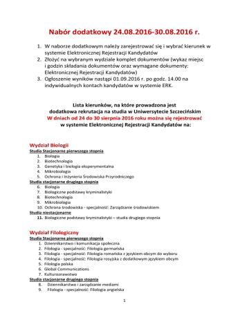 Nabór dodatkowy 24.08.2016-30.08.2016 r. 1. W naborze dodatkowym należy zarejestrować się i wybrać kierunek w systemie Elektronicznej Rejestracji Kandydatów 2. Złożyć na wybranym wydziale komplet dokumentów (wykaz miejsc i godzin składania dokumentów oraz wymagane dokumenty: Elektronicznej Rejestracji Kandydatów) 3. Ogłoszenie wyników nastąpi 01.09.2016 r. po godz. 14.00 na indywidualnych kontach kandydatów w systemie ERK. Lista kierunków, na które prowadzona jest dodatkowa rekrutacja na studia w Uniwersytecie Szczecińskim W dniach od 24 do 30 sierpnia 2016 roku można się rejestrować w systemie Elektronicznej Rejestracji Kandydatów na: Wydział Biologii Studia Stacjonarne pierwszego stopnia 1. Biologia 2. Biotechnologia 3. Genetyka i biologia eksperymentalna 4. Mikrobiologia 5. Ochrona i Inżynieria Środowiska Przyrodniczego Studia stacjonarne drugiego stopnia 6. Biologia 7. Biologiczne podstawy kryminalistyki 8. Biotechnologia 9. Mikrobiologia 10. Ochrona środowiska - specjalność: Zarządzanie środowiskiem Studia niestacjonarne 11. Biologiczne podstawy kryminalistyki – studia drugiego stopnia Wydział Filologiczny Studia Stacjonarne pierwszego stopnia 1. Dziennikarstwo i komunikacja społeczna 2. Filologia - specjalność: Filologia germańska 3. Filologia - specjalność: Filologia romańska z językiem obcym do wyboru 4. Filologia - specjalność: Filologia rosyjska z dodatkowym językiem obcym 5. Filologia polska 6. Global Communications 7. Kulturoznawstwo Studia stacjonarne drugiego stopnia 8. Dziennikarstwo i zarządzanie mediami 9. Filologia - specjalność: Filologia angielska 1 10. Filologia - specjalność: Filologia germańska 11. Filologia - specjalność: Filologia romańska 12. Filologia - specjalność: Filologia rosyjska 13. Filologia polska 14. Kulturoznawstwo Studia niestacjonarne 15. Filologia - specjalność: Filologia angielska – studia pierwszego stopnia 16. Filologia - specjalność: Filologia germańska – studia pierwszego stopnia 17. Filologia - specjalność: Filologia iberystyka, studia hiszpańskie - studia pierwszego stopnia 18. Filologia - specjalność: skandynawistyka, studia norweskie - studia pierwszego stopnia 19. Filologia - specjalność: Filologia angielska - studia drugiego stopnia 20. Filologia - specjalność: Filologia germańska - studia drugiego stopnia Wydział Humanistyczny Studia Stacjonarne pierwszego stopnia 1. Animacja kultury 2. Archeologia 3. Bezpieczeństwo narodowe 4. Filozofia 5. Historia (profil ogólnoakademicki) 6. Kognitywistyka komunikacji 7. Media i cywilizacja 8. Mediacja międzykulturowa 9. Pedagogika (profil ogólnoakademicki) 10. Pedagogika (profil praktyczny) 11. Pedagogika specjalna 12. Politologia 13. Praca socjalna 14. Socjologia 15. Stosunki międzynarodowe 16. Studia nad wojną i wojskowością Studia stacjonarne drugiego stopnia 17. Archeologia 18. Bezpieczeństwo narodowe 19. Bezpieczeństwo wewnętrzne 20. Filozofia 21. Historia 22. Kognitywistyka komunikacji 23. Pedagogika (profil ogólnoakademicki) 24. Pedagogika (profil praktyczny) 25. Pedagogika specjalna 26. Politologia 27. Praca socjalna 28. Socjologia 29. Stosunki międzynarodowe 30. Studia nad wojną i wojskowością Studia niestacjonarne 31. Bezpieczeństwo narodowe – studia pierwszego stopnia 2 32. 33. 34. 35. 36. 37. 38. 39. Bezpieczeństwo wewnętrzne – studia pierwszego stopnia Managment Instytucji Publicznych i Public Relations – studia pierwszego stopnia Pedagogika (profil ogólnoakademicki) – studia pierwszego stopnia Pedagogika (profil praktyczny) – studia pierwszego stopnia Bezpieczeństwo narodowe – studia drugiego stopnia Bezpieczeństwo wewnętrzne – studia drugiego stopnia Pedagogika (profil ogólnoakademicki) – studia drugiego stopnia Pedagogika (profil praktyczny) – studia drugiego stopnia Wydział Prawa i Administracji Studia Stacjonarne pierwszego stopnia i studia jednolite magisterskie 1. Prawo 2. Administracja 3. Kierunek: ekonomiczno – prawny Studia stacjonarne drugiego stopnia 4. Administracja 5. Kierunek: ekonomiczno – prawny Studia niestacjonarne 6. Prawo – studia jednolite magisterskie Wydział Kultury Fizycznej i Promocji Zdrowia Studia Stacjonarne pierwszego stopnia 1. Turystyka i rekreacja - specjalność: Animator rekreacji ruchowej i ekoturystyki 2. Wychowanie fizyczne (specjalność nauczycielska) 3. Zdrowie publiczne, specjalność: promocja zdrowia Studia stacjonarne drugiego stopnia 4. Turystyka i rekreacja - specjalność: Zdrowotne podstawy turystyki i rekreacji 5. Wychowanie Fizyczne (specjalność nauczycielska) 6. Zdrowie publiczne specjalność: trener aktywności osób starszych Studia niestacjonarne 7. Wychowanie fizyczne (specjalność nauczycielska) – studia pierwszego stopnia Wydział Matematyczno – Fizyczny Studia Stacjonarne pierwszego stopnia 1. Fizyka 2. Matematyka 3. Optyka okularowa Studia stacjonarne drugiego stopnia 4. Fizyka 5. Matematyka Studia niestacjonarne 6. Fizyka – studia pierwszego stopnia 7. Matematyka – studia pierwszego stopnia 8. Fizyka – studia drugiego stopnia 9. Matematyka – studia drugiego stopnia Wydział Nauk o Ziemi Studia Stacjonarne pierwszego stopnia 1. Geografia 3 2. Geologia 3. Gospodarka przestrzenna 4. Oceanografia 5. Turystyka i rekreacja Studia stacjonarne drugiego stopnia 6. Geologia 7. Gospodarka przestrzenna 8. Marine and Coastal Geosciences 9. Turystyka i rekreacja Wydział Teologiczny Studia Stacjonarne pierwszego stopnia i studia jednolite magisterskie 1. Italianistyka z elementami studiów nad chrześcijaństwem 2. Nauki o rodzinie 3. Teologia Studia stacjonarne drugiego stopnia 4. Italianistyka z elementami studiów nad chrześcijaństwem, specjalność: mediacja językowa, kultura i turystyka 5. Nauki o rodzinie - specjalność: Poradnictwo psychospołeczne, rodzinne i mediacje Studia niestacjonarne 6. Nauki o rodzinie - specjalność: Poradnictwo psychospołeczne, rodzinne i mediacje – studia dr
