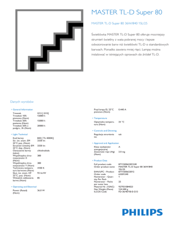 MASTER TL-D Super 80 MASTER TL-D Super 80 36W/840 1SL/25 Świetlówka MASTER TL-D Super 80 oferuje mocniejszy strumień świetlny z wata pobranej mocy i lepsze odwzorowanie barw niż świetlówki TL-D o standardowych barwach. Ponadto zawiera mniej rtęci. Lampę można instalować w istniejących oprawach do źródeł TL-D. Danych wyrobów • General Information Trzonek Trwałość 10% pionowo (Nom) Trwałość 50% pozioma (Nom) Trwałość 50% z podgrz., 3h (Nom) G13 [ G13] 12000 h 15000 h 20000 h 840 [ Tb 4000K] 3350 lm 3350 lm chłodnobiała 380 380 4100 K 93 lm/W 85 • Operating and Electrical Power (Rated) (Nom) 0.440 A • Temperature Optymalna temperatura (Nom) 25 °C • Controls and Dimming • Light Technical Kod barwy Str. św. znam. EM 25°C poz. (Nom) Strumień świetlny EM 25°C dop. (Nom) Oznaczenie barwy (tekst) Współrzędna chromatyczności X (Nom) Współrzędna chromatyczności Y (Nom) Techniczna temperatura barwowa (Nom) Skut. św. znam. HF 25°C, poz. (Nom) Wskaźnik oddawania barwa (Nom) Prąd lampy EL 25°C pionowo (Nom) 36.0 W Regulacja strumienia św. tak • Approval and Application Klasa wydajności energetycznej Zawartość rtęci (Hg) (Nom) A 2.0 mg • Product Data Full product code Order product name EAN/UPC - Product Order code Numerator - Quantity Per Pack Numerator - Packs per outer box Material Nr. (12NC) Net Weight (Piece) ILCOS Code 871150063201240 MASTER TL-D Super 80 36W/840 1SL/25 8711500632012 63201240 1 25 927921084023 134.500 g FD-36/40/1B-E-G13 MASTER TL-D Super 80 Warnings and safety • Jest bardzo mało prawdopodobne, by stłuczenie lampy mogło jakkolwiek zagrażać zdrowiu użytkownika. W razie stłuczenia lampy należy wietrzyć pomieszczenie przez około 30 minut oraz usunąć odłamki, najlepiej używając rękawiczek. Odłamki należy spakować do plastikowej torby i zanieść do punktu recyklingu. Nie stosować odkurzaczy workowych. Rysunki techniczne TL-D 36W/840 Product D MASTER TL-D Super 80 36W/840 1SL/25 28 mm 1199.4 mm 1206.5 mm 1204.1 mm 1213.6 mm A B B C G13, T8 Dane fotometryczne 2015, Grudzień 28 Dane wkrótce ulegną zmianie MASTER TL-D Super 80 © 2015 Koninklijke Philips N.V. (Royal Philips) Wszelkie prawa zastrzeżone Dane mogą ulec zmianie bez uprzedniego powiadomienia. Znak towarowy jest własnością Koninklijke Philips N.V. (Royal Philips) lub odpowiednich podmiotów . www.philips.pl/lighting 2015, Grudzień 28 Dane wkrótce ulegną zmianie