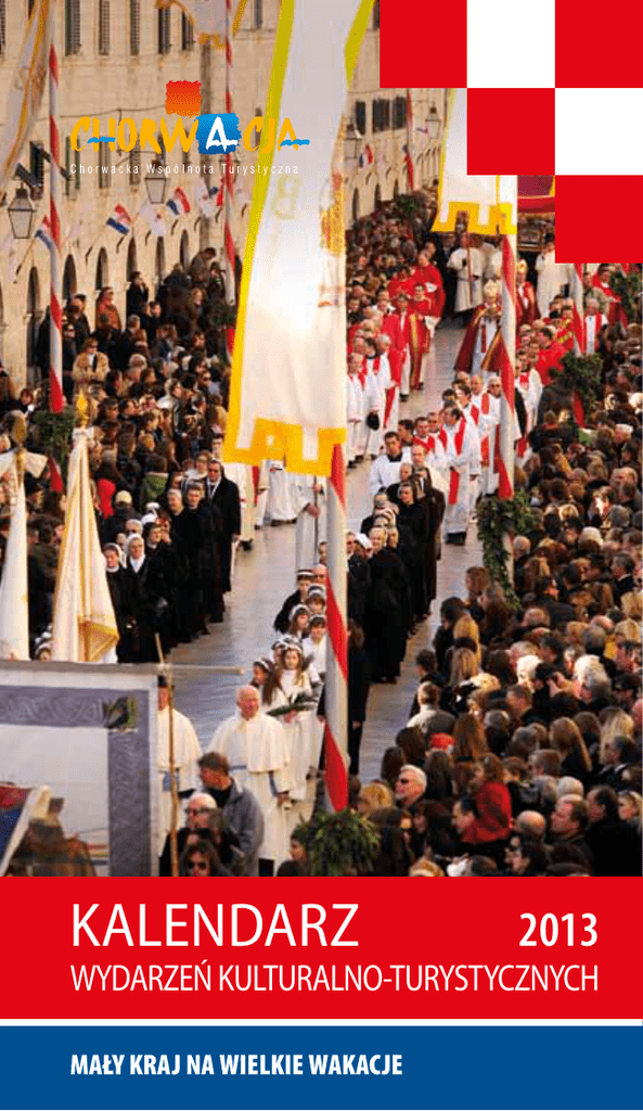 KALENDARZ 2013 WYDARZEŃ KULTURALNO-TURYSTYCZNYCH MAŁY KRAJ NA WIELKIE WAKACJE SPIS TREŚCI WYBRALIŚMY DLA PAŃSTWA ISTRIA 4. 5 - 15 KVARNER 16 - 28 LIKA - KARLOVAC 29 - 34 DALMACJA - REGION ZADARU 35 - 45 DALMACJA - REGION SZYBENIKA 46 - 52 DALMACJA - REGION SPLITU 53 - 63 DALMACJA - REGION DUBROWNIKA 64 - 72 CHORWACJA CENTRALNA 73 - 94 SLAVONIA 95 - 112 ZAGRZEB 113 - 121 INFORMACJE 122 - 123 Drodzy Goście! Witamy w Chorwacji! Cieszymy się, że zdecydowali się Państwo odwiedzić nasz kraj i poznać część naszego bogatego dziedzictwa kulturalnego. W ciągu całego roku w Chorwacji odbywa się wiele różnorodnych imprez kulturalnoturystycznych, uroczystości i festiwali. Niektóre z nich mają długoletnią tradycję i prezentują bogactwo poszczególnych regionów, inne są wynikiem ożywiania zwyczajów i świąt naszych przodków, a jeszcze inne dotrzymują kroku współczesnym wydarzeniom kulturalnym. Wiele z nich obejmuje także warsztaty twórcze, podczas których uczestnicy mogą zdobyć ciekawe doświadczenia, poznać innych ludzi i dobrze się bawić. Dzięki temu, że Chorwacja należy od dawna do Europy, częste są kontakty i występy gościnne licznych, wybitnych artystów zagranicznych. Mamy nadzieję, że wesoła i ekscytująca atmosfera każdej z tych imprez, wzbogaci Państwa pobyt w naszym kraju, a gościnność chorwackich gospodarzy sprawi, że będziecie się u nas czuć dobrze i swobodnie. Witamy w Chorwacji! Chorwacka Wspólnota Turystyczna RABSKA FJERA TURNIEJ RYCERSKI „SINJSKA ALKA” Rab 25. - 27.7. Sinj 4.8. Fotografia: Goran Novotny Fotografia: Ante Gašpar W dniu trzech świętych, św. Jakuba, św. Antoniego i św. Krzysztofa, Rab przenosi się w odległe średniowiecze. Odbywa się tu Turniej Kuszników z Rabu, w którym rycerze walczą o nagrodę, którą uroczyście wręcza im władca Rabu. Atmosferę całego wydarzenia uświetniają muzycy i chorążowie, a wszyscy uczestnicy, ubrani w kostiumy średniowieczne, mogą się przyłączyć do wielkiego orszaku maszerującego ulicami miasta. Rapska Fjera ożywia wspomnienia o dawnej świetności miasta Rab, z czasów, kiedy cieszyło się wolnością i stanowiło wolną gminę - municypium. Tradycyjny turniej rycerski Sinjska Alka organizowany jest od 1715 roku dla upamiętnienia zwycięstwa mieszkańców regionu zwanego Cetinska Krajina nad wojskiem tureckim. Początkowo w turnieju, który odbywał się co roku z okazji rocznicy zwycięstwa, uczestniczyli rycerze, którzy sami brali udział w bitwie, a później ich potomkowie, a tradycja trwa do dziś. W autentycznych miejscach: stara twierdza Grad, twierdza pomocnicza Kamičak, Alkarski Dvori i Alkarsko Trkalište - rycerze na koniach, tzw. alkari i ich pomocnicy z dumą pielęgnują trzystuletnią tradycję, symbolizującą bohaterstwo i pragnienie wolności. Kulminacyjnym punktem uroczystości jest sławna walka o pierścień, tzw. alkę. Oczywiście rycerze nie walczą ze sobą, ale jadąc na galopującym koniu starają się trafić w środek pierścienia. Zwycięża ten, kto zbierze najwięcej punktów i jemu właśnie przypada cała chwała bohaterskich przodków. Turniej Sinjska Alka przypomina o jednym z najsławniejszych wydarzeń w historii Chorwacji i zajmuje szczególne miejsce w ofercie kulturalnej. www.tzg-rab.hr www.alka.hr 4 www.chorwacja.hr WYBRALIŚMY DLA PAŃSTWA ISTRIA MAŁA AKADEMIA RYBACKA SARDELI Fažana 27.4. - 15.9. WINE DAY - DZIEŃ OTWARTYCH PIWNIC WINNYCH NA ISTRII Poreč, 26.5. Archiwum: Wspólnota Turystyczna Żupanii Istryjskiej Fotografia: Goran Šeblić Nie musicie zdawać egzaminu wstępnego jeżeli chcecie zapisać się do Akademii Sardynek (Akademija Srdela) w miejscowości Fažana. Należy mieć dobry apetyt i chęć do nowych doświadczeń kulinarnych. Jadąc Drogą Sardynek (Cesta Sardela), w restauracjach i konobach w Fažanie, odkryjecie ponad sto sposobów przygotowywania tej tłustej ryby. W maju można wziąć udział w Fažańskiej Szkole Solenia Sardeli i nauczyć się wszystkiego o układaniu ryb w puszce, olejach i przyprawach. Posiadając te wiadomości będziesz świetnym gościem, na którymkolwiek święcie Sardeli nad Adriatykiem. Co roku w ostatnią niedzielę w miesiącu maju obchodzony jest Światowy Dzień Wina. Od 1999 roku do tych obchodów przyłączyli się również istryjscy winiarze. Jeżeli w tym dniu wybierzesz się do którejś z istryjskich piwnic winnych obok dobrego wina, niespodzianki oferują też mili istryjscy gospodarze, a poza kieliszkiem wina może na stole znajdzie się też jakaś butelka ukryta na specjalne okazje... www.istria-fazana.com 6 www.chorwacja.hr ISTRIA www.istra.hr www.istria-gourmet.com PULA SUPERIORUM ASTROFEST Pula 13. - 15.6. Tičan - Višnjan 21.6. Archiwum: Wspólnota Turystyczna Żupanii Istryjskiej Archiwum: Wspólnota Turystyczna Żupanii Istryjskiej Mieszkańcy Puli są słusznie dumni ze swojej sławnej, rzymskiej przeszłości. Zachowane budowle z tego okresu zachwycają swoją majestatycznością gości ze wszystkich stron świata. Jednak najlepiej odwiedzić Pulę w okresie, kiedy na jej ulicach, na naszych oczach odgrywane są sceny z odległej przeszłości. Ulice Puli na kilka dni zmieniają się w scenę malowniczego teatru rzymskiego - tragedii i komedii antycznych. W tym czasie Arena ponownie przeżywa dni swojej świetności, kiedy wewnątrz jej murów odbywały się walki odważnych gladiatorów. Piękne kobiety noszą antyczne SZATY i fryzury, w każdym zaułku spektakle dźwięku i światła zapierają dech w piersiach, a rzymskie uczty oraz miejscowe specjały istryjskie orzeźwiają podniebienia. W czerwcu wszystkie dorgi prowadzą do Puli. W dniu przesilenia letniego, 21 czerwca, miłośnicy astronomii spotykają się na wzgórzu, w pobliżu słynnego obserwatorium astronomicznego w Višnjanie. Ten właśnie dzień, znany z najkrótszej nocy w roku, z którym związanych jest wiele legend i wierzeń mistycznych, w miejscowości V