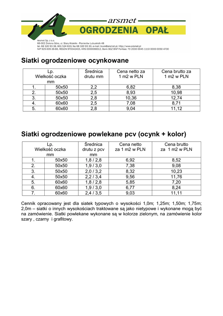 Siatki ogrodzeniowe ocynkowane Lp. Wielkość oczka mm 1. 50x50 2. 50x50 3. 50x50 4. 60x60 5. 60x60 Średnica drutu mm Cena netto za 1 m2 w PLN Cena brutto za 1 m2 w PLN 2,2 2,5 2,8 2,5 2,8 6,82 8,93 10,36 7,08 9,04 8,38 10,98 12,74 8,71 11,12 Siatki ogrodzeniowe powlekane pcv (ocynk + kolor) Lp. Wielkość oczka mm 1. 50x50 2. 50x50 3. 50x50 4. 50x50 5. 60x60 6. 60x60 7. 60x60 Średnica drutu z pcv mm 1,8 / 2,8 1,9 / 3,0 2,0 / 3,2 2,2 / 3,4 1,8 / 2,8 1,9 / 3,0 2,4 / 3,5 Cena netto za 1 m2 w PLN Cena brutto za 1 m2 w PLN 6,92 7,38 8,32 9,56 5,85 6,77 9,03 8,52 9,08 10,23 11,76 7,20 8,24 11,11 Cennik opracowany jest dla siatek typowych o wysokości 1,0m; 1,25m; 1,50m; 1,75m; 2,0m – siatki o innych wysokościach traktowane są jako nietypowe i wykonane mogą być na zamówienie. Siatki powlekane wykonane są w kolorze zielonym, na zamówienie kolor szary , czarny i grafitowy.