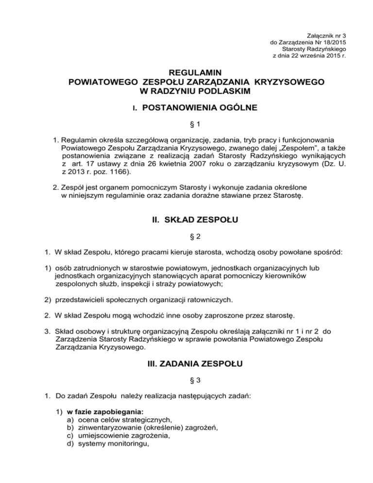 Załącznik nr 3 do Zarządzenia Nr 18/2015 Starosty Radzyńskiego z dnia 22 września 2015 r. REGULAMIN POWIATOWEGO ZESPOŁU ZARZĄDZANIA KRYZYSOWEGO W RADZYNIU PODLASKIM I. POSTANOWIENIA OGÓLNE §1 1. Regulamin określa szczegółową organizację, zadania, tryb pracy i funkcjonowania Powiatowego Zespołu Zarządzania Kryzysowego, zwanego dalej „Zespołem”, a także postanowienia związane z realizacją zadań Starosty Radzyńskiego wynikających z art. 17 ustawy z dnia 26 kwietnia 2007 roku o zarządzaniu kryzysowym (Dz. U. z 2013 r. poz. 1166). 2. Zespół jest organem pomocniczym Starosty i wykonuje zadania określone w niniejszym regulaminie oraz zadania doraźne stawiane przez Starostę. II. SKŁAD ZESPOŁU §2 1. W skład Zespołu, którego pracami kieruje starosta, wchodzą osoby powołane spośród: 1) osób zatrudnionych w starostwie powiatowym, jednostkach organizacyjnych lub jednostkach organizacyjnych stanowiących aparat pomocniczy kierowników zespolonych służb, inspekcji i straży powiatowych; 2) przedstawicieli społecznych organizacji ratowniczych. 2. W skład Zespołu mogą wchodzić inne osoby zaproszone przez starostę. 3. Skład osobowy i strukturę organizacyjną Zespołu określają załączniki nr 1 i nr 2 do Zarządzenia Starosty Radzyńskiego w sprawie powołania Powiatowego Zespołu Zarządzania Kryzysowego. III. ZADANIA ZESPOŁU §3 1. Do zadań Zespołu należy realizacja następujących zadań: 1) w fazie zapobiegania: a) ocena celów strategicznych, b) zinwentaryzowanie (określenie) zagrożeń, c) umiejscowienie zagrożenia, d) systemy monitoringu, e) f) g) h) symulacja skutków, określenie prawdopodobieństwa wystąpienia zagrożenia, ocena ryzyka, wnikliwa analiza mogących powstać nowych zagrożeń. 2) w fazie przygotowania: a) opracowanie i aktualizowanie „Powiatowego Planu Zarządzania Kryzysowego”, b) uzgadnianie z gminnymi zespołami zarządzania kryzysowego zasad i form kierowania i udzielania wsparcia przez Starostę w czasie reagowania kryzysowego, c) monitorowanie występujących zagrożeń i prognozowanie rozwoju sytuacji, d) bieżąca wymiana informacji ze służbami ratowniczymi nt. występujących zagrożeń na obszarze powiatu, e) ostrzeganie i alarmowanie ludności o możliwości wystąpienia zagrożeń życia i zdrowia, utraty mienia, oraz o podjętych zadaniach przeciwdziałających tym zagrożeniom, f) przygotowanie systemu łączności na potrzeby zarządzania kryzysowego, g) prowadzenie uzgodnień w zakresie współdziałania jednostek organizacyjnych administracji publicznej, służb ratowniczych w zakresie zapobiegania zagrożeniom oraz podczas reagowania kryzysowego, h) planowanie i przygotowanie środków transportu, warunków bytowych oraz pomocy lekarskiej i społecznej dla ewakuowanej ludności, i) organizowanie ochrony płodów rolnych i zwierząt gospodarskich oraz produktów żywnościowych i pasz podczas wystąpienia zagrożeń, j) organizowanie ochrony dóbr kultury podczas wystąpienia zagrożeń, k) utrzymywanie stałej współpracy z instytucjami realizującymi monitoring środowiska, l) przygotowanie warunków umożliwiających koordynację pomocy humanitarnej dla poszkodowanej ludności, m) planowanie i udział w realizacji szkolenia zespołów zarządzania kryzysowego: powiatowego, gminnego (miejskiego), n) informowanie społeczeństwa o realizowanych przez Starostę zadaniach na rzecz podnoszenia poziomu bezpieczeństwa w powiecie radzyńskim. 3) w fazie reagowania: a) koordynowanie działań ratowniczych i porządkowo-ochronnych prowadzonych przez jednostki organizacyjne biorące udział w reagowaniu kryzysowym na obszarze powiatu, b) utrzymywanie całodobowej łączności w relacjach: Starosta – Wojewoda – Starosta - Wójtowie gmin, Starosta – Starostowie ościennych powiatów, c) prowadzenie stałej wymiany informacji dotyczącej zagrożeń i podejmowanych (podjętych) działań oraz współdziałanie ze służbami (zespołami) organów administracji publicznej, resortów, organizacji pozarządowych, służb ratowniczych biorących udział w reagowaniu kryzysowym, d) analizowanie, prognozowanie rozwoju powstałych zdarzeń, e) zbieranie i dokumentowanie informacji, opracowywanie projektów decyzji związanych z reagowaniem kryzysowym, f) współdziałanie z zespołami zarządzania kryzysowego: Wojewódzkim Zespołem Zarządzania Kryzysowego, gminnymi zespołami zarządzania , powiatowymi zespołami zarządzania kryzysowego (powiatów sąsiednich: bialskiego, lubartowskiego, łukowskiego, parczewskiego), 2 g) koordynowanie realizacji zadań ratowniczych prowadzonych przez jednostki organizacyjne służby zdrowia i pozarządowe organizacje humanitarne, h) przekazywanie decyzji Starosty wykonawcom oraz przyjmowanie meldunków o wykonaniu zadań, i) informowanie społeczeństwa o wykonywanych przez Starostę zadaniach na rzecz usuwania skutków zagrożeń. 4) w fazie odtwarzania: a) szacowanie strat i opiniowanie wniosków mieszkańców ubiegających się o kredyty na odtworzenie produkcji i warunków bytowych, b) koordynowanie pomocy humanitarnej, c) koordynowanie pomocy psychologicznej, d) koordynowanie badań sanitarno – epidemiologicznych, e) koordynowanie działań związanych z odtwarzaniem infrastruktury technicznej. 2. Zadania poszczególnych grup roboczych o charakterze stałym są następujące: 1) Zadania grupy planowania cywilnego: a. Opracowywanie i uaktualnianie, przy udziale służb powiatowych: Powiatowego Planu Zarządzania Kryzysowego; b. Opracowywanie programów i procedur reagowania; c. Sporządzanie projektów wniosków do Wojewody Lubelskiego o wprowadzenie stanu klęski żywiołowej; d. Nadzór nad sporządzaniem raportów odbudowy i opracowywanie wniosków w celu pozyskania środków finansowych na odbudowę; e. Merytoryczna i kancelaryjno – biurowa obsługa szefa i grup roboczych Zespołu; f. Planowanie i organizowanie szkoleń oraz ćwiczeń z problematyki zarządzan