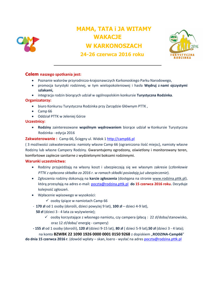 MAMA, TATA i JA WITAMY WAKACJE W KARKONOSZACH 24-26 czerwca 2016 roku Celem naszego spotkania jest: Poznanie walorów przyrodniczo-krajoznawczych Karkonoskiego Parku Narodowego, promocja turystyki rodzinnej, w tym wielopokoleniowej i hasła Wędruj z nami ojczystymi szlakami, integracja rodzin biorących udział w ogólnopolskim konkursie Turystyczna Rodzinka. Organizatorzy: biuro Konkursu Turystyczna Rodzinka przy Zarządzie Głównym PTTK , Camp 66 Oddział PTTK w Jeleniej Górze Uczestnicy: Rodziny zainteresowane wspólnym wędrowaniem biorące udział w Konkursie Turystyczna Rodzinka - edycja 2016 Zakwaterowanie : Camp 66, Ścięgny ul. Widok 1 http://camp66.pl ( 3 możliwości zakwaterowania: namioty własne Camp 66 (ograniczona ilość miejsc), namioty własne Rodziny lub własne Campery Rodziny. Gwarantujemy ogrodzony, oświetlony i monitorowany teren, komfortowe zaplecze sanitarne z wydzielonymi boksami rodzinnymi. Warunki uczestnictwa: Rodziny przyjeżdżają na własny koszt i ubezpieczają się we własnym zakresie (członkowie PTTK z opłacona składka za 2016 r. w ramach składki posiadają już ubezpieczenie). Zgłoszenia rodziny dokonują na karcie zgłoszenia (dostępna na stronie www.rodzina.pttk.pl), którą przesyłają na adres e-mail: [email protected] do 15 czerwca 2016 roku. Decyduje kolejność zgłoszeń. Wpłacenie wpisowego w wysokości: osoby śpiące w namiotach Camp 66 - 170 zł od 1 osoby (dorośli, dzieci powyżej 9 lat), 100 zł – dzieci 4-9 lat), 50 zł (dzieci 3 - 4 lata za wyżywienie); osoby korzystające z własnego namiotu, czy campera (płacą : 22 zł/doba/stanowisko, oraz 12 zł/doba/ energię - campery) - 155 zł od 1 osoby (dorośli), 120 zł (dzieci 9-15 lat), 80 zł ( dzieci 5-9 lat),50 zł (dzieci 3 - 4 lata); na konto BZWBK 22 1090 1926 0000 0001 0150 9268 z dopiskiem „RODZINA-Camp66” do dnia 15 czerwca 2016 r. (dowód wpłaty – skan, ksero - wysłać na adres [email protected] PROGRAM SPOTKANIA 1 dzień (24 czerwca 2016 roku) do godziny 14.00 docieramy do Ścięgien we własnym zakresie (zakwaterowanie wg. przyjętego wariantu przez rodzinę). 16.00 obiadokolacja 17.00 – 18.30 animacje, czy to już wakacje? 18.30 - 20.00 warsztaty pizzy dla dzieci 20.00 – 22.00 ognisko „ Legendy o Karkonoszu - Duchu z Gór ” 2 dzień ( 25 czerwca 2016 roku) 8-9.00 śniadanie Przejazd do Sobieszowa 10-13.00 warsztaty edukacyjne na Ścieżce Przyrodniczej Karkonoskiego Parku Narodowego 13-16.00 wejście na zamek Chojnik Powrót do Ścięgien 17.00 obiadokolacja Wieczorny relaks pod gwiazdami (sugerujemy zabrać karimaty i śpiwory lub koce) 3 dzień (26 czerwca 2016 roku) 8-9.00 śniadanie 10-13.00 animacje RODZINNA MAPA MARZEŃ 13.00 obiad i zakończenie warsztatów W ramach wpisowego: 2 noclegi, 2 śniadania, 2 obiadokolacje, przewodnik (1 dzień), animacje, warsztaty edukacyjne, warsztaty pizzy, ognisko materiały krajoznawcze. Do zobaczenia na warsztatach fot. Marek Arcimowicz