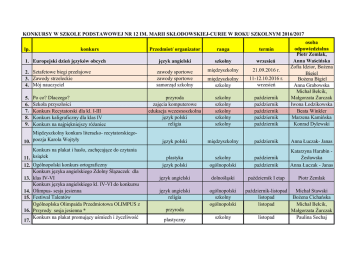 KONKURSY W SZKOLE PODSTAWOWEJ NR 12 IM. MARII SKŁODOWSKIEJ-CURIE W ROKU SZKOLNYM 2016/2017 lp. konkurs 1. Europejski dzień języków obcych 2. Sztafetowe biegi przełajowe 3. Zawody strzeleckie 4. Mój nauczyciel 5. 6. 7. 8. 9. Po co? Dlaczego? Szkoła przyszłości Konkurs Recytatorski dla kl. I-III Konkurs kaligraficzny dla klas IV Konkurs na najpiękniejszy różaniec Międzyszkolny konkurs literacko- recytatorskiego10. poezja Karola Wojtyły Konkurs na plakat i hasło, zachęcające do czytania 11. książek 12. Ogólnopolski konkurs ortograficzny Konkurs języka angielskiego Zdolny Ślązaczek dla 13. klas IV-VI Konkurs języka angielskiego kl. IV-VI do konkursu 14. Olimpus- sesja jesienna 15. Festiwal Talentów Ogólnoplska Olimpaida Przedmiotowa OLIMPUS z 16. Przyrody sesja jesienna * Konkurs na plakat promujący uśmiech i życzliwość 17. Przedmiot/ organizator ranga termin język angielski szkolny wrzesień międzyszkolny 21.09.2016 r. międzyszkolny szkolny 11-12.10.2016 r. wrzesień przyroda zajęcia komputerowe edukacja wczesnoszkolna język polski religia szkolny szkolny szkolny szkolny szkolny październik październik październik październik październik osoba odpowiedzialna Piotr Zemlak, Anna Waścińska Zofia Idzior, Bożena Bigiel Bożena Bigiel Anna Grabowska Michał Bełcik, Małgorzata Żurczak Iwona Łodzikowska Beata Winkler Marzena Kamińska Konrad Dylewski język polski międzyszkolny październik Anna Łuczak- Janas zawody sportowe zawody sportowe samorząd szkolny plastyka język polski szkolny ogólnopolski październik październik Katarzyna Harabin Żesławska Anna Łuczak - Janas język angielski dolnośląski październik I etap Piotr Zemlak język angielski religia ogólnopolski szkolny ogólnopolski październik-listopad listopad listopad szkolny listopad Michał Stawski Bożena Cichańska Michał Bełcik, Małgorzata Żurczak Paulina Sochaj przyroda plastyczny 18. 19. 20. 21. 22. 23. 24. Konkurs Czytelniczy dla klas III Zawody szachowe Konkurs piosenki angielskiej " Złoty Mikrofon" ALFIK MATEMATYCZNY dla klas II-VI edukacja wczesnoszkolna zawody sportowe język angielski matematyka religia Konkurs plastyczny o tematyce biblijnej religia Festiwal Wszystkich Świętych historia Multimedialny konkurs z okazji Święta Niepodległości Ogólnopolski konkurs "Olimpus" z języka polskiego i język polski, historia 25. historii 26. Młody botanik 27. Turniej gier logicznych 28. Konkurs Ortograficzny dla klas III Konkurs plastyczny- kl I-III oraz IV-VI "Nie tylko 29. wieża Eiffla" 30. Konkurs na bożonarodzeniową szopkę Konkurs w kl III na najciekawszą kartkę 31. bożonarodzeniową; 32. Ogólnopolski konkurs "Alfik Humanistyczny" 33. Festiwal piosenki i wiersza 34. Ozdoba świąteczna Ogólnoplska Olimpaida Przedmiotowa OLIMPUS z 35. Przyrody sesja zimowa * szkolny międzyszkolny szkolny ogólnopolski szkolny szkolny szkolny listopad 9.11.2016 r. 18.11.2016 r. 23.11. 2016 listopad listopad listopad Anna Karbownik Robert Korpalski Patrycja Kłosowicz Michał Rolak Konrad Dylewski Bożena Cichańska Anna Grabowska ogólnopolski listopad przyroda zajęcia komputerowe szkolny szkolny grudzień grudzień Helena Piotrowska Michał Bełcik, Małgorzata Żurczak Iwona Łodzikowska edukacja wczesnoszkolna szkolny grudzień Katarzyna Hebda język francuski religia szkolny szkolny grudzień grudzień Iwona Lech Bożena Cichańska język angieslki szkolny grudzień język polski ogólnopolski grudzień Andrzej Rutkowski Elżbieta Błaszczykiewicz Gruszka integracja międzyszkolny grudzień Iwona Marcińczak grudzień styczeń Emilia Lorek Czerska Michał Bełcik, Małgorzata Żurczak integracja przyroda szkolny ogólnopolski Konkurs Wrocławskie Krasnale 36. 37. Konkurs Ortograficzny dla k. III 38. Konkurs „Olimpusek” Zorganizowanie w kl III konkursu na najpiękniejszą Kartkę Walentynkową 39. Konkurs na najciekawsze opowiadanie dla klas IV40. VI"Moja podróż do Francji" Konkurs ortograficzny dla klas IV- VI 41. 42. Międzyszkolny konkurs "Polonistyczna Corrida" X Konkurs Matematyczno- Przyrodniczy PARK SZCZYTNICKI OCZAMI MŁODYCH 43. MATEMATYKÓW 44. Złoty krążek 45. Akcja konkurs "Cichy przyjaciel" Konkurs z wykorzystaniem prezentacji multimedialnej Power Point " Prezentacja krajów 46. frankofońskich" dla klas IV-VI Międzyszkolny konkurs literacko- frazeologiczny 47. "Rzucić słowem" 48. Konkurs recytatorski IV-VI 49. Tenis stołowy 50. KANGUR edukacja wczesnoszkolna szkolny edukacja wczesnoszkolna edukacja wczesnoszkolna międzyszkolny ogólnopolski 20.01.2017 r.- etap szkolny 7.03.2017 r.- etap międzyszkolny 16.05.2017 r. Finał styczeń styczeń język angielski szkolny styczeń Andrzej Rutkowski język francuski szkolny styczeń język polski język polski szkolny międzyszkolny miedzyszkolny styczeń styczeń I etap- 9 stycznia II etap- 24 kwietnia Anna Waścińska Elżbieta Błaszczykiewicz Gruszka Anna Łuczak - Janas Michał Bełcik Iwon Luty Jolanta Kowalska Anna Karbownik przyroda zawody sportowe międzyszkolny 1.02.2017 r. integracja szkolny luty Zofia Idzior, Bożena Bigiel Emilia Lorek Czerska język francuski szkolny luty Anna Waścińska język polski biblioteka międzyszkolny szkolny luty luty/marzec międzyszkolny 1.03.2017 r. ogólnopolski 16.03. 2017 r. Helena Piotrowska Agata Piaskiewicz Zofia Idzior, Bożena Bigiel Michał Rolak zawody sportowe matematyka 51. 52. W świecie zwierząt Konkurs recytatorski IV-VI Ogólnoplska Olimpaida Przedmiotowa OLIMPUS z Przyrody sesja wiosenna * Mistrz komputera przyroda biblioteka szkolny międzyszkolny marzec marzec Michał Bełcik, Małgorzata Żurczak Agata Piaskiewicz ogólnopolski marzec przyroda zajęcia komputerowe szkolny marzec edukacja wczesnoszkolna edukacja wczesnoszkolna edukacja wczesnoszkolna edukacja wczesnoszkolna szkolny szkolny międzyszkolny szkolny marzec marzec marzec marzec Konkurs Recytatorski „Spotkanie z wierszem” 59. 60. Mistrz komputera Organizacja i przep