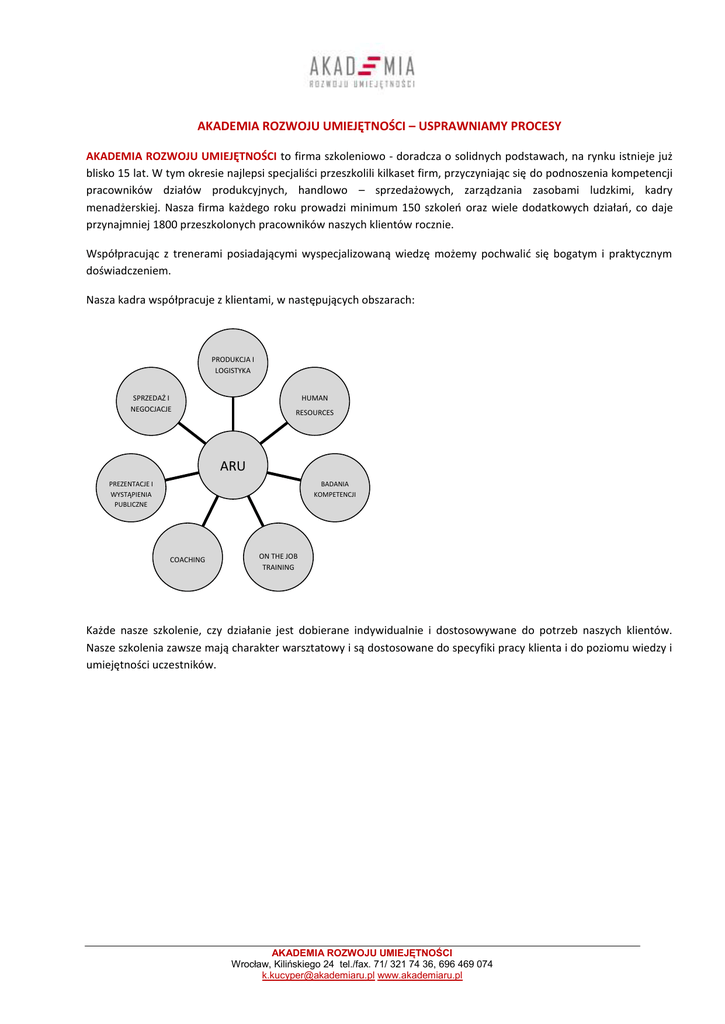 AKADEMIA ROZWOJU UMIEJĘTNOŚCI – USPRAWNIAMY PROCESY AKADEMIA ROZWOJU UMIEJĘTNOŚCI to firma szkoleniowo - doradcza o solidnych podstawach, na rynku istnieje już blisko 15 lat. W tym okresie najlepsi specjaliści przeszkolili kilkaset firm, przyczyniając się do podnoszenia kompetencji pracowników działów produkcyjnych, handlowo – sprzedażowych, zarządzania zasobami ludzkimi, kadry menadżerskiej. Nasza firma każdego roku prowadzi minimum 150 szkoleo oraz wiele dodatkowych działao, co daje przynajmniej 1800 przeszkolonych pracowników naszych klientów rocznie. Współpracując z trenerami posiadającymi wyspecjalizowaną wiedzę możemy pochwalid się bogatym i praktycznym doświadczeniem. Nasza kadra współpracuje z klientami, w następujących obszarach: PRODUKCJA I LOGISTYKA SPRZEDAŻ I NEGOCJACJE HUMAN RESOURCES ARU PREZENTACJE I WYSTĄPIENIA PUBLICZNE BADANIA KOMPETENCJI COACHING ON THE JOB TRAINING Każde nasze szkolenie, czy działanie jest dobierane indywidualnie i dostosowywane do potrzeb naszych klientów. Nasze szkolenia zawsze mają charakter warsztatowy i są dostosowane do specyfiki pracy klienta i do poziomu wiedzy i umiejętności uczestników. AKADEMIA ROZWOJU UMIEJĘTNOŚCI Wrocław, Kilińskiego 24 tel./fax. 71/ 321 74 36, 696 469 074 [email protected] www.akademiaru.pl PRODUKCJA I LOGISTYKA W firmach produkcyjnych dział produkcji jest najważniejszą komórką organizacyjną, sercem całej organizacji. Proponujemy Paostwu współpracę z wykwalifikowanymi trenerami i specjalistami zajmującymi się miękkim i twardym aspektem pracy w działach produkcyjnych i działach pośrednio lub bezpośrednio współdziałającymi z działem produkcji. Współpracując z kadrą trenerską firmy Akademia Rozwoju Umiejętności otrzymają Paostwo narzędzia pozwalające wyszkolid zarówno efektywną kadrę kierowniczą, jak i pracowników liniowych. OFEROWANE SZKOLENIA MIĘKKIE - Doskonalenie kompetencji kierowniczych (Mistrzowie, Brygadziści, Liderzy, Kierownicy Produkcji) poprzez szkolenia z zakresu: Kierowanie zespołem pracowników produkcyjnych i prowadzenie rozmów dyscyplinujących Delegowanie zadao i doskonalenie samodzielności pracowników Budowanie zespołu i przeciwdziałanie rotacji pracowników Lider lotny – kierowanie zespołem rotacyjnym Wartości firmy i sposób ich realizacji w pracy na produkcji Komunikacja w kierowaniu pracą produkcji Motywowanie pracowników produkcyjnych Motywowanie pozafinansowe pracowników produkcyjnych Trening rozwiązywania konfliktów w zespole pracowników produkcji Tworzenie i doskonalenie przepływu informacji w firmie Ocena kandydatów i dobór kadr dla pracowników produkcji Budowanie efektywnej komunikacji w dziale produkcji, w firmie Rozmowa oceniająca w zespole produkcyjnym Zarządzanie projektami w zespole produkcji. Mistrz menedżerem projektu. Zespół jakości, zespół przyszłości. Mistrzowie, Team Liderzy, Brygadziści jako zespół. Gra komunikacja i współpraca OFEROWANE SZKOLENIA TWARDE (LEAN MANAGEMENT): Optymalizacja Procesów produkcyjnych – Lean Management w pigułce 5S - porządek i organizacja pracy Kaizen - ciągłe doskonalenie strumienia wartości/ procesu TWI / Training Within Industry - doskonalenie niezbędnych umiejętności przełożonych Lean Office – Lean w procesach biurowych i usługowych SMED / Single Minute Exchange of Die – Szybkie przezbrojenie TPM / Total Productive Maintenance - Całkowite Produktywne Utrzymanie Maszyn VSM / Value Stream Mapping - Mapowanie Strumienia Wartości Kanban – system ciągniony System Sugestii Audyty produkcyjne Wizualizacja pracy standaryzowanej Problem Solving DODATKOWO OFERUJEMY: Coaching kierowniczy indywidualny i grupowy Badanie kompetencji kierowniczych Konkursy na stanowiska kierownicze Audyty produkcyjne On the Job Training Przygotowywanie filmów instruktażowych AKADEMIA ROZWOJU UMIEJĘTNOŚCI Wrocław, Kilińskiego 24 tel./fax. 71/ 321 74 36, 696 469 074 [email protected] www.akademiaru.pl SPRZEDAŻ I NEGOCJACJE Nasi specjaliści wspierają naszych klientów i partnerów biznesowych oraz pomagają im osiągnąd sukces na polu kupna – sprzedaży. Doradcom departamentu bardzo dobrze są znane procesy sprzedaży i problemy, jakie napotykają w sprzedaży i negocjacjach. Sami z zawodu jesteśmy handlowcami i nasze własne doświadczenie powoduje, że jesteśmy najlepszym zespołem do współpracy. Departament składa się z wykwalifikowanych trenerów biznesowych z praktycznym doświadczeniem w sprzedaży, którzy swoją bogatą wiedzą pragną się dzielid i pomóc partnerom w osiągnięciu ich osobistego sukcesu. Czekają na Paostwa również profesjonalni handlowcy, którzy swoim talentem będą służyd pomocą na każdym etapie naszej współpracy. My potrafimy i lubimy sprzedawad i negocjowad. Nasze szkolenia proponujemy tym, którzy pragną byd liderami na rynku w dziedzinie sprzedaży i profesjonalnej obsługi klienta. OFEROWANE SZKOLENIA: aktywnośd handlowa początkowa pozyskiwanie nowych klientów pokonywanie oporu klienta na różnych etapach sprzedaży i negocjacji radzenie sobie z obiekcjami, z wymówkami radzenie sobie z gierkami klienta przeciwdziałanie manipulacjom inicjowanie gier i manipulacji w sprzedaży i w negocjacjach przygotowanie się do negocjacji negocjacje tradycyjne i negocjacje telefoniczne krótkie zadania negocjacyjne, renegocjacje warunków handlowych, cen zamykanie sprzedaży i negocjacji poszerzanie koszyka zakupów budowanie i podtrzymywanie relacji z klientem budowanie relacji niestandardowych biały wywiad negocjacje na różnych poziomach zaawansowania negocjacje w zespołach po obu stronach stołu negocjacyjnego wytrwałośd w zdobywaniu klienta, kontraktu samoutrudnianie (kłamstewka dedykowane szefowi, usprawiedliwiające niemożnośd pozyskania klienta lub wynegocjowania korzystniejszych warunków handlowych) DODATKOWO OFERUJEMY: Szkolenia dla kadry kierowniczej zespołu sprzedaży Co