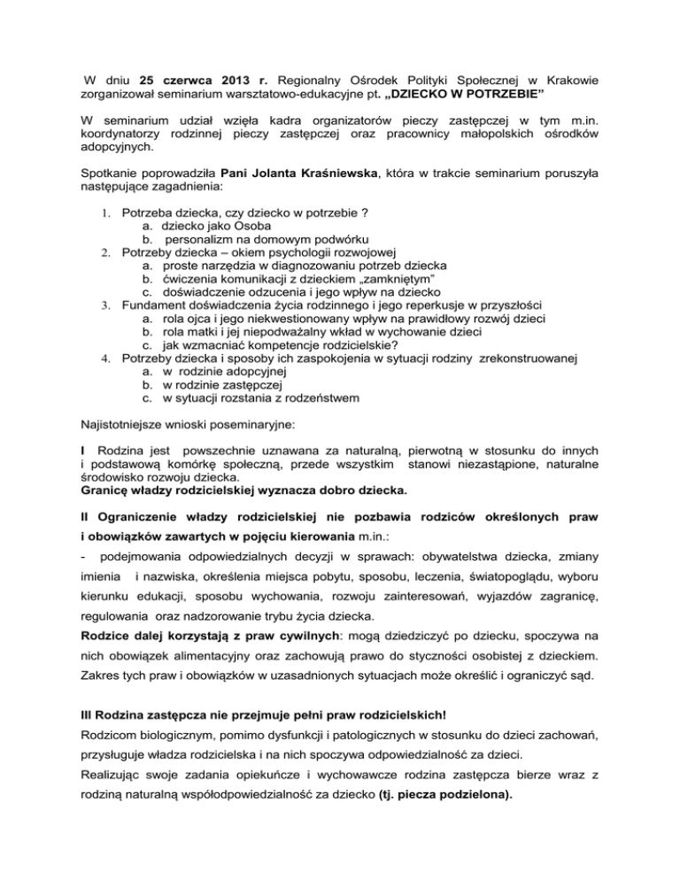 W dniu 25 czerwca 2013 r. Regionalny Ośrodek Polityki Społecznej w Krakowie zorganizował seminarium warsztatowo-edukacyjne pt. „DZIECKO W POTRZEBIE” W seminarium udział wzięła kadra organizatorów pieczy zastępczej w tym m.in. koordynatorzy rodzinnej pieczy zastępczej oraz pracownicy małopolskich ośrodków adopcyjnych. Spotkanie poprowadziła Pani Jolanta Kraśniewska, która w trakcie seminarium poruszyła następujące zagadnienia: 1. Potrzeba dziecka, czy dziecko w potrzebie ? a. dziecko jako Osoba b. personalizm na domowym podwórku 2. Potrzeby dziecka – okiem psychologii rozwojowej a. proste narzędzia w diagnozowaniu potrzeb dziecka b. ćwiczenia komunikacji z dzieckiem „zamkniętym” c. doświadczenie odzucenia i jego wpływ na dziecko 3. Fundament doświadczenia życia rodzinnego i jego reperkusje w przyszłości a. rola ojca i jego niekwestionowany wpływ na prawidłowy rozwój dzieci b. rola matki i jej niepodważalny wkład w wychowanie dzieci c. jak wzmacniać kompetencje rodzicielskie? 4. Potrzeby dziecka i sposoby ich zaspokojenia w sytuacji rodziny zrekonstruowanej a. w rodzinie adopcyjnej b. w rodzinie zastępczej c. w sytuacji rozstania z rodzeństwem Najistotniejsze wnioski poseminaryjne: I Rodzina jest powszechnie uznawana za naturalną, pierwotną w stosunku do innych i podstawową komórkę społeczną, przede wszystkim stanowi niezastąpione, naturalne środowisko rozwoju dziecka. Granicę władzy rodzicielskiej wyznacza dobro dziecka. II Ograniczenie władzy rodzicielskiej nie pozbawia rodziców określonych praw i obowiązków zawartych w pojęciu kierowania m.in.: - podejmowania odpowiedzialnych decyzji w sprawach: obywatelstwa dziecka, zmiany imienia i nazwiska, określenia miejsca pobytu, sposobu, leczenia, światopoglądu, wyboru kierunku edukacji, sposobu wychowania, rozwoju zainteresowań, wyjazdów zagranicę, regulowania oraz nadzorowanie trybu życia dziecka. Rodzice dalej korzystają z praw cywilnych: mogą dziedziczyć po dziecku, spoczywa na nich obowiązek alimentacyjny oraz zachowują prawo do styczności osobistej z dzieckiem. Zakres tych praw i obowiązków w uzasadnionych sytuacjach może określić i ograniczyć sąd. III Rodzina zastępcza nie przejmuje pełni praw rodzicielskich! Rodzicom biologicznym, pomimo dysfunkcji i patologicznych w stosunku do dzieci zachowań, przysługuje władza rodzicielska i na nich spoczywa odpowiedzialność za dzieci. Realizując swoje zadania opiekuńcze i wychowawcze rodzina zastępcza bierze wraz z rodziną naturalną współodpowiedzialność za dziecko (tj. piecza podzielona). IV Rodzic pozbawiony władzy rodzicielskiej zachowuje prawo do styczności z dzieckiem, chyba, że sąd wyda zakaz lub ograniczenie styczności. Sąd może to orzec w postanowieniu o pozbawieniu władzy rodzicielskiej lub w osobnym postanowieniu. V Na rodzinę można spoglądać jako na wiecznych petentów, którym trzeba coś załatwić, bo są niezaradni życiowo, ale można również spostrzegać ich sytuacje jako kryzys i wtedy RAZEM próbować pomóc wyjść im z tego kryzysu. Ważnym jest także, aby spostrzegać rodzinę jako system, ale także nie może zabraknąć spojrzenia na każdą osobę indywidualnie. Można spojrzeć także, jako na miejsce w którym dokonują się najważniejsze procesy rozwojowe w życiu dziecka i całej rodziny. Z punktu widzenia psychologii rozwojowej, można spojrzeć na rodzinę także jako na miejsce najważniejsze dla procesu rozwojowego dziecka i wszystkich członków rodziny, w których doznają: • doświadczenia pierwotnej więzi (lub odrzucenia), • doświadczenia wzajemności/ ufności (lub autostymulacji, lęku), • doświadczenia wolności, autonomii, samodzielności (lub zawstydzenia, zwątpienia), • doświadczenia dobrego autonomicznego sumienia (lub paraliżującego poczucia winy), • doświadczenia bycia potrzebnym (lub poczucia niższości i niedostosowania), • osiągania i wspierania rozwoju tożsamości (lub dezorientacji co do ról), • bycia w intymnej więzi z drugą osobą (lub izolacji), • bycia płodnym (lub pogrążonym w stagnacji), • bilansowania i integrowania życia ku nadziei u kresu V „Jeśli chcę doprowadzić człowieka do pewnego określonego celu, muszę najpierw spotkać go w tym miejscu, gdzie on się znajduje i zacząć właśnie tam. Ten, kto tej umiejętności nie posiada, oszukuje siebie samego myśląc, że potrafi pomóc ludziom. Po to żeby komuś pomóc muszę wprawdzie rozumieć więcej niż on, ale przede wszystkim muszę rozumieć to, co on rozumie. Jeśli tego nie umiem, to nie pomoże to, że potrafię i wiem więcej. A jeśli chcę pokazać, ile umiem, oznacza to, że się wynoszę i jestem próżny i w gruncie rzeczy chcę być podziwiany przez drugiego, zamiast mu pomagać. Każda prawdziwa pomoc zaczyna się od pokory wobec tego, komu chcę pomóc i dlatego muszę pamiętać, że pomoc nie polega na woli panowania nad kimś, lecz na pragnieniu żeby mu służyć. Jeśli tego nie umiem, nie mogę też nikomu pomóc”. Soren Kirkegaard