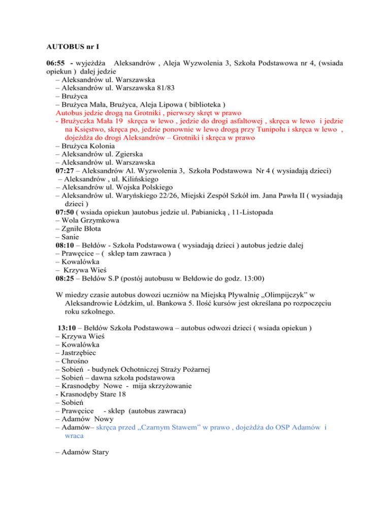 AUTOBUS nr I 06:55 - wyjeżdża Aleksandrów , Aleja Wyzwolenia 3, Szkoła Podstawowa nr 4, (wsiada opiekun ) dalej jedzie – Aleksandrów ul. Warszawska – Aleksandrów ul. Warszawska 81/83 – Brużyca – Brużyca Mała, Brużyca, Aleja Lipowa ( biblioteka ) Autobus jedzie drogą na Grotniki , pierwszy skręt w prawo - Brużyczka Mała 19 skręca w lewo , jedzie do drogi asfaltowej , skręca w lewo i jedzie na Księstwo, skręca po, jedzie ponownie w lewo drogą przy Tunipolu i skręca w lewo , dojeżdża do drogi Aleksandrów – Grotniki i skręca w prawo – Brużyca Kolonia – Aleksandrów ul. Zgierska – Aleksandrów ul. Warszawska 07:27 – Aleksandrów Al. Wyzwolenia 3, Szkoła Podstawowa Nr 4 ( wysiadają dzieci) – Aleksandrów , ul. Kilińskiego – Aleksandrów ul. Wojska Polskiego – Aleksandrów ul. Waryńskiego 22/26, Miejski Zespół Szkół im. Jana Pawła II ( wysiadają dzieci ) 07:50 ( wsiada opiekun )autobus jedzie ul. Pabianicką , 11-Listopada – Wola Grzymkowa – Zgniłe Błota – Sanie 08:10 – Bełdów - Szkoła Podstawowa ( wysiadają dzieci ) autobus jedzie dalej – Prawęcice – ( sklep tam zawraca ) – Kowalówka – Krzywa Wieś 08:25 – Bełdów S.P (postój autobusu w Bełdowie do godz. 13:00) W miedzy czasie autobus dowozi uczniów na Miejską Pływalnię „Olimpijczyk” w Aleksandrowie Łódzkim, ul. Bankowa 5. Ilość kursów jest określana po rozpoczęciu roku szkolnego. 13:10 – Bełdów Szkoła Podstawowa – autobus odwozi dzieci ( wsiada opiekun ) – Krzywa Wieś – Kowalówka – Jastrzębiec – Chrośno – Sobień - budynek Ochotniczej Straży Pożarnej – Sobień – dawna szkoła podstawowa – Krasnodęby Nowe - mija skrzyżowanie - Krasnodęby Stare 18 – Sobień – Prawęcice - sklep (autobus zawraca) – Adamów Nowy – Adamów– skręca przed „Czarnym Stawem” w prawo , dojeżdża do OSP Adamów i wraca – Adamów Stary – Łobódź 13:54 – Aleksandrów Al. Wyzwolenia 3 ,Szkoła Podstawowa Nr 4 (wsiada opiekun i dzieci ) autobus jedzie ul. Kilińskiego , Wojska Polskiego i Waryńskiego ( tam czeka ) 14:15 – Aleksandrów ul. Waryńskiego 22/26, Miejski Zespół Szkół im. Jana Pawła II – ( zabiera dzieci i jedzie ulicami ) – Aleksandrów ul. Warszawska – Aleksandrów ul. Warszawska 81/83 – Brużyca – Brużyca Mała – Brużyca Mała, Brużyca, Aleja Lipowa ( biblioteka ) Autobus jedzie drogą na Grotniki , pierwszy skręt w prawo - Brużyczka Mała 19 skręca w lewo , jedzie do drogi asfaltowej , skręca w lewo i jedzie na Księstwo, skręca po, jedzie ponownie w lewo drogą przy Tunipolu i skręca w lewo , dojeżdża do drogi Aleksandrów – Grotniki i skręca w prawo - Brużyca Kolonia - Aleksandrów , ul. Zgierska - Aleksandrów , ul. Warszawska , Aleja Wyzwolenia 14 :45 – Aleksandrów Al. Wyzwolenia 3,Szkoła Podstawowa Nr 4 ( zabiera dzieci ) i jedzie na ul. Waryńskiego 22/26, Miejski Zespół Szkół im. Jana Pawła II ( zabiera dzieci ) – Aleksandrów ul. Warszawska – Aleksandrów ul. Warszawska 81/83 – Brużyca – Brużyca Mała – Brużyca Mała, Brużyca, Aleja Lipowa ( biblioteka ) Autobus jedzie drogą na Grotniki , pierwszy skręt w prawo - Brużyczka Mała 19 skręca w lewo , jedzie do drogi asfaltowej , skręca w lewo i jedzie na Księstwo, skręca po, jedzie ponownie w lewo drogą przy Tunipolu i skręca w lewo , dojeżdża do drogi Aleksandrów – Grotniki i skręca w prawo - Brużyca Kolonia - Aleksandrów , ul. Zgierska - Aleksandrów , ul. Warszawska , -Ruda bugaj ( zabiera dzieci ) i jedzie na Al. Wyzwolenia ( SP nr 4 ) 15:45 – Aleksandrów Al. Wyzwolenia 3,Szkoła Podstawowa Nr 4 ( zabiera dzieci ) i jedzie na ul. Waryńskiego 22/26, Miejski Zespół Szkół im. Jana Pawła II ( zabiera dzieci ) – Aleksandrów ul. Warszawska – Aleksandrów ul. Warszawska 81/83 – Brużyca – Brużyca Mała – Brużyca Mała, Brużyca, Aleja Lipowa ( biblioteka ) Autobus jedzie drogą na Grotniki , pierwszy skręt w prawo - Brużyczka Mała 19 skręca w lewo , jedzie do drogi asfaltowej , skręca w lewo i jedzie na Księstwo, skręca po, jedzie ponownie w lewo drogą przy Tunipolu i skręca w lewo , dojeżdża do drogi Aleksandrów – Grotniki i skręca w prawo - Brużyca Kolonia – Aleksandrów, ul. Zgierska , Warszawska /koniec trasy AUTOBUS NR 2 06:35 – Aleksandrów , ul. Waryńskiego 22/26 , Miejski Zespół Szkół im. Jana Pawła II ( wsiada opiekun ) – Wola Grzymkowa – Zgniłe Błota – Sanie – Bełdów – Bełdów Las 06:57– Bełdów Szkoła Podstawowa - Bełdów – Bełdów Krzywa Wieś – Kowalówka 07:20 – Aleksandrów ul. Waryńskiego 22/26, Miejski Zespół Szkół (wsiada opiekun) – Aleksandrów ul. Daszyńskiego 41 07:28 – Ruda Bugaj – Szkoła Podstawowa – Nakielnica sklep (autobus zawraca) 07:37 – Ruda Bugaj nr 54 Szkoła Podstawowa – Aleksandrów ul. Daszyńskiego 98, Warszawska, Wojska Polskiego 07:50 – Aleksandrów ul. Waryńskiego22/26, Miejski Zespół Szkół (wsiada opiekun) autobus jedzie - Łobódź – Adamów – Adamów Stary – Adamów Nowy – Chrośno – Sobień – budynek Ochotniczej Straży Pożarnej – Sobień - była Szkoła Podstawowa - Krasnodęby Nowe ( mija skrzyżowanie ) – Krasnodęby Stare 18 ( autobus zawraca) - Jastrzębiec – Kowalówka – Bełdów Krzywa Wieś 08:27 – Bełdów 37 Szkoła Podstawowa ( autobus czeka ) Trasa o długości 68 km W miedzy czasie autobus dowozi uczniów na Miejską Pływalnię „Olimpijczyk” w Aleksandrowie Łódzkim, ul. Bankowa 5. Ilość kursów jest określana po rozpoczęciu roku szkolnego. 13:10 – Bełdów 37 - Szkoła Podstawowa ( wsiada opiekun ) – Bełdów Las – Bełdów – Sanie – Zgniłe Błota – Wola Grzymkowa – Aleksandrów ul. 11 Listopada 13:30 – Aleksandrów ul. Franciszkańska - Zespół Szkół Specjalnych ( zabiera dzieci ) 13:40 – Aleksandrów ul. Waryńskiego 22/26 - Miejski Zespół Szkół im. Jana Pawła II 