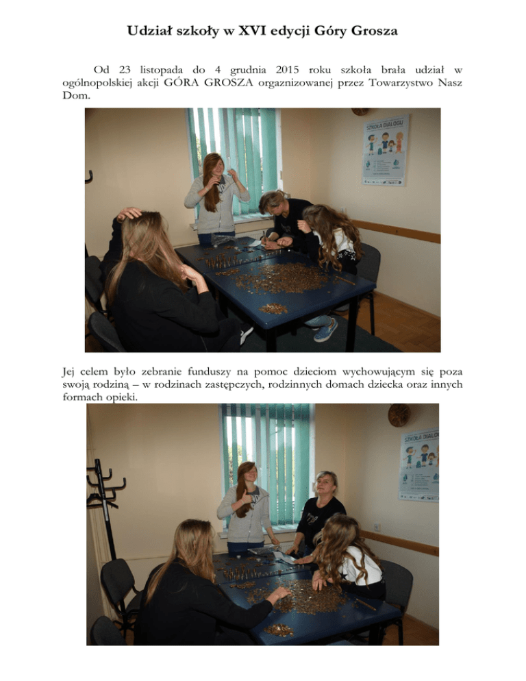 Udział szkoły w XVI edycji Góry Grosza Od 23 listopada do 4 grudnia 2015 roku szkoła brała udział w ogólnopolskiej akcji GÓRA GROSZA orgaznizowanej przez Towarzystwo Nasz Dom. Jej celem było zebranie funduszy na pomoc dzieciom wychowującym się poza swoją rodziną – w rodzinach zastępczych, rodzinnych domach dziecka oraz innych formach opieki. Uczniowie zebrali sto dwadzieścia pięć złotych i trzydzieści cztery grosze. Monety przeliczyły przedstawicielki Samorządu Uczniowskiego: Weronika Król, Alicja Kuk, Kinga Pawełek, Julia Szlachta i Julia Pasterska.