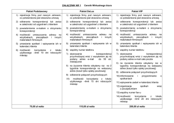 ZAŁĄCZNIK NR 1 Pakiet Podstawowy Cennik Wirtualnego biura Pakiet DeLux Pakiet VIP 1) rejestracja firmy pod naszym adresem, 1) rejestracja firmy pod naszym adresem, 1) rejestracja firmy pod naszym adresem, co potwierdzone jest stosowna umową co potwierdzone jest stosowna umową co potwierdzone jest stosowna umową 2) odbieranie korespondencji lub awiza w zależności od uzgodnień z klientem 2) odbieranie korespondencji lub awiza w zależności od uzgodnień z klientem 2) odbieranie korespondencji lub awiza w zależności od uzgodnień z klientem 3) powiadomienie e-mailem o otrzymaniu 3) powiadomienie e-mailem o otrzymaniu korespondencji 3) powiadomienie e-mailem o otrzymaniu korespondencji 4) możliwość umieszczenia adresu na wizytówkach, pieczątkach i innych materiałach firmowych 4) możliwość umieszczenia adresu na wizytówkach, pieczątkach i innych materiałach firmowych 4) możliwość umieszczenia adresu na wizytówkach, pieczątkach i innych materiałach firmowych 5) umawianie spotkań i wpisywanie ich w kalendarz klienta 5) umawianie spotkań i wpisywanie ich w kalendarz klienta 5) umawianie spotkań i wpisywanie ich w kalendarz klienta 6) możliwość korzystania z lokalu użytkowego –limit 10 dni roboczych/ miesiąc 6) wspólny numer telefonu 6) wspólny numer telefonu 7) skanowanie 7) skanowanie korespondencji korespondencji przychodzącej wraz z wysyłaniem jej na podany adres e-mail do 50 str. miesięcznie 8) na życzenie klienta odsyłamy raz na 2 tygodnie korespondencje na wskazany adres (koszt tylko opłaty pocztowej) 9) odbieranie połączeń przychodzących 10) możliwość korzystania z lokalu użytkowego –limit 15 dni roboczych/ miesiąc korespondencji przychodzącej wraz z wysyłaniem jej na podany adres e-mail cała poczta 8) na życzenie klienta odsyłamy raz w tygodniu korespondencje na wskazany adres (koszt tylko opłaty pocztowej) 9) odbieranie połączeń przychodzących 10) informowanie spotkaniach i przypominanie o 11) wpisywanie zadań w kalendarz klienta 12) organizacja z poczęstunkiem spotkań wraz 13) wspólny numer fax-u 14) możliwość korzystania z lokalu użytkowego –limit 20 dni roboczych/ miesiąc 70,00 zł netto 110,00 zł netto 200,00 zł netto