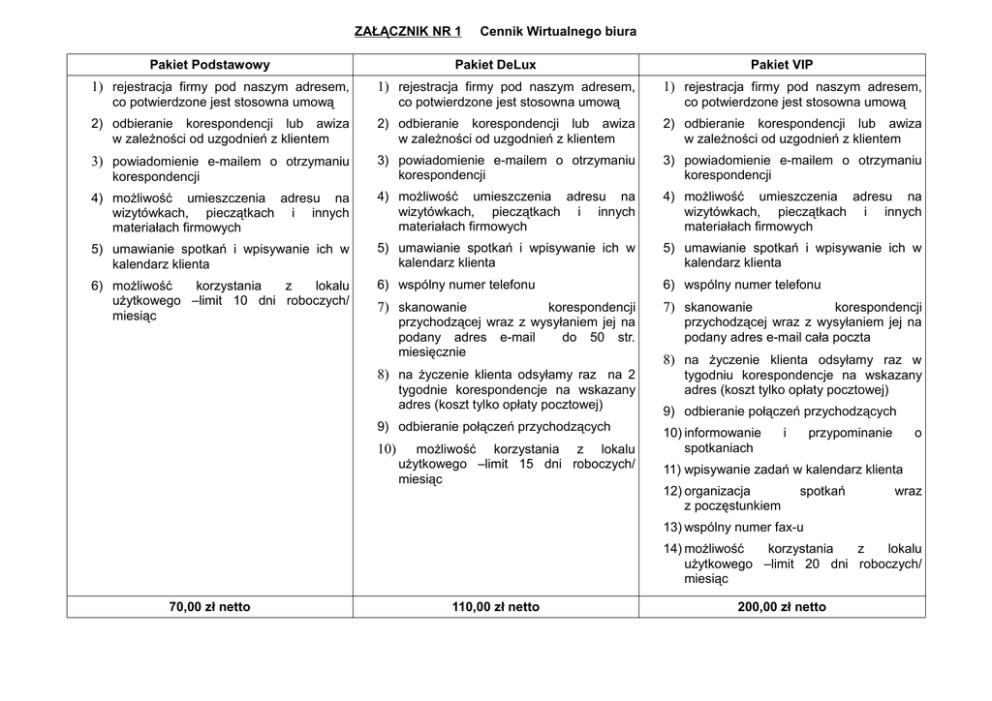 ZAŁĄCZNIK NR 1 Cennik Wirtualnego biura Pakiet Podstawowy