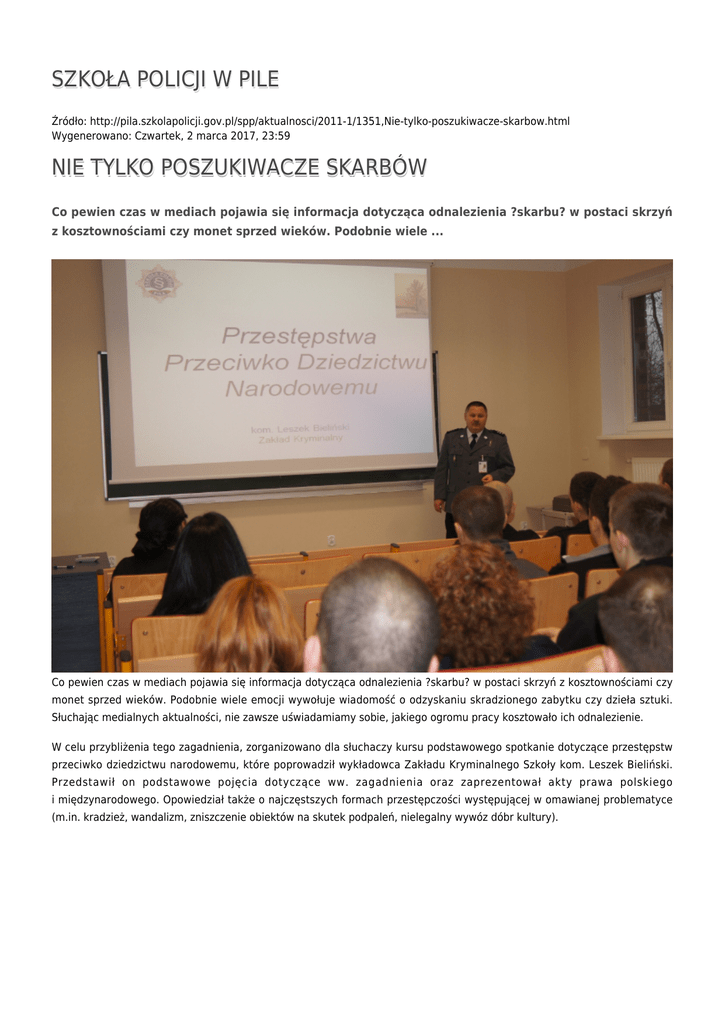 SZKOŁA POLICJI W PILE Źródło: http://pila.szkolapolicji.gov.pl/spp/aktualnosci/2011-1/1351,Nie-tylko-poszukiwacze-skarbow.html Wygenerowano: Czwartek, 2 marca 2017, 23:59 NIE TYLKO POSZUKIWACZE SKARBÓW Co pewien czas w mediach pojawia się informacja dotycząca odnalezienia ?skarbu? w postaci skrzyń z kosztownościami czy monet sprzed wieków. Podobnie wiele ... Co pewien czas w mediach pojawia się informacja dotycząca odnalezienia ?skarbu? w postaci skrzyń z kosztownościami czy monet sprzed wieków. Podobnie wiele emocji wywołuje wiadomość o odzyskaniu skradzionego zabytku czy dzieła sztuki. Słuchając medialnych aktualności, nie zawsze uświadamiamy sobie, jakiego ogromu pracy kosztowało ich odnalezienie. W celu przybliżenia tego zagadnienia, zorganizowano dla słuchaczy kursu podstawowego spotkanie dotyczące przestępstw przeciwko dziedzictwu narodowemu, które poprowadził wykładowca Zakładu Kryminalnego Szkoły kom. Leszek Bieliński. Przedstawił on podstawowe pojęcia dotyczące ww. zagadnienia oraz zaprezentował akty prawa polskiego i międzynarodowego. Opowiedział także o najczęstszych formach przestępczości występującej w omawianej problematyce (m.in. kradzież, wandalizm, zniszczenie obiektów na skutek podpaleń, nielegalny wywóz dóbr kultury). Komisarz Bieliński omówił czynniki mające wpływ na włamania do obiektów zabytkowych i kradzieże dzieł sztuki, a także zaprezentował algorytm powiadomienia i postępowania Policji na miejscu takiego zdarzenia. Prowadzący zaprezentował strukturę i zadania Krajowego Zespołu do Walki z Przestępczością Przeciwko Dziedzictwu Narodowemu działającego w Biurze Kryminalnym KGP oraz zadania komórek o podobnym charakterze, mieszczących się w komendach wojewódzkich oraz Komendzie Stołecznej Policji. Na zakończenie spotkania, które ilustrowane było prezentacją multimedialną, kom. Bieliński nakreślił profil środowiska przestępczego zajmującego się przestępstwami przeciwko dziedzictwu narodowemu oraz zaprezentował ciekawe przykłady spraw związanych z ww. tematem. autor: Anna Fons (09.11.11) Ocena: 0/5 (0) Tweetnij