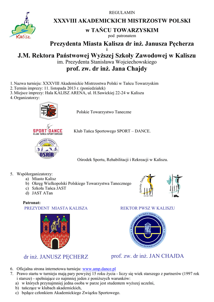 REGULAMIN XXXVIII AKADEMICKICH MISTRZOSTW POLSKI w TAŃCU TOWARZYSKIM pod patronatem Prezydenta Miasta Kalisza dr inż. Janusza Pęcherza i J.M. Rektora Państwowej Wyższej Szkoły Zawodowej w Kaliszu im. Prezydenta Stanisława Wojciechowskiego prof. zw. dr inż. Jana Chajdy 1. Nazwa turnieju: XXXVIII Akademickie Mistrzostwa Polski w Tańcu Towarzyskim 2. Termin imprezy: 11. listopada 2013 r. (poniedziałek) 3. Miejsce imprezy: Hala KALISZ ARENA, ul. H.Sawickiej 22-24 w Kaliszu 4. Organizatorzy: Polskie Towarzystwo Taneczne Klub Tańca Sportowego SPORT – DANCE. Ośrodek Sportu, Rehabilitacji i Rekreacji w Kaliszu. 5. Współorganizatorzy: a) Miasto Kalisz b) Okręg Wielkopolski Polskiego Towarzystwa Tanecznego c) Szkoła Tańca JAST d) JAST ATan Patronat: PREZYDENT MIASTA KALISZA REKTOR PWSZ W KALISZU dr inż. JANUSZ PĘCHERZ prof. zw. dr inż. JAN CHAJDA 6. Oficjalna strona internetowa turnieju: www.amp.dance.pl 7. Prawo startu w turnieju mają pary powyżej 15 roku życia - liczy się wiek starszego z partnerów (1997 rok i starsze) - spełniające co najmniej jeden z poniższych warunków: a) w których przynajmniej jedna osoba w parze jest studentem wyższej uczelni, b) tańczące w klubach akademickich, c) będące członkiem Akademickiego Związku Sportowego. 8. Charakter turnieju: mistrzowski, open, w stylach. 9. Mistrzostwa zostały zatwierdzone przez ZG PTT. 10. Nagrody: medale, puchary i dyplomy dla trzech pierwszych par w każdym stylu, nagrody finansowe dla zwycięzców, upominki i dyplomy dla pozostałych par finałowych, certyfikat uczestnictwa dla studentów. 11. Warunki uczestnictwa: zgodne z przepisami PTT i posiadanie ważnej legitymacji studenckiej albo zaświadczenia o przynależności do klubu studenckiego lub do AZS, dokonanie zgłoszenia na oficjalnej stronie Mistrzostw oraz dokonanie opłaty za udział najpóźniej do 21.X.2013 r. (ponidziałek). W zgłoszeniu należy podać dokładną nazwę uczelni, której jest się studentem wraz z adresem pocztowym, kierunek i rok studiów, styl i klasę taneczną, przynależność klubową – dokładną nazwę członka wspierającego. wpłacenie startowego w wysokości 50;- zł za styl od osoby – na konto: Klub Tańca Sportowego SPORT – DANCE PKO BP IV Oddział we Wrocławiu nr 07 1020 5242 0000 2402 0145 2911 z dopiskiem „XXXVIII AMP, imię i nazwisko pary” Uwaga! W przypadku wniesienia opłaty lub zgłoszenia uczestnictwa pomiędzy 22.X.2013 - 08.XI.2013 r. wysokość opłaty startowej wynosi 100 zł od osoby za styl. W takim przypadku organizatorzy zastrzegają sobie prawo do nieumieszczania informacji o parze w materiałach promocyjnych. Ostateczny termin zgłoszeń-08.XI.2013 r. do godz. 24:00.Nie istnieje możliwość zgłoszenia uczestnictwa w dniu Mistrzostw. w dniu imprezy należy przedstawić oryginał dowodu wpłaty podczas rejestracji. W przypadku nie poinformowania Organizatora Mistrzostw do dnia 08.XI.2013 r. o rezygnacji pary z udziału w Mistrzostwach członek wspierający PTT, klub sportowy FTS ponosi koszty na rzecz organizatora, w wysokości opłaty startowej pary wniesionej po terminie zgłoszeń – 200 zł. Zgłoszenie rezygnacji z udziału w Mistrzostwach jest odnotowywane na stronie internetowej i w dokumentacji Mistrzostw z podaniem par i członków wspierających, których sprawa dotyczy. 12. W czasie Mistrzostw działają: Sędzia Główny (niepunktujący): Komisja Sędziowska: 1. 2. 3. 4. 5. 6. 7. 8. 9. 10. 11. 12. Komisja Skrutacyjna: Przewodnicząca Dyrektor Mistrzostw Dyrektor Artystyczny Mistrzostw Menager projektu Prowadząca Kierownik muzyczny Lekarz Mistrzostw Kierownik Mistrzostw Kazimierz Kurzak Jelenia Góra Marek Bernat Krzysztof Byszewski Włodzimierz Ciok Joanna Dąbrowska Krzysztof Gronuś Antoni Grycmacher Sławomir Grzybek Wojciech Kowalski Tadeusz Krupiński Leszek Lewandowski Wojciech Wójtowicz Piotr Zamorski 1. Dolińska Jolanta 2. Agnieszka Bajda 3. Paweł Kozłowski Olsztyn Białystok Łomianki Warszawa Kraków Szczecin Częstochowa Szczecin Kraków Wrocław Rzeszów Jelenia Góra Wrocław Nowa Ruda Szczecin Mirosław Przybyła Kalisz Bogusława Szczepanik-Zasada Wrocław Zbigniew St. Zasada Wrocław Anna Przewoźniak Poznań podkom. Adam Witiw Wrocław kapelmistrz Orkiestry Komendy Wojewódzkiej Policji we Wrocławiu Dariusz Brzostowski (muzyka mechaniczna) Łódź Zabezpiecza OSRiR Kalisz Tadeusz Teodorowski Wrocław Paulina Zasada / Dagmara Czyż Sekretariat Mistrzostw Zawada / Wrocław 13. Wszelkie sprawy sporne lub nie ujęte w niniejszym Regulaminie rozstrzyga Sędzia Główny w porozumieniu z organizatorem. 14. W sprawach techniczno-organizacyjnych uczestnicy Mistrzostw zobowiązują się podporządkować zaleceniom organizatorów. 15. Uczestnicy ubezpieczają się na koszt własny lub instytucji delegującej. 16. Rzeczy wartościowe można oddać do depozytu. Nie odpowiadamy za rzeczy pozostawione w szatni. 17. Bilety wstępu: a) część eliminacyjna: - bilet normalny – 20 zł, ulgowy (student, uczeń, emeryt, rencista) – 10 zł b) część galowa: - sektor A – bilet normalny – 35 zł; ulgowy (student, uczeń) – 20 zł - sektory B, C – bilet normalny – 25 zł, ulgowy (student uczeń, rencista, emeryt) – 15 zł dzieci do lat 7 bezpłatnie. c) miejsce przy stoliku (tylko w przedsprzedaży – ilość miejsc ograniczona): 160 zł (plan widowni - oficjalna strona AMP – www.amp.dance.pl) 18. Dokonanie zgłoszenia i udział w XXXVIII Akademickich Mistrzostwach Polski w Tańcu Towarzyskim równoznaczne jest z wyrażeniem na zawsze i bezwarunkowo nieodpłatnej zgody na rejestrację fotograficzną, video, internetową i telewizyjną wszystkich prezentacji oraz ich wykorzystanie, publikację i emisję w dowolnych mediach przez Polskie Towarzystwo Taneczne oraz przez organizatorów, na potrzeby organizowanych Akademickich Mistrzostw Polski, a także na wykorzystanie danych osobowych w materiałach z Mistrzostw. 19. W przypadku wycofania się uczest