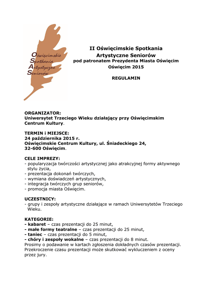 II Oświęcimskie Spotkania Artystyczne Seniorów pod patronatem Prezydenta Miasta Oświęcim Oświęcim 2015 REGULAMIN ORGANIZATOR: Uniwersytet Trzeciego Wieku działający przy Oświęcimskim Centrum Kultury. TERMIN i MIEJSCE: 24 października 2015 r. Oświęcimskie Centrum Kultury, ul. Śniadeckiego 24, 32-600 Oświęcim. CELE IMPREZY: - popularyzacja twórczości artystycznej jako atrakcyjnej formy aktywnego stylu życia, - prezentacja dokonań twórczych, - wymiana doświadczeń artystycznych, - integracja twórczych grup seniorów, - promocja miasta Oświęcim. UCZESTNICY: - grupy i zespoły artystyczne działające w ramach Uniwersytetów Trzeciego Wieku. KATEGORIE: - kabaret – czas prezentacji do 25 minut, - małe formy teatralne – czas prezentacji do 25 minut, - taniec – czas prezentacji do 5 minut, - chóry i zespoły wokalne – czas prezentacji do 8 minut. Prosimy o podawanie w kartach zgłoszenia dokładnych czasów prezentacji. Przekroczenie czasu prezentacji może skutkować wykluczeniem z oceny przez jury. PREZENTACJA: 1. Prezentacje mogą się odbywać z towarzyszeniem instrumentów lub z podkładem muzycznym nagranym na CD lub na mini disc. 2. Na płycie CD lub na mini disc powinien znajdować się tylko 1 nagrany utwór. 3. W przypadku wykorzystywania do prezentacji rekwizytów i dekoracji czas montażu scenografii nie może przekroczyć 15 minut, a demontażu 10 minut. Prosimy o podawanie w kartach zgłoszenia jak najbardziej zbliżonych czasów montażu i demontażu dekoracji. 4. Ze względów organizacyjnych nie jest przewidziany czas na próby dla grup biorących udział w konkursie. OCENA: Prezentacje oceniać będzie profesjonalne jury. Decyzje jury są ostateczne i niepodważalne. NAGRODY: Jury przyzna wyróżnienia w każdej kategorii oraz nagrodę Grand Prix. WARUNKI UCZESTNICTWA: 1. Dostarczenie do organizatora prawidłowo wypełnionej karty zgłoszenia w nieprzekraczalnym terminie do 25 września 2015 r., na adres: Oświęcimskie Centrum Kultury, ul. Śniadeckiego 24, 32-600 Oświęcim z dopiskiem: II Oświęcimskie Spotkania Artystyczne Seniorów lub e-mailem: [email protected] 2. O zakwalifikowaniu zespołu decyduje kolejność zgłoszenia. Liczba zespołów biorących udział w spotkaniach jest ograniczona. 3. Wszelkie interpretacje zasad uczestnictwa leżą w gestii organizatora. INNE INFORMACJE: 1. Program oraz kolejność prezentacji będzie przesłana e-mailem oraz podana na stronie www.ock.org.pl do 14 października 2015 r. 2. Wymiary sceny: 8m (szerokość) x 8m (głębokość). 3. Scena jest okotarowana, z oświetleniem i nagłośnieniem, do dyspozycji fortepian do akompaniamentu. 4. Uczestnicy przyjeżdżają oraz ubezpieczają się na koszt własny lub instytucji delegującej. 5. W budynku Oświęcimskiego Centrum Kultury jest restauracja, w której można zjeść posiłek w atrakcyjnej cenie. 6. Organizator zastrzega sobie wyłączne prawo ustalania kolejności prezentacji konkursowych. 7. II Oświęcimskie Spotkania Artystyczne Seniorów rozpoczną się o godzinie 10:00. Informacji udzielają: Łucja Jurys, Tacjana Malicka, Małgorzata Szczerska, Mirosław Śliwa, e-mail: [email protected] Biuro organizacyjne: Oświęcimskie Centrum Kultury, 32-600 Oświęcim, ul. Śniadeckiego 24, tel. (33) 842 44 61, 842 57 82.