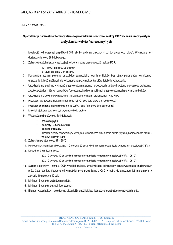 ZAŁĄCZNIK nr 1 do ZAPYTANIA OFERTOWEGO nr 3 ____________________________________________________________ DRP-PREW-ME/3/RT Specyfikacja parametrów termocyklera do prowadzenia ilościowej reakcji PCR w czasie rzeczywistym z użyciem barwników fluorescencyjnych 1. Możliwość jednoczesnej amplifikacji 384 lub 96 prób (w zależności od dostarczonego bloku). Wymagane jest dostarczenie bloku 384-dołkowego. 2. Zakres objętości mieszany reakcyjnej, w której można przeprowadzić reakcję PCR: 3. − 10 – 100µl dla bloku 96 dołków − 5 – 20µl dla bloku 384 dołków. Konstrukcja aparatu powinna umożliwiać samodzielną wymianę bloków bez utraty parametrów technicznych urządzenia tj. ilość możliwych do wykorzystania przy analizie kanałów detekcji / wzbudzenia. 4. Urządzenie nie powinno wymagać przeprowadzania żadnych okresowych kalibracji systemu optycznego związanych z wykorzystaniem różnych barwników fluorescencyjnych oraz kalibracji przeprowadzanych po wymianie bloków. 5. Urządzenie nie powinno wymagać normalizacji z barwnikiem referencyjnym typu Rox. 6. Prędkość nagrzewania bloku minimalnie do 4,8°C / sek. (dla bloku 384-dołkowego) 7. Prędkość chłodzenia bloku minimalnie do 2,5°C / sek. (dla bloku 384-dołkowego) 8. Materiał z jakiego powinien być wykonany blok: srebro 9. Wyposażenie bloków (96 / 384 dołkowe): − − − − podstawa płytki elementy Peltiera (6 sztuk) element chłodzący korektor cieplny zapewniający wydajne i równomierne przenikanie ciepła (wysoką homogenność bloku) – warstwa Therma-Base 10. Zakres temperatur bloku: 37 – 95°C 11. Homogenność termiczna bloku: ±0,4°C w ciągu 60 sekund od momentu osiągnięcia temperatury docelowej (72°C) 12. Dokładność termiczna bloku: ±0,3°C w ciągu 10 sekund od momentu osiągnięcia temperatury docelowej (55°C - 95°C) ±0,2°C w ciągu 60 sekund od momentu osiągnięcia temperatury docelowej (55°C - 95°C) 13. System detekcyjny – kamera CCD wysokiej czułości, umożliwiająca jednoczesny odczyt wszystkich analizowanych prób. Czas pomiaru fluorescencji wszystkich prób przez kamerę CCD w trybie dynamicznym lub manualnym, w zakresie 10 msek. do 10 sek. 14. Minimum 5 kanałów wzbudzenia światła 15. Minimum 6 kanałów detekcji fluorescencji 16. Element wzbudzający – pojedyncza dioda LED umożliwiająca jednoczesne wzbudzenie wszystkich prób. ___________________________________________________________________________ READ-GENE SA, ul.Akacjowa 2, 71-253 Szczecin Adres do korespondencji: Centrum Badawczo-Rozwojowe READ-GENE SA, Grzepnica, ul. Alabastrowa 8, 72-003 Dobra tel.: 91 4334256, fax: 91 8524433, e-mail: [email protected] www.read-gene.com ZAŁĄCZNIK nr 1 do ZAPYTANIA OFERTOWEGO nr 3 ____________________________________________________________ 17. System otwarty, umożliwiający analizę kwasów nukleinowych przy pomocy różnych barwników i sond molekularnych: − SYBR Green I − Barwnik interkalujący typu LC Green (lub podobny) do analizy HRM (High Resolution Melting) − Sonda hydrolizująca typu TaqMan® − Sonda Hybrydyzująca typu HybProbe® − Sonda Simple Probe® 18. Oprogramowanie urządzenia umożliwiające wykonanie: − − − − Pomiar ilości kopii DNA w badanej próbie Pomiar poziomu ekspresji genu badanego w stosunku do genu referencyjnego Analizy genotypowania – analiza genotypu na podstawie temperatury topnienia produktu Analizy Gene Scanning / High Resolution Melting służąca do analizy mutacji (w tym SNP) przy pomocy specjalnego barwnika interkalującego typu LC Green lub podobny − Analizy end-point mutation − Porównania płytek z wynikami dla wszystkich dostępnych aplikacji z uzyskaniem wyniku w oprogramowaniu typu MS Excel 19. Możliwość wykonania analizy Gene Scanning / High Resolution Melting bez konieczności wprowadzania standardów o znanym genotypie; poszczególne krzywe mogą być łączone w grupy automatycznie, na podstawie swojego podobieństwa. 20. Możliwość obserwowania przeprowadzanej reakcji PCR na bieżąco podczas jej trwania (online) 21. Oprogramowanie aparatu i baza danych z opcją automatycznego zapisywania informacji o wszystkich zmianach w plikach z otrzymanymi wynikami dokonywanych przez użytkowników aparatu (tzw. „traceable database”) – zgodność z wymaganiami normy 21 CFR część 11 (bez funkcji podpisu elektronicznego). 22. Możliwość utworzenia pliku z podsumowaniem reakcji PCR (m.in. parametry reakcji PCR, wyniki, wykresy) w formacie .pdf 23. Producent aparatu powinien jednocześnie posiadać w swojej ofercie katalogowej zestawy odczynników (SYBR Green I, odczynnik interkalujący typu LC Green, sondy) dostosowane i zoptymalizowane do pracy na oferowanym aparacie. 24. Producent aparatu powinien jednocześnie posiadać w swojej ofercie katalogowej gotowe zestawy / biblioteki sond molekularnych umożliwiających analizę cDNA / DNA człowieka 25. Dodatkowe wyposażenie aparatu: komputer do sterowania aparatem i analizy danych o minimalnych parametrach: − − − − − − Procesor: Intel Pentium Dual Core E2160, 1,8 GHz Pamięć RAM: 2GB (2 x 1GB) Dysk twardy: 2 x 160 GB Napęd optyczny CD/DVD-ROM Gniazda PCI: 2 gniazda PCI pełnej wysokości, 1 gniazdo PCI Express x1 typu low; porty USB: 6 sztuk 26. Instrukcja do aparatu powinna być przygotowana w pełnej wersji w języku polskim oraz angielskim. ___________________________________________________________________________ READ-GENE SA, ul.Akacjowa 2, 71-253 Szczecin Adres do korespondencji: Centrum Badawczo-Rozwojowe READ-GENE SA, Grzepnica, ul. Alabastrowa 8, 72-003 Dobra tel.: 91 4334256, fax: 91 8524433, e-mail: [email protected] www.read-gene.com