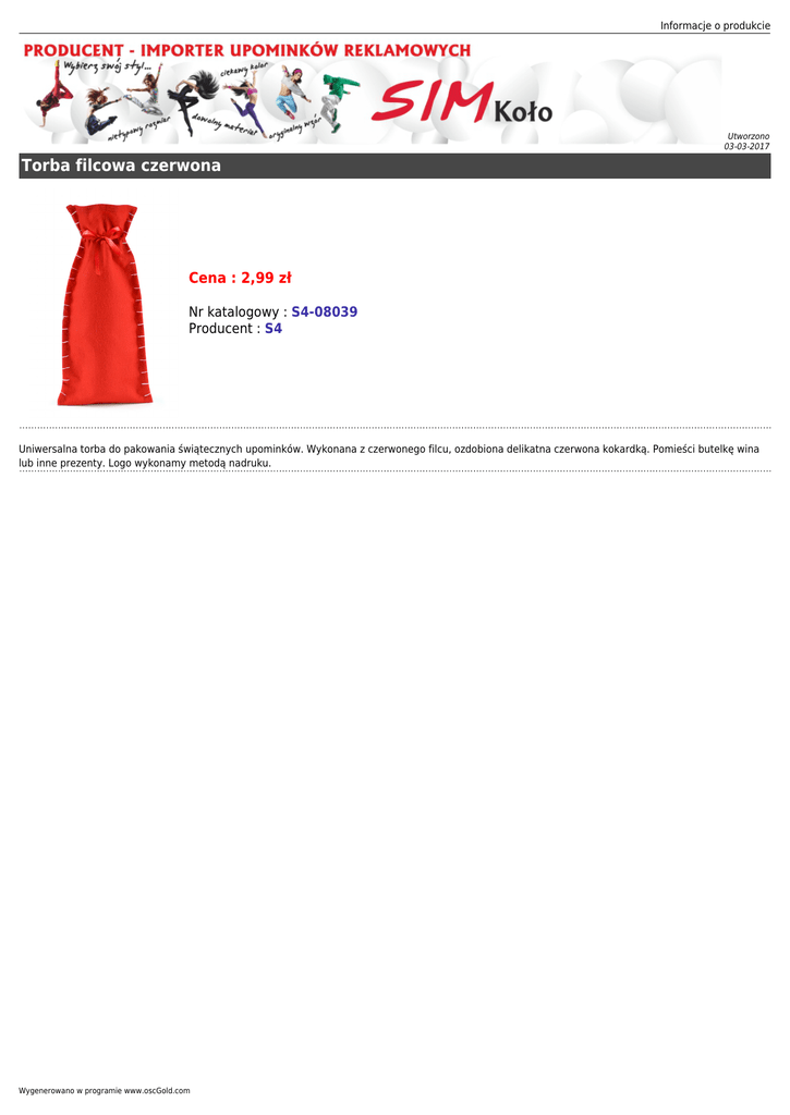 Informacje o produkcie Utworzono 03-03-2017 Torba filcowa czerwona Cena : 2,99 zł Nr katalogowy : S4-08039 Producent : S4 Uniwersalna torba do pakowania świątecznych upominków. Wykonana z czerwonego filcu, ozdobiona delikatna czerwona kokardką. Pomieści butelkę wina lub inne prezenty. Logo wykonamy metodą nadruku. Wygenerowano w programie www.oscGold.com