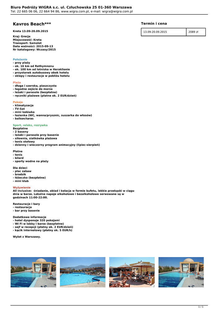 Biuro Podróży WIGRA s.c. ul. Człuchowska 25 01-360 Warszawa Tel. 22 665 06 06, 22 664 94 86, www.wigra.com.pl, e-mail: [email protected] Kavros Beach*** Kreta 13.09-20.09.2015 Termin i cena 13.09-20.09.2015 2089 zł Kraj: Grecja Miejscowość: Kreta Transport: Samolot Data ważności: 2015-09-13 Nr katalogowy: Wczasy/2015 Położenie - przy plaży - ok. 16 km od Rethymnonu - ok. 100 km od lotniska w Heraklionie - przystanek autobusowy obok hotelu - sklepy i restauracje w pobliżu hotelu Plaża - długa i szeroka, piaszczysta - łagodne zejście do morza - leżaki i parasole (bezpłatne) - ręczniki plażowe (płatne ok. 2 EUR/dzień) Pokoje - klimatyzacja - TV-Sat - mini lodówka - łazienka (WC, wanna/prysznic, suszarka do włosów) - balkon/taras Sport, relaks, rozrywka Bezpłatne - 2 baseny - leżaki i parasole przy basenie - siłownia, siatkówka plażowa - tenis stołowy - dzienny i wieczorny program animacyjny (lipiec-sierpień) Płatne - tenis - bilard - sporty wodne na plaży Dla dzieci - plac zabaw - brodzik - łóżeczko (bezpłatne) - mini klub Wyżywienie All inclusive: śniadanie, obiad i kolacja w formie bufetu, lekkie przekąski w ciągu dnia w barze. Lokalne napoje alkoholowe i bezalkoholowe serwowane są w godzinach 11:00-22:00. Restauracje i bary - restauracja - bar przy basenie Dodatkowe informacje - hotel dysponuje 320 pokojami - Wi Fi w lobby i barze (bezpłatne) - sejf w recepcji (płatny ok. 2 EUR/dzień) - kącik internetowy (płatny ok. 5 EUR/h) Wylot z Warszawy. 1/1 Powered by TCPDF (www.tcpdf.org)