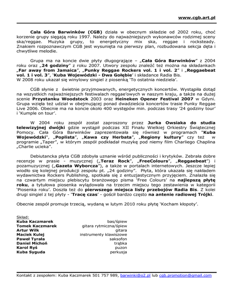 www.cgb.art.pl Cała Góra Barwinków (CGB) działa w obecnym składzie od 2002 roku, choć korzenie grupy sięgają roku 1997. Należy do najważniejszych wykonawców rodzimej sceny ska/reggae. Muzyka grupy, to energetyczny mix ska, reggae i rocksteady. Znakiem rozpoznawczym CGB jest wysunięta na pierwszy plan, rozbudowana sekcja dęta i chwytliwe melodie. Grupa ma na koncie dwie płyty długogrające – „Cała Góra Barwinków” z 2004 roku oraz „24 godziny” z roku 2007. Utwory zespołu znaleźć też można na składankach „Far away from Jamaica”, „Punky Reggae Rockers vol. 1 i vol. 2” i „Reggaebeat vol. 1 i vol. 3”, ‘Kuba Wojewódzki - Dwa Gołębie’ i składance Radia Bis. W 2008 roku ukazał się winylowy singiel z piosenką ‘To ostatnia niedziela’. CGB słynie z świetnie przyjmowanych, energetycznych koncertów. Wystąpiła dotąd na wszystkich najważniejszych festiwalach reggae’owych w naszym kraju, a także na dużej scenie Przystanku Woodstock 2003 oraz Heineken Opener Festival 2007 w Gdyni. Grupa wzięła też udział w obejmującej ponad dwadzieścia koncertów trasie Punky Reggae Live 2006. Obecnie ma na koncie około 400 występów min. podczas trasy ’24 godziny tour’ i ‘Kumple on tour’. W 2004 roku zespół został zaproszony przez Jurka Owsiaka do studia telewizyjnej dwójki gdzie wystąpił podczas XII Finału Wielkiej Orkiestry Świątecznej Pomocy. Cała Góra Barwinków zaprezentowała się również w programach "Kuba Wojewódzki", „Poplista”, „Kawa czy Herbata”, „Regiony kultury” czy też w programie „Taper”, w którym zespół podkładał muzykę pod niemy film Charliego Chaplina „Charlie ucieka”. Debiutancka płyta CGB zdobyła uznanie wśród publiczności i krytyków. Zebrała dobre recenzje w prasie - muzycznej („Teraz Rock”, „FreeColours”, „Reggaebeat”) i pozamuzycznej („Gazeta Wyborcza”), a także w portalach internetowych. Jeszcze lepiej wiodło się kolejnej produkcji zespołu pt. „24 godziny”. Płyta, która ukazała się nakładem wydawnictwa Rockers Publishing, spotkała się z entuzjastycznym przyjęciem. Znalazła się na czwartym miejscu plebiscytu branżowego pisma ‘Free Colours’ na najlepszą płytę roku, a tytułowa piosenka wylądowała na trzecim miejscu tego zestawienia w kategorii ‘Piosenka roku’. Doszła też do pierwszego miejsca listy przebojów Radia Bis. Z kolei drugi singiel z tej płyty - ‘Tracę czas’ - gościł bardzo często na antenie radiowej Trójki. Obecnie zespół promuje trzecią, wydaną w lutym 2010 roku płytę ‘Kocham kłopoty’. Skład: Kuba Kaczmarek Tomek Kaczmarek Artur Wilk Maciek Kulej Paweł Tyrała Daniel Michoń Karol Ryś Kuba Syguda bas/śpiew gitara rytmiczna/śpiew gitara instrumenty klawiszowe saksofon trąbka puzon perkusja Kontakt z zespołem: Kuba Kaczmarek 501 757 989, [email protected] lub [email protected]