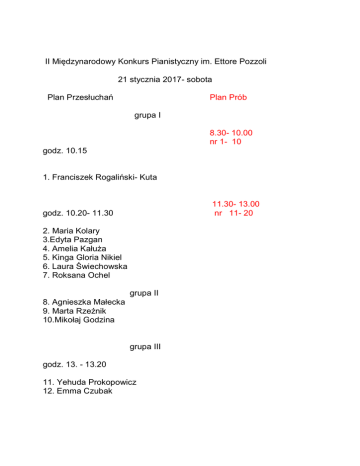 II Międzynarodowy Konkurs Pianistyczny im. Ettore Pozzoli 21 stycznia 2017- sobota Plan Przesłuchań Plan Prób grupa I 8.30- 10.00 nr 1- 10 godz. 10.15 1. Franciszek Rogaliński- Kuta 11.30- 13.00 nr 11- 20 godz. 10.20- 11.30 2. Maria Kolary 3.Edyta Pazgan 4. Amelia Kałuża 5. Kinga Gloria Nikiel 6. Laura Świechowska 7. Roksana Ochel grupa II 8. Agnieszka Małecka 9. Marta Rzeźnik 10.Mikołaj Godzina grupa III godz. 13. - 13.20 11. Yehuda Prokopowicz 12. Emma Czubak grupa IV 13.20- 14.30 13. 14. 15. 16. Pola Czubak Magdalena Surmacz Martyna Włodarczyk Jadwiga Mglej grupa V 14.30- 15.45 17. Julia Gałkowska 18. Hanna Czubak 19. Kamil Dąbek 20. Weronika Bujok Koncert Laureatów odbędzie się w niedzielę 22 stycznia 2017 godz. 16.00, w Sali Koncertowej Akademii Muzycznej w Krakowie.