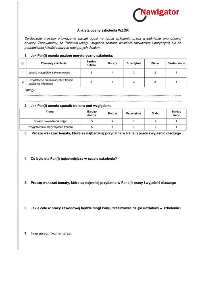 Ankieta oceny szkolenia WZÓR Serdecznie prosimy o wyrażenie swojej opinii na temat szkolenia przez wypełnienie anonimowej ankiety. Zapewniamy, że Państwa uwagi i sugestie zostaną wnikliwie rozważone i przyczynią się do podniesienia jakości naszych następnych działań. 1. Jak Pan(i) ocenia poziom merytoryczny szkolenia: Lp. Elementy szkolenia Bardzo dobrze Dobrze Przeciętnie Słabo Bardzo słabo 1 Jakość materiałów szkoleniowych 5 4 3 2 1 2 Przydatność przekazanych w trakcie szkolenia informacji 5 4 3 2 1 Uwagi: ................................................................................................................................................................... ................................................................................................................................................................... 2. Jak Pan(i) ocenia sposób trenera pod względem: 3. Trener Bardzo dobrze Dobrze Przeciętnie Słabo Bardzo słabo Sposób prowadzenia zajęć 5 4 3 2 1 Przygotowanie merytoryczne trenera 5 4 3 2 1 Proszę wskazać tematy, które są najbardziej przydatne w Pana(i) pracy i wyjaśnić dlaczego 4. Co było dla Pan(i) najcenniejsze w czasie szkolenia? 5. Proszę wskazać tematy, które są najmniej przydatne w Pana(i) pracy i wyjaśnić dlaczego 6. Jakie cele w pracy zawodowej będzie mógł Pan(i) zrealizować dzięki udziałowi w szkoleniu? 7. Inne uwagi i komentarze: