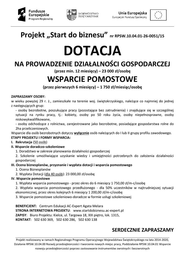 Projekt „Start do biznesu” nr RPSW.10.04.01-26-0051/15 DOTACJA NA PROWADZENIE DZIAŁALNOŚCI GOSPODARCZEJ (przez min. 12 miesięcy) – 23 000 zł/osobę WSPARCIE POMOSTOWE (przez pierwszych 6 miesięcy) – 1 750 zł/miesiąc/osobę ZAPRASZAMY OSOBY: w wieku powyżej 29 r. ż., zamieszkałe na terenie woj. świętokrzyskiego, należące co najmniej do jednej z następujących grup: - osoby bezrobotne, poszukujące pracy (pozostające bez zatrudnienia) i znajdujące się w szczególnej sytuacji na rynku pracy, tj.: kobiety, osoby po 50 roku życia, osoby niepełnosprawne, osoby niskowykwalifikowane, - osoby odchodzące z rolnictwa, zarejestrowane jako bezrobotne, posiadające gospodarstwa rolne do 2ha przeliczeniowych. Wsparcie dla osób bezrobotnych dotyczy wyłącznie osób należących do I lub II grupy profilu zawodowego. ETAPY PROJEKTU I FORMY WSPARCIA: I. Rekrutacja (50 osób) II. Wsparcie doradczo-szkoleniowe 1. Doradztwo w zakresie planowania działalności gospodarczej 2. Szkolenie umożliwiające uzyskanie wiedzy i umiejętności potrzebnych do założenia działalności gospodarczej III. Ocena biznesplanów, przyznanie i wypłata dotacji i wsparcia pomostowego 1. Ocena Biznesplanów 2. Wypłata Dotacji (dla 40 osób): 23 000,00 zł/osobę IV. Wsparcie pomostowe 1. Wypłata wsparcia pomostowego - przez okres do 6 miesięcy 1 750,00 zł/m-c/osobę 2. Wypłata wsparcia pomostowego przedłużonego - dla 50% uczestników w najtrudniejszej sytuacji ekonomicznej, przez okres kolejnych 6 miesięcy 1 200,00 zł/m-c/osobę 3. Wsparcie pomostowe szkoleniowo-doradcze w formie usługi szkoleniowej BENEFICJENT: Centrum Edukacji AC-Expert Agata Melara STRONA INTERNETOWA PROJEKTU: www.startdobiznesu.ac-expert.pl ZAPISY: Biuro Projektu: Kielce, ul. Targowa 18, XIII piętro, lok. 1315, KONTAKT: 502 630 369, 502 630 286, 502 630 138 SERDECZNIE ZAPRASZAMY Projekt realizowany w ramach Regionalnego Programu Operacyjnego Województwa Świętokrzyskiego na lata 2014-2020, Działanie RPSW.10.04.00 Rozwój przedsiębiorczości i tworzenie nowych miejsc pracy, Poddziałanie RPSW.10.04.01 Wsparcie rozwoju przedsiębiorczości poprzez zastosowanie instrumentów zwrotnych i bezzwrotnych