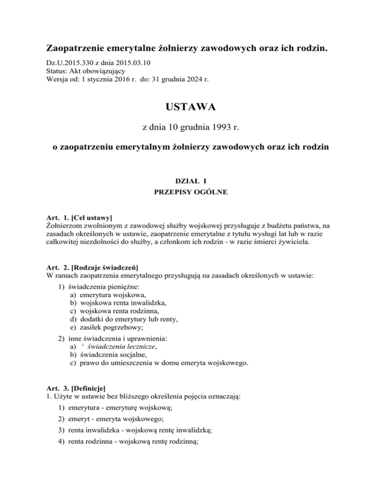Zaopatrzenie emerytalne żołnierzy zawodowych oraz ich rodzin. Dz.U.2015.330 z dnia 2015.03.10 Status: Akt obowiązujący Wersja od: 1 stycznia 2016 r. do: 31 grudnia 2024 r. USTAWA z dnia 10 grudnia 1993 r. o zaopatrzeniu emerytalnym żołnierzy zawodowych oraz ich rodzin DZIAŁ I PRZEPISY OGÓLNE Art. 1. [Cel ustawy] Żołnierzom zwolnionym z zawodowej służby wojskowej przysługuje z budżetu państwa, na zasadach określonych w ustawie, zaopatrzenie emerytalne z tytułu wysługi lat lub w razie całkowitej niezdolności do służby, a członkom ich rodzin - w razie śmierci żywiciela. Art. 2. [Rodzaje świadczeń] W ramach zaopatrzenia emerytalnego przysługują na zasadach określonych w ustawie: 1) świadczenia pieniężne: a) emerytura wojskowa, b) wojskowa renta inwalidzka, c) wojskowa renta rodzinna, d) dodatki do emerytury lub renty, e) zasiłek pogrzebowy; 2) inne świadczenia i uprawnienia: a) 1 świadczenia lecznicze, b) świadczenia socjalne, c) prawo do umieszczenia w domu emeryta wojskowego. Art. 3. [Definicje] 1. Użyte w ustawie bez bliższego określenia pojęcia oznaczają: 1) emerytura - emeryturę wojskową; 2) emeryt - emeryta wojskowego; 3) renta inwalidzka - wojskową rentę inwalidzką; 4) renta rodzinna - wojskową rentę rodzinną; 5) rencista - rencistę wojskowego; 6) renta - wojskową rentę inwalidzką lub wojskową rentę rodzinną; 7) wysługa emerytalna - okresy służby wojskowej w Wojsku Polskim i im równorzędne, łącznie z okresami, o których mowa w art. 14 i 16; 8) uposażenie - uposażenie zasadnicze wraz z dodatkami o charakterze stałym i miesięczną równowartością dodatkowego uposażenia rocznego, należnych żołnierzowi zawodowemu stosownie do przepisów ustawy z dnia 11 września 2003 r. o służbie wojskowej żołnierzy zawodowych (Dz. U. z 2014 r. poz. 1414 i 1822); 9) najniższa emerytura lub renta - kwotę najniższej emerytury lub renty w rozumieniu ustawy z dnia 17 grudnia 1998 r. o emeryturach i rentach z Funduszu Ubezpieczeń Społecznych (Dz. U. z 2013 r. poz. 1440, z późn. zm.), zwanej dalej "ustawą o emeryturach i rentach z Funduszu Ubezpieczeń Społecznych"; 10) okresy składkowe i nieskładkowe - okresy uregulowane ustawą o emeryturach i rentach z Funduszu Ubezpieczeń Społecznych; 11) (uchylony) 12) płatnik składek - płatnika składek, o którym mowa w przepisach o systemie ubezpieczeń społecznych; 13) wojskowy organ emerytalny - organ emerytalny właściwy w sprawach ustalania prawa do zaopatrzenia emerytalnego i wysokości świadczeń pieniężnych z tytułu tego zaopatrzenia, określony przez Ministra Obrony Narodowej; 14) dom emeryta wojskowego - placówkę całodobową dla osób uprawnionych do zaopatrzenia emerytalnego oraz członków ich rodzin, prowadzoną przez Ministra Obrony Narodowej, świadczącą usługi bytowe i opiekuńcze na poziomie obowiązującego standardu określonego dla domów pomocy społecznej. 2. Emerytem wojskowym jest żołnierz zwolniony z zawodowej służby wojskowej, który ma ustalone prawo do emerytury wojskowej. 3. Rencistą wojskowym jest żołnierz zwolniony z zawodowej służby wojskowej, który ma ustalone prawo do wojskowej renty inwalidzkiej. Art. 4. [Okres składkowy] Okresy służby żołnierzy, którzy nie nabywają prawa do zaopatrzenia emerytalnego na podstawie ustawy, oraz służby określonej w art. 13 ust. 2 uważa się za okresy składkowe w myśl przepisów ustawy o emeryturach i rentach z Funduszu Ubezpieczeń Społecznych. Art. 5. [Podstawa wymiaru emerytury lub renty inwalidzkiej] 1. Podstawę wymiaru emerytury lub renty inwalidzkiej stanowi uposażenie należne żołnierzowi zawodowemu w ostatnim miesiącu pełnienia zawodowej służby wojskowej, z zastrzeżeniem ust. 2 i 3 oraz art. 32b. 2. Podstawę wymiaru emerytury lub renty inwalidzkiej w przypadku żołnierzy, którzy nie otrzymują uposażenia, o którym mowa w ust. 1, albo otrzymują je w niepełnej wysokości, stanowi pełna kwota uposażenia należnego żołnierzowi na ostatnio zajmowanym stanowisku służbowym, z uwzględnieniem zmian mających wpływ na prawo do uposażenia lub jego wysokości powstałych w okresie, w którym żołnierz nie otrzymywał uposażenia lub otrzymywał je w niepełnej wysokości. 3. Jeżeli w okresie między zwolnieniem z zawodowej służby wojskowej żołnierza zawodowego a ustaleniem prawa do emerytury i renty inwalidzkiej przypadały waloryzacje emerytur i rent inwalidzkich, przy ustalaniu podstawy wymiaru tych świadczeń uwzględnia się wszystkie kolejne waloryzacje przypadające w tym okresie. Art. 6. [Waloryzacja świadczeń] Emerytury i renty oraz podstawy ich wymiaru podlegają waloryzacji na zasadach i w terminach przewidzianych w ustawie z dnia 17 grudnia 1998 r. o emeryturach i rentach z Funduszu Ubezpieczeń Społecznych, z tym że: 1) waloryzacja, o której mowa w art. 88 tej ustawy, obejmuje emerytury i renty osób: a) którym prawo do świadczenia ustalono przed dniem 1 marca, b) które nabyły prawo do renty rodzinnej po żołnierzach zawodowych zmarłych nie później niż w ostatnim dniu lutego. 2) (uchylony) Art. 6a. [Przekazanie składek do ZUS] 1. Jeżeli żołnierz zwolniony z czynnej służby nie spełnia warunków do nabycia prawa do emerytury wojskowej lub wojskowej renty inwalidzkiej, od uposażenia wypłaconego żołnierzowi po dniu 31 grudnia 1998 r. do dnia zwolnienia ze służby, od którego nie odprowadzono składki na ubezpieczenia emerytalne i rentowe, przekazuje się do Zakładu Ubezpieczeń Społecznych składki za ten okres przewidziane w ustawie z dnia 13 października 1998 r. o systemie ubezpieczeń społecznych (Dz. U. z 2015 r. poz. 121). 2. Przez uposażenie stanowiące podstawę wymiaru składek na ubezpieczenia emerytalne i rentowe, o którym mowa w ust. 1, rozumie się: 1) kwotę najniższego wynagrodzenia ustalaną na podstawie odrębnych przepisów - za okres służby wojskowej w charakterze kandydata na żołnierza 