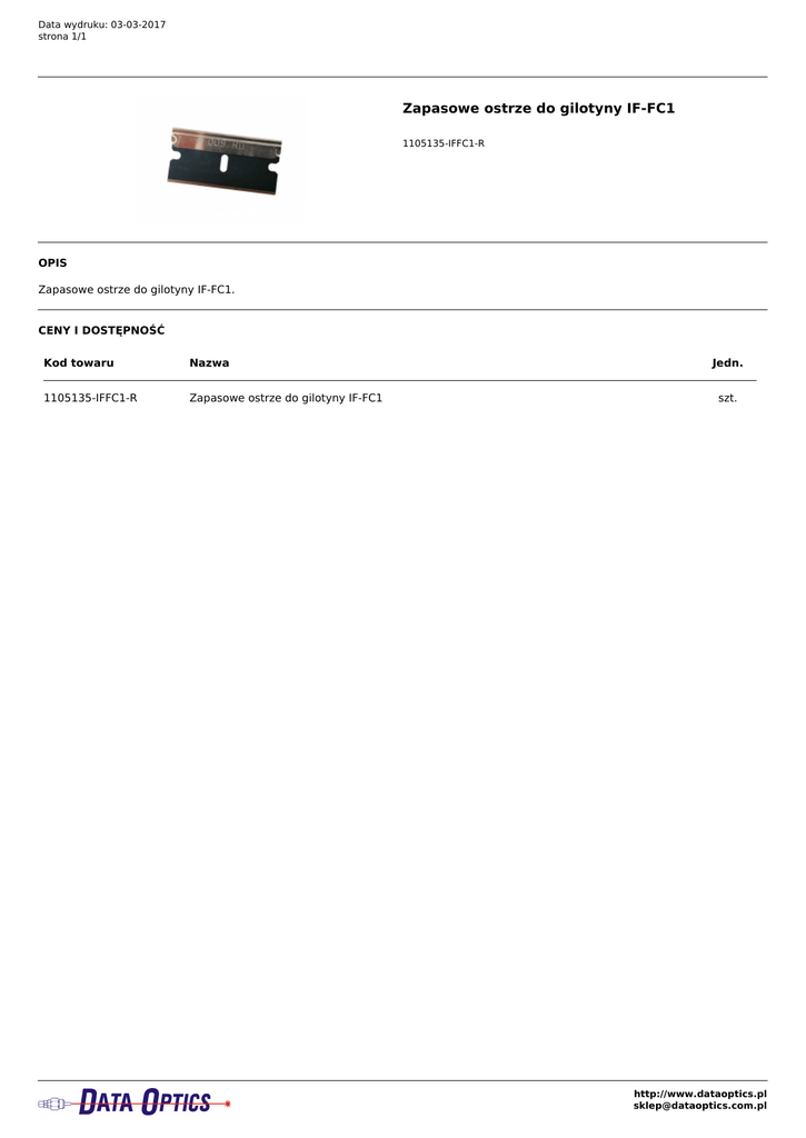 Data wydruku: 03-03-2017 strona 1/1 Zapasowe ostrze do gilotyny IF-FC1 1105135-IFFC1-R OPIS Zapasowe ostrze do gilotyny IF-FC1. CENY I DOSTĘPNOŚĆ Kod towaru Nazwa 1105135-IFFC1-R Zapasowe ostrze do gilotyny IF-FC1 Jedn. szt. http://www.dataoptics.pl [email protected] Powered by TCPDF (www.tcpdf.org)