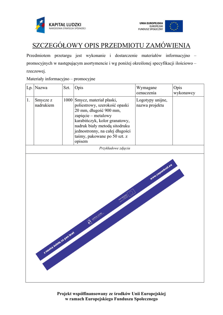 SZCZEGÓŁOWY OPIS PRZEDMIOTU ZAMÓWIENIA Przedmiotem przetargu jest wykonanie i dostarczenie materiałów informacyjno – promocyjnych w następującym asortymencie i wg poniżej określonej specyfikacji ilościowo – rzeczowej. Materiały informacyjno – promocyjne Lp. Nazwa Szt. Opis Wymagane oznaczenia 1. 1000 Smycz, materiał płaski, poliestrowy, szerokość opaski 20 mm, długość 900 mm, zapięcie – metalowy karabińczyk, kolor granatowy, nadruk biały metodą sitodruku jednostronny, na całej długości taśmy, pakowane po 50 szt. z opisem Logotypy unijne, nazwa projektu Smycze z nadrukiem Przykładowe zdjęcia Projekt współfinansowany ze środków Unii Europejskiej w ramach Europejskiego Funduszu Społecznego Opis wykonawcy 2. Czapki z nadrukiem 800 Czapka z daszkiem 5 panelowa, Logotypy unijne i wykonana z bawełny 100% o logo projektu gramaturze 170 g/m z regulowanym paskiem, zapinanym na rzep, z obszywanymi wywietrznikami. Kolor beżowy. Trzy logotypy w pełnym kolorze, rozmieszczone w 3 miejscach: na panelu przednim logo projektu i 2 panelach bocznych po przeciwnych stronach – logotypy unijne. Znaczenia na czapce wykonane termonadrukiem. Przykładowe zdjęcia 3. Naramienna torba z nadrukiem 800 Naramienna torba wykonana z wytrzymałego poliestru. Posiada główną kieszeń, przegródkę na telefon komórkowy i dwie kieszonki z zamkiem, jednokolorowa; rozmiar: 47 x 33 x 17 cm (+/-1cm) powierzchnia nadruku 10 x 6,5 cm; nadruk w pełnym kolorze wykonany metodą termonadruku. Kolory toreb: pomarańczowych: 400 szt; niebieskich: 400 szt. Logo projektu, logotypy unijne, nazwa projektu, zapis o współfinansowaniu projektu. Przykładowe zdjęcia Projekt współfinansowany ze środków Unii Europejskiej w ramach Europejskiego Funduszu Społecznego Wielkość nadruku 100 x 65 mm (bez pomarańczowego tła) 4. Pendrive 100 Pojemność: 4GB - USB 2.0 kompatybilne z USB 1.1 - Obudowa plastikowo-aluminiowa - Hot plug and play - System operacyjny: WindowsNT/ME/2000/XP/VISTA - Gwarancja 1 rok - kolor: srebrny Rodzaj nadruku: tampodruk po obu stronach, jednokolorowy niebieski Wielkość produktu: 6,8 x 1,8 cm (+/-0,2cm) Powierzchnia zadruku: 4 x 1,2 cm Pakowany pojedynczo Logotypy unijne, tytuł projektu, adres strony internetowej Przykładowe zdjęcia Projekt współfinansowany ze środków Unii Europejskiej w ramach Europejskiego Funduszu Społecznego 5. 6. Pieczątka okrągła Kronika 2 Okrągła pieczątka automatyczna, samotuszująca o średnicy 30 mm, kolor obudowy czerwony, kolor tuszu czerwony. 1 Oprawa skórzana (kolor pomarańczowy), ręczne szycie, prawdziwe zwięzy na grzbiecie, kapitałki szyte ręcznie, tłoczenie logotypów na okładce przedniej, stylizowane krawędzi kart Format 36 x 26 cm., (+/-2cm) układ poziomy, 250 kart. papier ozdobny 120g/m2 - skóra licowa - wyklejka z papieru ozdobnego W polu odbicia logo projektu. Logotypy unijne, logo projektu, nazwa projektu, adres strony www. zapanbrat.eu, informacja o współfinansowaniu projektu Przykładowe zdjęcia 7. Kalkulator 1000 Przezroczysty kalkulator na baterię słoneczną, 8 cyfrowy, wykonany z plastiku; rozmiar: 11,9 (+/-0,5 cm) x 8,1 (+/-0,5cm) x Logotypy unijne, logo projektu i adres strony Projekt współfinansowany ze środków Unii Europejskiej w ramach Europejskiego Funduszu Społecznego 0,5 cm; nadruk w pełnym kolorze, wykonany techniką tampodruku o wymiarach: 50 x 20 mm, gwarancja 1 rok. Kolor pomarańczowy. internetowej Przykładowe zdjęcia 8. Długopisy z nadrukiem 1000 Długopis plastikowy, z metalowym klipem, uchwytem gumowym (w kolorze granatowym), wciskany, z wkładem niebieskim wymiennym, kolor biały, powierzchnia polerowana, nadruk metodą sitodruku po obu stronach długopisu (kolor niebieski) pakowane po 50 sztuk z opisem Logotypy unijne, nazwa projektu, adres strony internetowej Przykładowe zdjęcia Projekt współfinansowany ze środków Unii Europejskiej w ramach Europejskiego Funduszu Społecznego 9. Baner reklamowy typu Rollup 3 Zwijany do aluminiowej kasety, na stojaku (do rozciągania) z pokrowcem. Wydruk na materiale trwałym, odpornym na promienie UV i wodę, wymiar 80 x 200 cm. Wym. kasety 10 x 10 x 85cm. Liczba kolorów na nadruku fullkolor. Gwarancja 12 miesięcy Logotypy unijne, logo projektu, nazwa projektu, adres strony internetowej informacja o współfinansowaniu projektu. Przykładowy projekt graficzny 10. Teczki z nadrukiem 150 Teczka tekturowa na dokumenty, format A4, zamykana na gumkę, jednostronnie barwiona i powlekana, trzy zakładki chroniące dokumenty przed wypadaniem, pakowane po 50 szt. z opisem Logo PO KL, logo UE, logo projektu, nazwa projekt, informacja o współfinansowaniu projektu Przykładowy projekt graficzny Projekt współfinansowany ze środków Unii Europejskiej w ramach Europejskiego Funduszu Społecznego 11. Ulotka 12. Plakat 200 Format A4 (297 x 210 mm) składana na trzy części, papier kreda matowa 150g/m2, obustronnie zadrukowana, lakierowane UV, nadruk 4+4, falcowanie ulotki na trzy części, pakowane po 100 sztuk z opisem 100 Format A2 (549 x 420 mm) papier kredowy, mat. jednostronnie lakierowany, gramatura 130g/m2, nadruk 4+0, pakowane po 25 szt. z opisem Logotypy unijne, logo projektu, nazwa projektu, adres strony internetowej, informacja o współfinansowaniu projektu treść: informacje dotyczące projektu, podane przez zamawiającego Logo PO KL, logo UE, logo projektu, nazwa projektu, adres strony internetowej, informacja o współfinansowaniu projektu treść: informacje dotyczące projektu podane przez Projekt współfinansowany ze środków Unii Europejskiej w ramach Europejskiego Funduszu Społecznego zamawiającego Przykładowy projekt graficzny 13. Długopis w etui. 100 Zestaw piśmienniczy w kartonowym ozdobnym pudełku, w skład zestawu wchodzi: metalowy długopis wymiary: 17,2 x 6,2 x 2,5 cm, kolorystyka pudełka: czarny, kolorystyka długopisu: czarny z błyszczącymi lakierowanymi wykończeniami. Nadruk jednokolorowy (