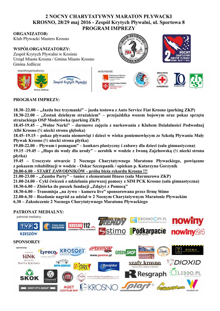 2 NOCNY CHARYTATYWNY MARATON PŁYWACKI KROSNO, 28/29 maj 2016 - Zespół Krytych Pływalni, ul. Sportowa 8 PROGRAM IMPREZY ORGANIZATOR: Klub Pływacki Masters Krosno WSPÓŁORGANIZATORZY: Zespół Krytych Pływalni w Krośnie Urząd Miasta Krosna / Gmina Miasto Krosno Gmina Jedlicze PROGRAM IMPREZY: 18.30–22.00 – „Jazda bez trzymanki” – jazda testowa z Auto Service Fiat Krosno (parking ZKP) 18.30-22.00 – „Zostań dzielnym strażakiem” – przejażdżka wozem bojowym oraz pokaz sprzętu strażackiego OSP Moderówka (parking ZKP) 18.45-19.45 – „Wolne Nurki” – darmowe zajęcia z nurkowania z Klubem Działalności Podwodnej Albi Krosno (½ niecki strona głęboka) 18.45–19.15 – pokaz pływania niemowląt i dzieci w wieku poniemowlęcym ze Szkołą Pływania Mały Pływak Krosno (½ niecki strona płytka) 19.00-22.00 – Pływam i pomagam” – konkurs plastyczny i zabawy dla dzieci (sala gimnastyczna) 19.15 -19.45 – „Hops do wody dla urody” – aerobik w wodzie z Iwoną Zajchowską (½ niecki strona płytka) 19.45 – Uroczyste otwarcie 2 Nocnego Charytatywnego Maratonu Pływackiego, powiązane z pokazem rehabilitacji w wodzie - Oskar Szczepanik / opiekun p. Katarzyna Gorzynik 20.00-6.00 – START ZAWODNIKÓW - próba bicia rekordu Krosna !!! 21.00-23.00 – „Zumba Party” – taniec z elementami fitness (sala Marmurowa ZKP) 21.00-24.00 – Cykl ćwiczeń z udzielania pierwszej pomocy z SIM PCK Krosno (sala gimnastyczna) 18.30-6.00 – Zbiórka do puszek fundacji „Zdążyć z Pomocą” 18.30-6.00 – Transmisja „na żywo – kamera live” sponsorowana przez firmę Stimo 22.00-6.30 – Rozdanie nagród za udział w 2 Nocnym Charytatywnym Maratonie Pływackim 6.30 – Zakończenie 2 Nocnego Charytatywnego Maratonu Pływackiego PATRONAT MEDIALNY: SPONSORZY